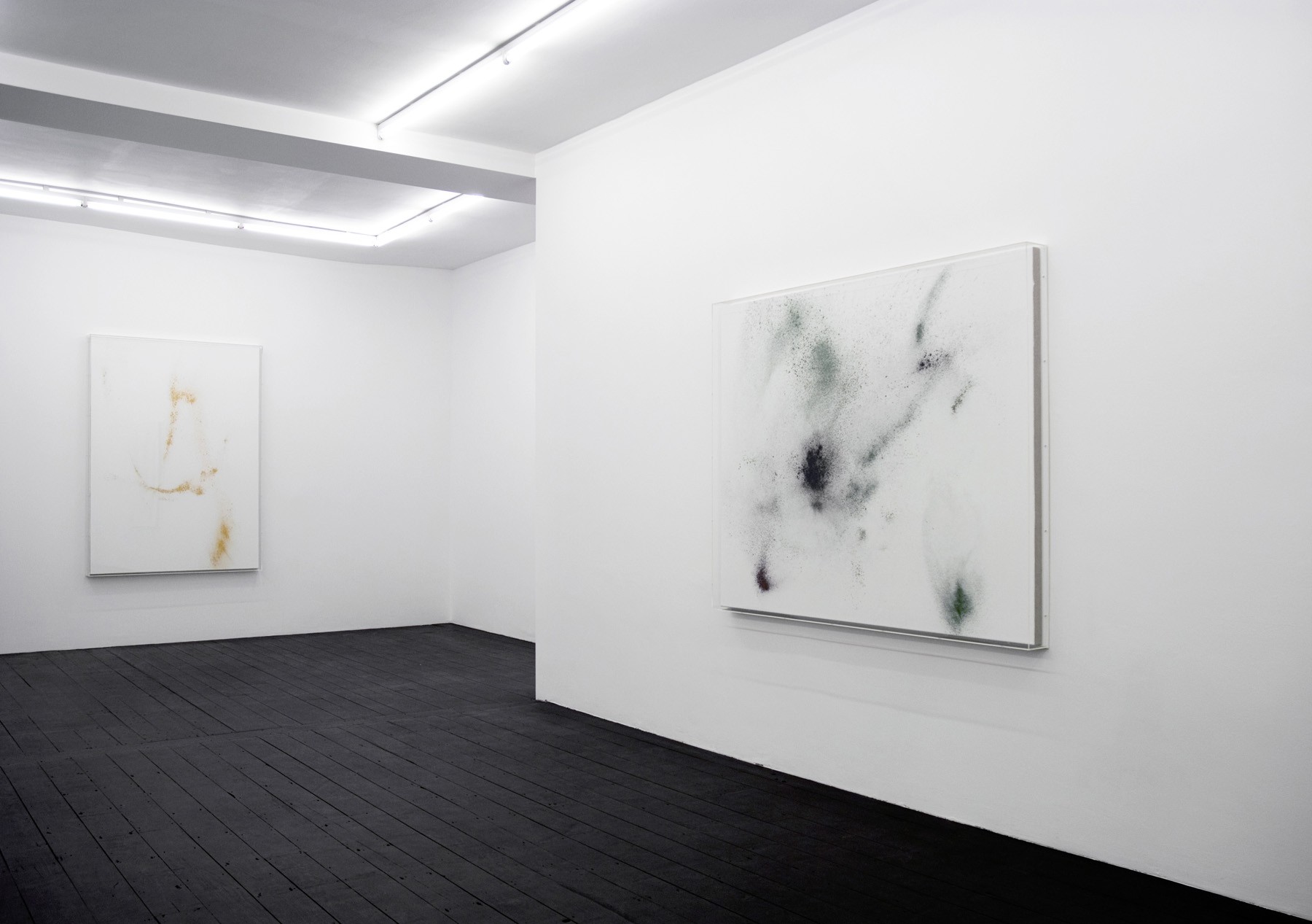paintings’ traditional values and messing with the instantaneous transmission of those values that go hand in hand with them. Low grade or poor materials offer the artist a relatively straightforward line of defence against those values, a strategy of resistance analogous with bad painting. Heinzmann’s palette of materials, however, is of a higher register. Listing some of them here will give an idea of their tenor: feathers, papyrus, horse and cow skins, marble lacquers, crystals and minerals, molten lead, molten tin, pure pigment. These are distinctively multivalent materials, replete with historical, metaphorical, poetic, and utilitarian values.