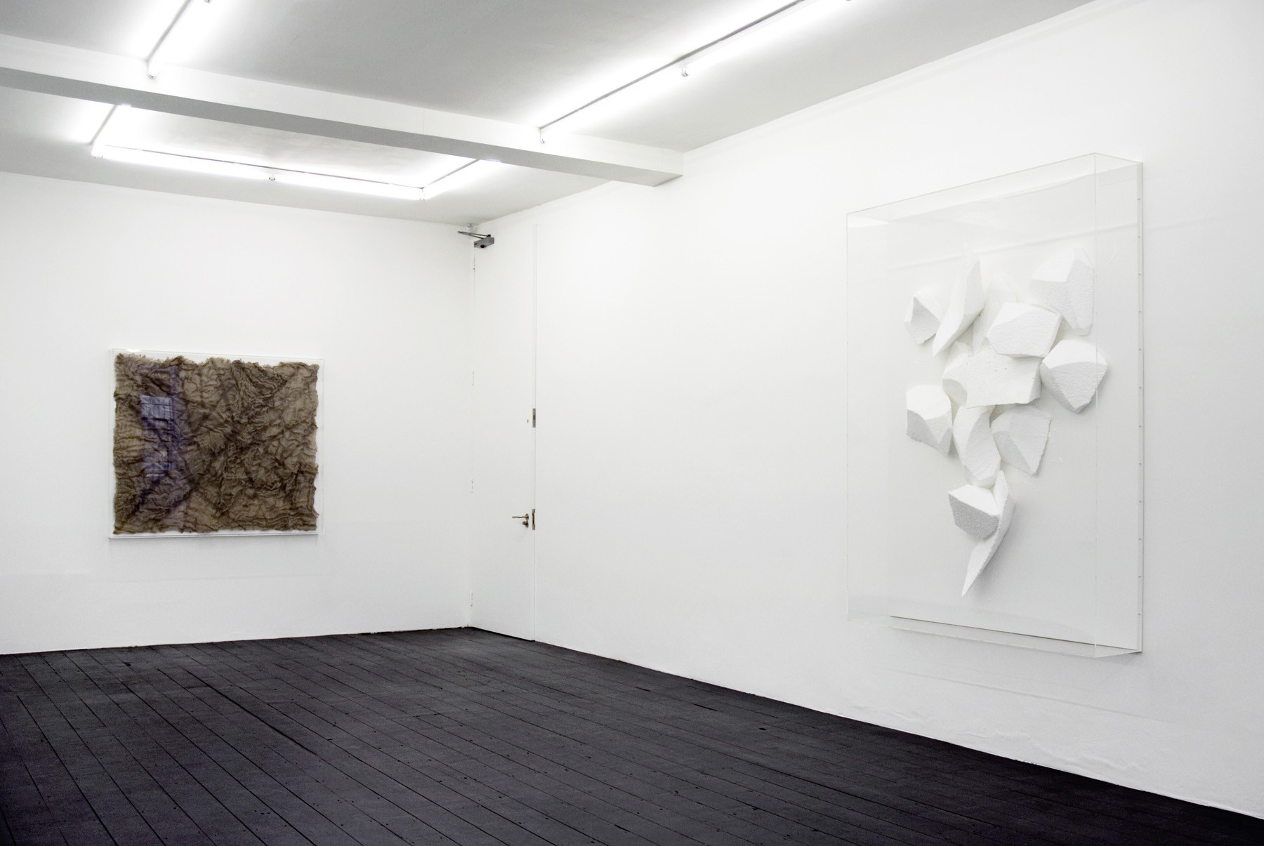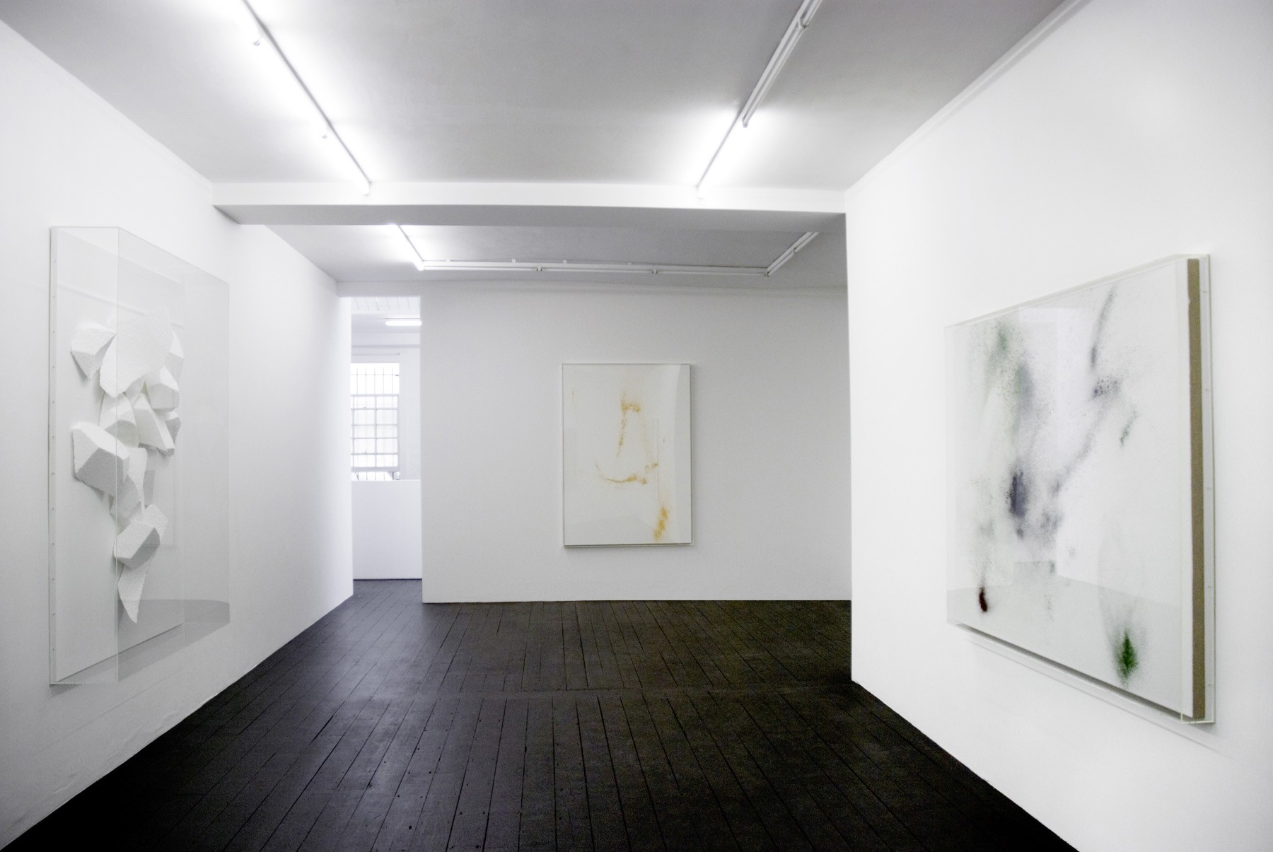 The materials discussed so far are at the baser end of Heinzmann’s range of materials: they are cool, industrial and relatively inert. The incorporation of crystals, poured metals, feathers, and animal skins, stands in stark contrast, taking us into a realm of the symbolic, the mystical, the poetic and possibly even the alchemical. You could imagine this would be too much with the work ‘overheating’, but Heinzmann handles his materials with typical restraint. D.C.I.B.I.T (2007) is a good illustration of this. It is a large, squarish white aluminium panel. A flat area of animal hide covering about a third of the top half of the panel, and below it, sitting on the surface is a lump of whitish crystal. There is very little manipulation of the materials - they are presented in a more or less de facto way. A couple of compositional decisions have been made, but not much else. The title is cryptic. The description of media matter-of-fact: ‘fur and crystal on aluminium’. It’s strange because it seems like it shouldn’t really work.