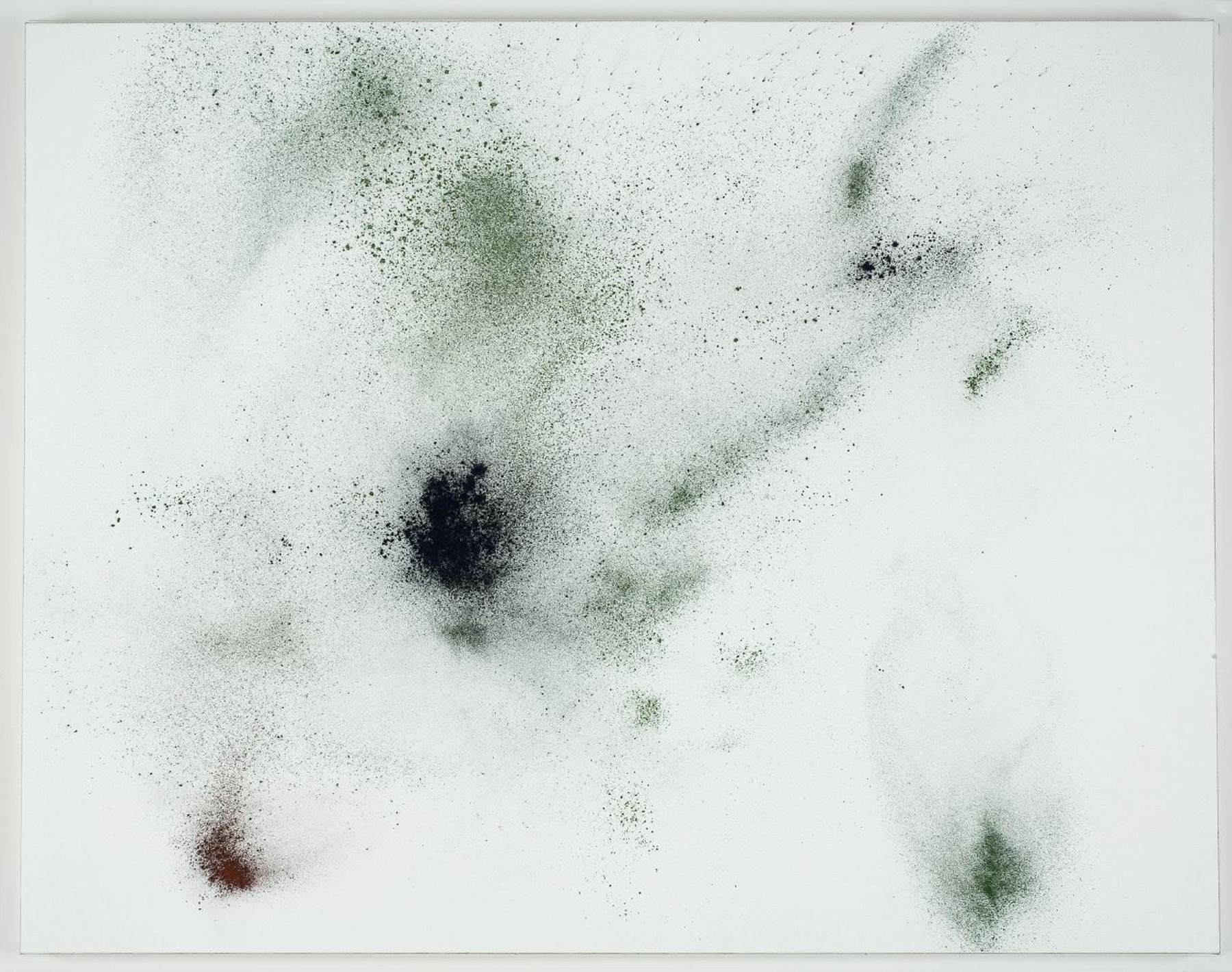 The support and ground of Untitled (1999) is a rectangle of tiled, thick sheets of expanded polystyrene foam. The painted surface is black pigments mixed with epoxy resin. It has been applied with a combination of a few sparing brush marks, some controlled pours, and a few drops and drips. Some of the pigment and resin soaks in, but most has been applied thick enough to pool and in some places run in rivulets on the surface. The marks run vertically and horizontally, but this modular structure is balanced, and almost over-ridden, by freer forces. Heinzmann has allowed chance to enter the work, but the overall impression is of restraint, control and delicacy even. The support and ground of N.-I.A.N.Y.P.(2000) has been similarly constructed and the painting too has a grid-like structure. This is more of an all-over composition and a finer network of lines. The palette is expanded to include a spectrum of many blueygreens. There is some sense of accident having its role to play, but control mixed with restraint is the painting’s defining quality.