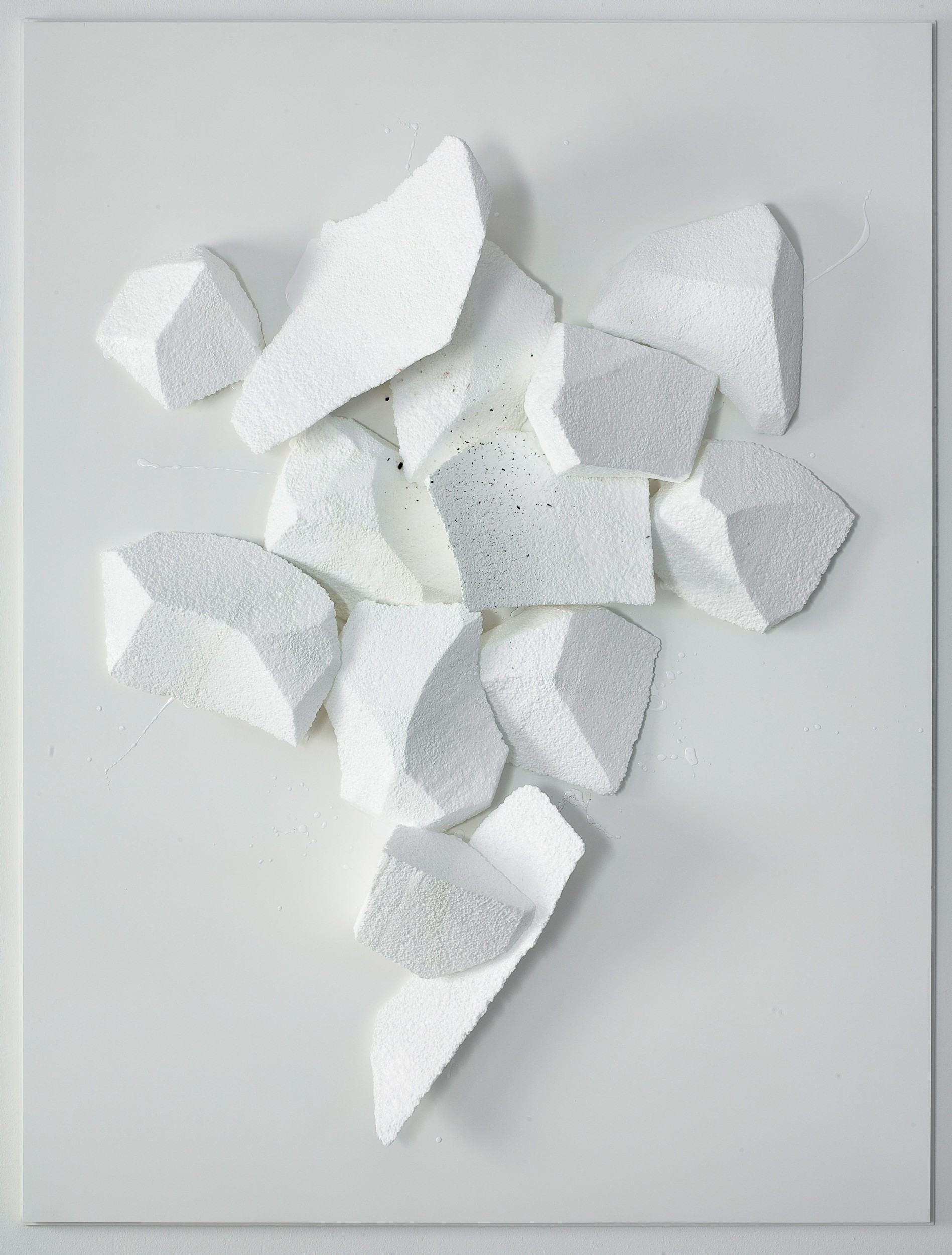 One material Heinzmann repeatedly uses - as a support, ground, and as figure - is polystyrene foam. This is a material that does have bad or poor connotations. It’s certainly cheap and ubiquitous. Yet in its pure unsullied state – and by this I mean not found, already used, but coming straight from the suppliers – it is alluring stuff. In sheet format it offers a formally neat solution: it can be support and ground in one. It’s more contemporary than canvas, and it could be said it’s one of the defining media of our petrochemical age.