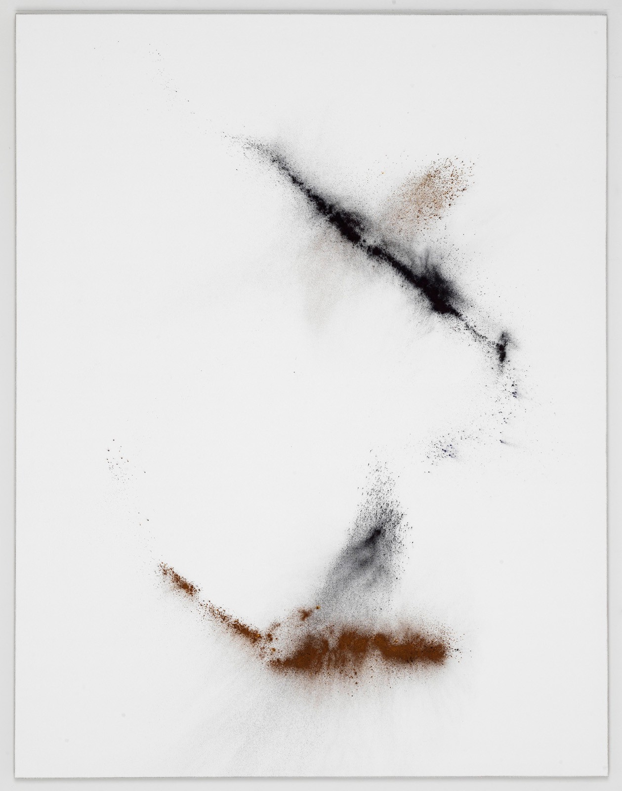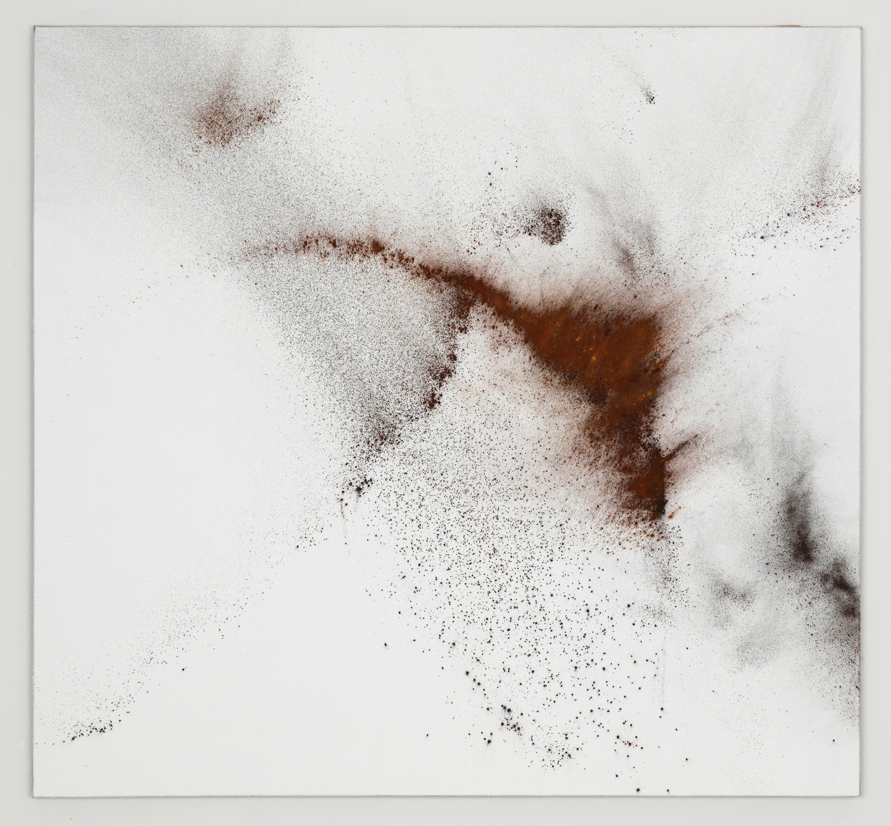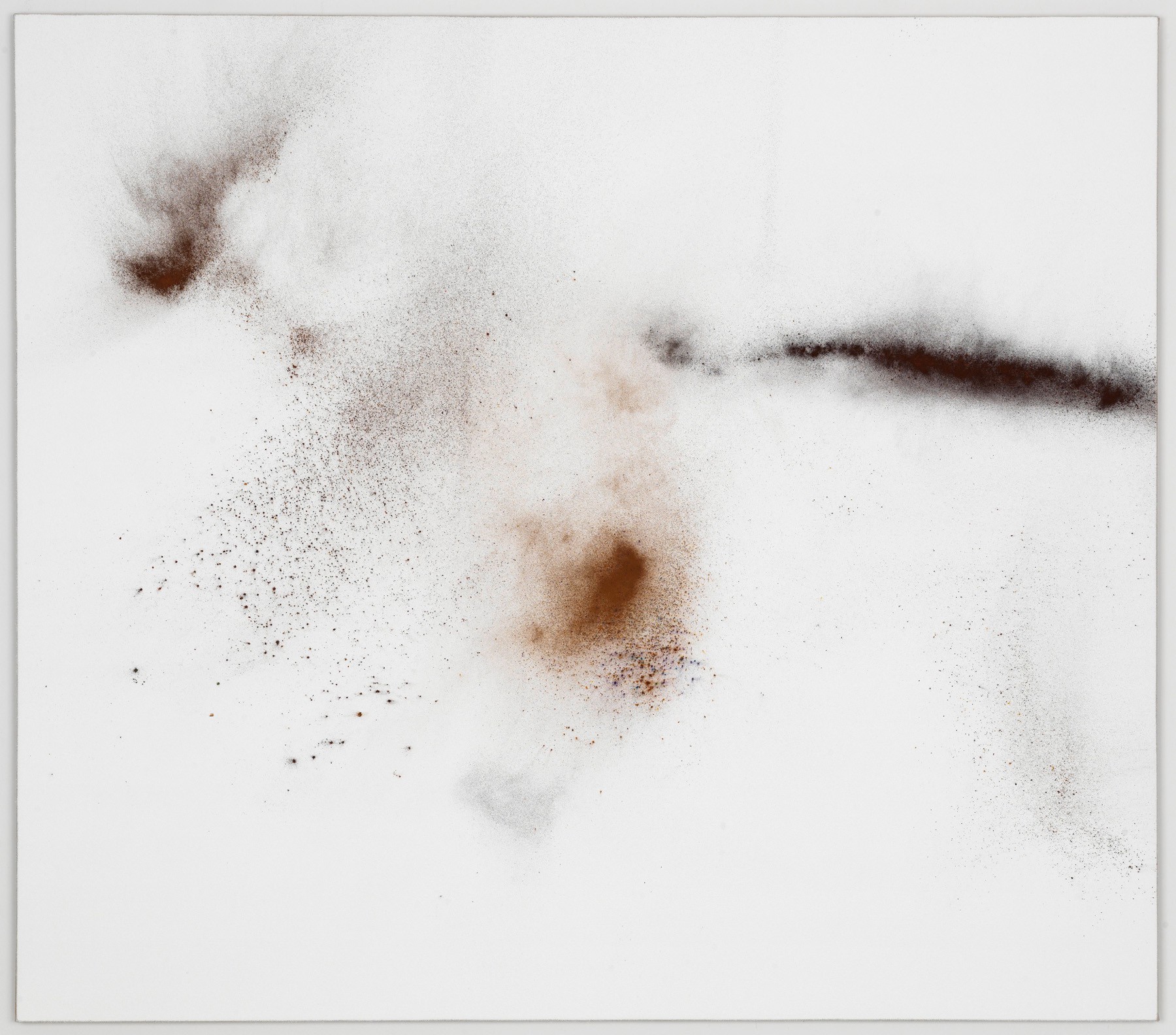 Much of the present work consists of sophisticated cosmological compositions bordering a fine line between pictorial and structural, scientific and artistic, controlled and hazardous. These pieces should be considered an exploration into the true nature and capacity of painting. The pigments delicately express attention to detail in the choice of material, its very essence and pure nature, spreading across the surfaces in varying levels of density. The heart of the explosion, that is to say the areas with a higher concentration of material and pigment, or as Bracewell calls them, the “erogenous zones”, merge at times with nearly empty spaces. It is here that the remnants of movement come to a halt, leaving a trace of what has happened. Varying levels of thickness and an infinite color palette create a silent, unseen eco which transforms into a timeless, amplified aura that floats, majestically charged with poetry. Heinzmann unmistakably uses composition and materials to achieve this as something inherent in the history of painting itself. In addition, he now converts these visual phenomena into tactile realities, where form fades into texture.