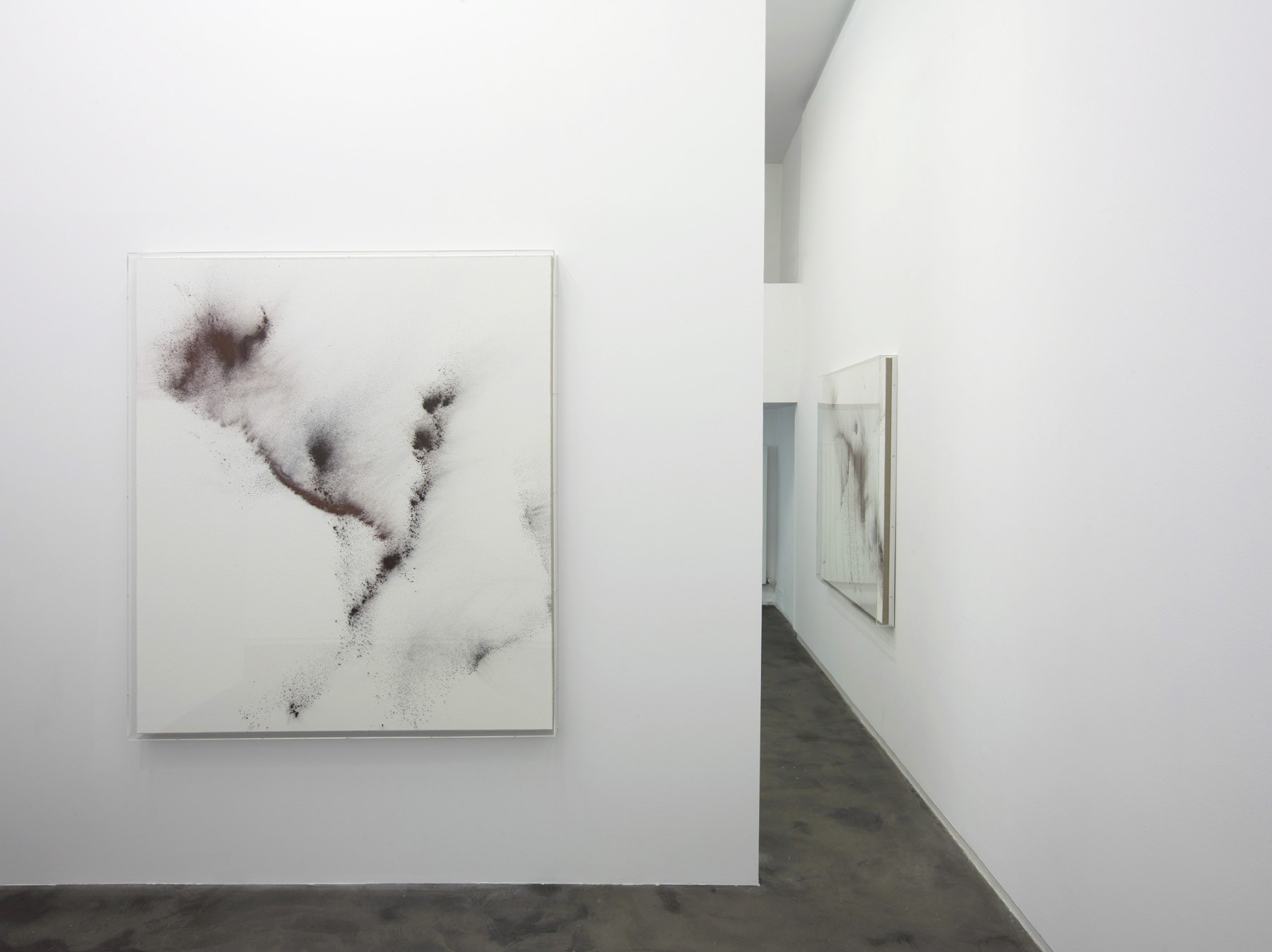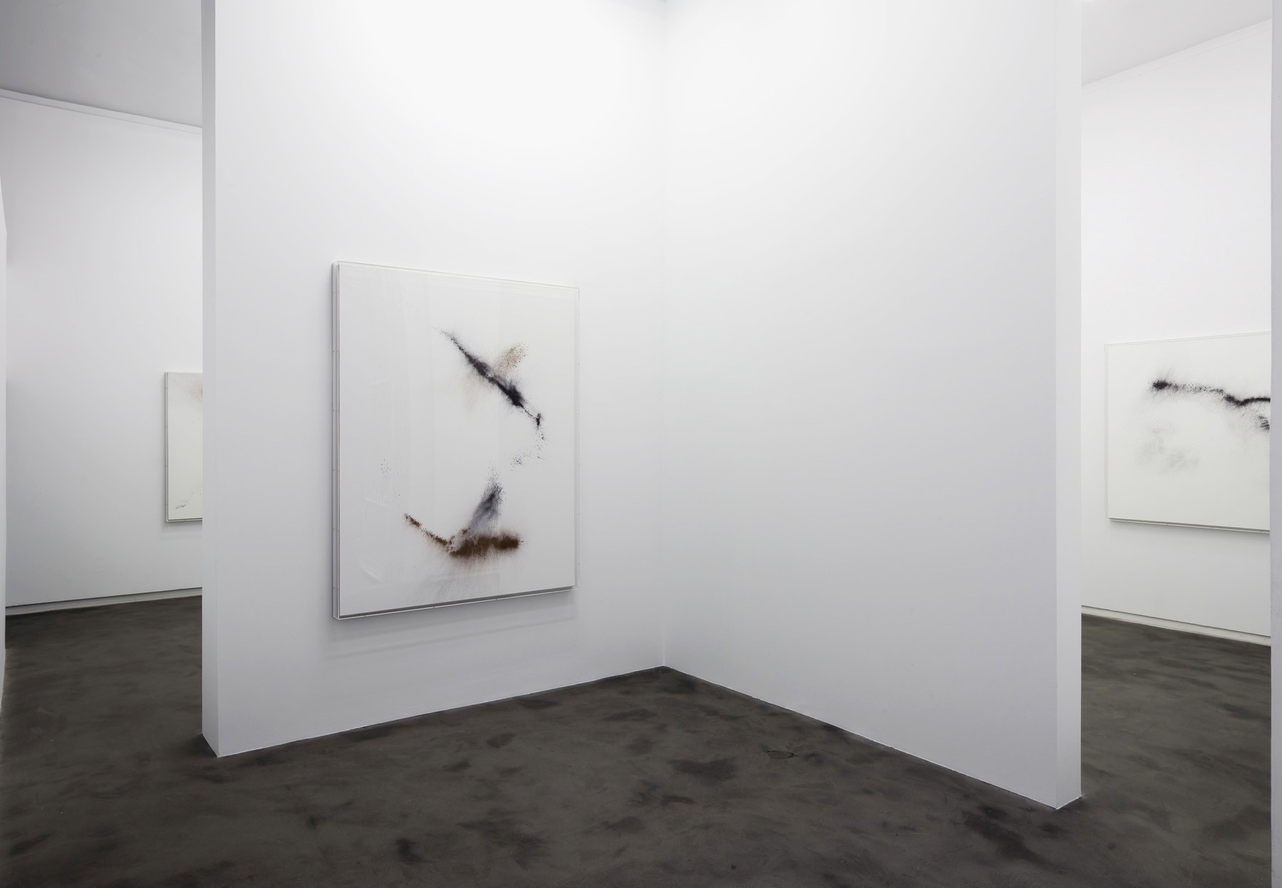 The concept behind this exhibition is a sort of series of tension and balance, here composition and form are not to be interpreted by conventional standards but by principles where emotion and the senses prevail. One of the fundamental spects of Heinzmann’s work is the process by which he produces “…dichotomies between white and black, speed and stillness, diffusion and explosion, resolved by the painting into a trans-sensory relationship between texture and form” as Michael Bracewell states in the artist’s new catalog published by Hatje Cantz. All of these aspects are gracefully presented in the current exhibition. This being said, not everything is as it seems at first glance: black and white become a blurred spectrum of tones that drag the predominating colors towards a wide chromatic variety; unbound pigment is swiftly scattered through sliding and lashing movements over the pristine surfaces of the canvas thereby simultaneously creating suspension and movement; and the visual gives way to the tactile.