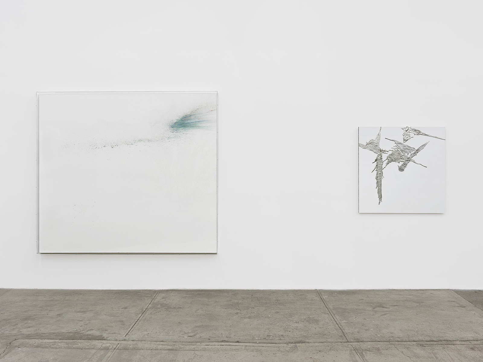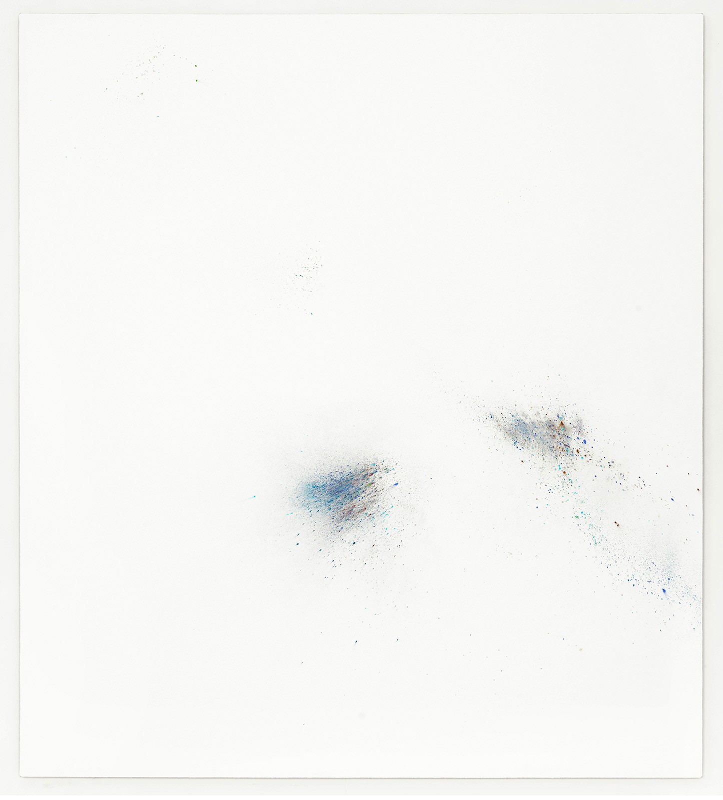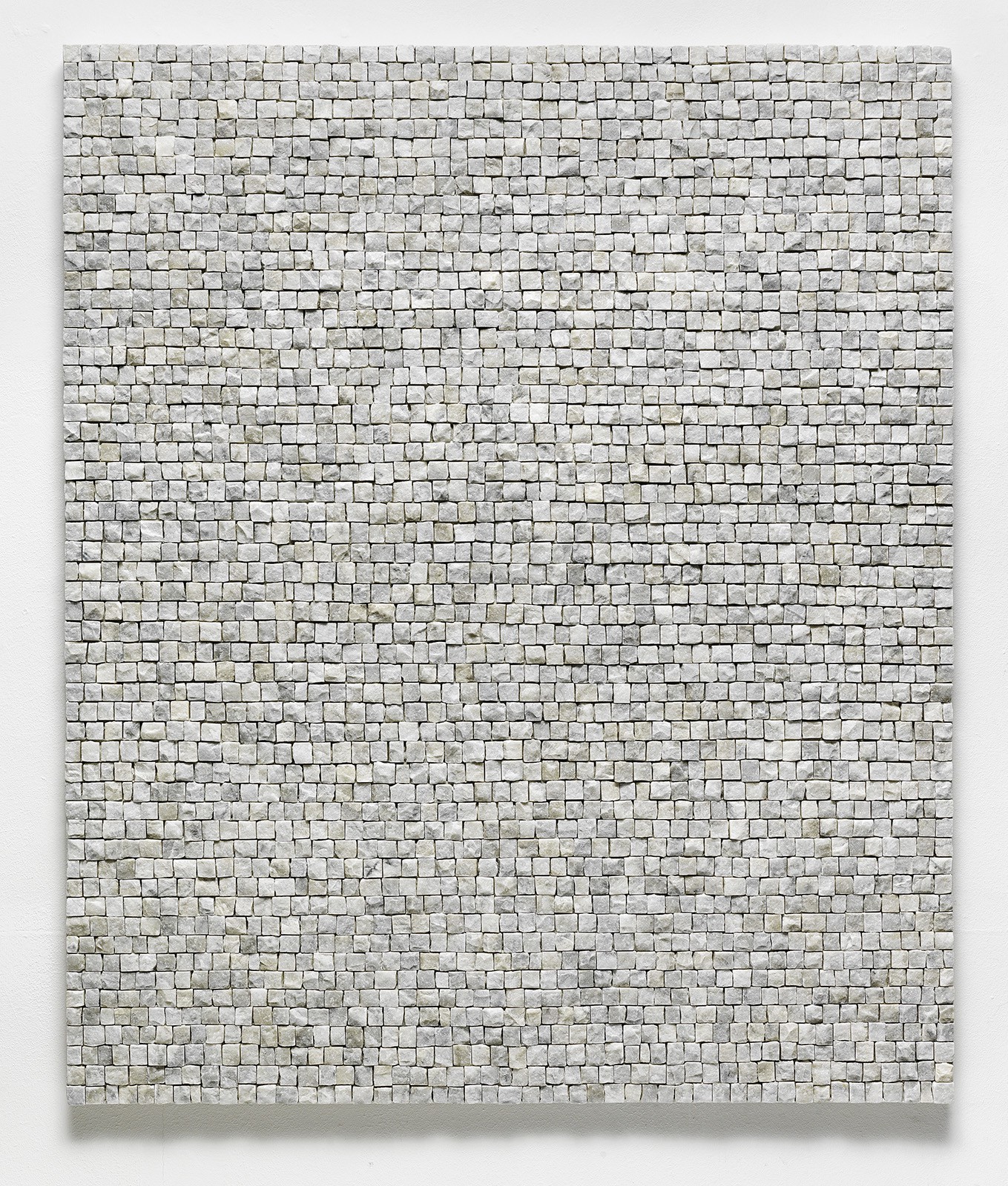 A relief-arrangement of small, irregular marble blocks; hues of powdery pigment; sculpted rags of hessian in flesh-tone dyes; sharply perforated metal surfaces; intricately shaped and then glazed porcelain bodies, reminiscent of forms of nature; cotton fluff; slabs of styrofoam; sprinkled dispenses of oscillating, colored resin that in some places sit on white grounds, oozing effects of liquidity, while in other parts being soaked into the textile on which they have landed, coloring the material from within its very woven structure; the reflective splashes of poured and hardened zinc; and even mere traces of movement left on otherwise minutely worked, matte planes of black, which now achieve the improbable – to catch refractions of light, in their full darkness.
