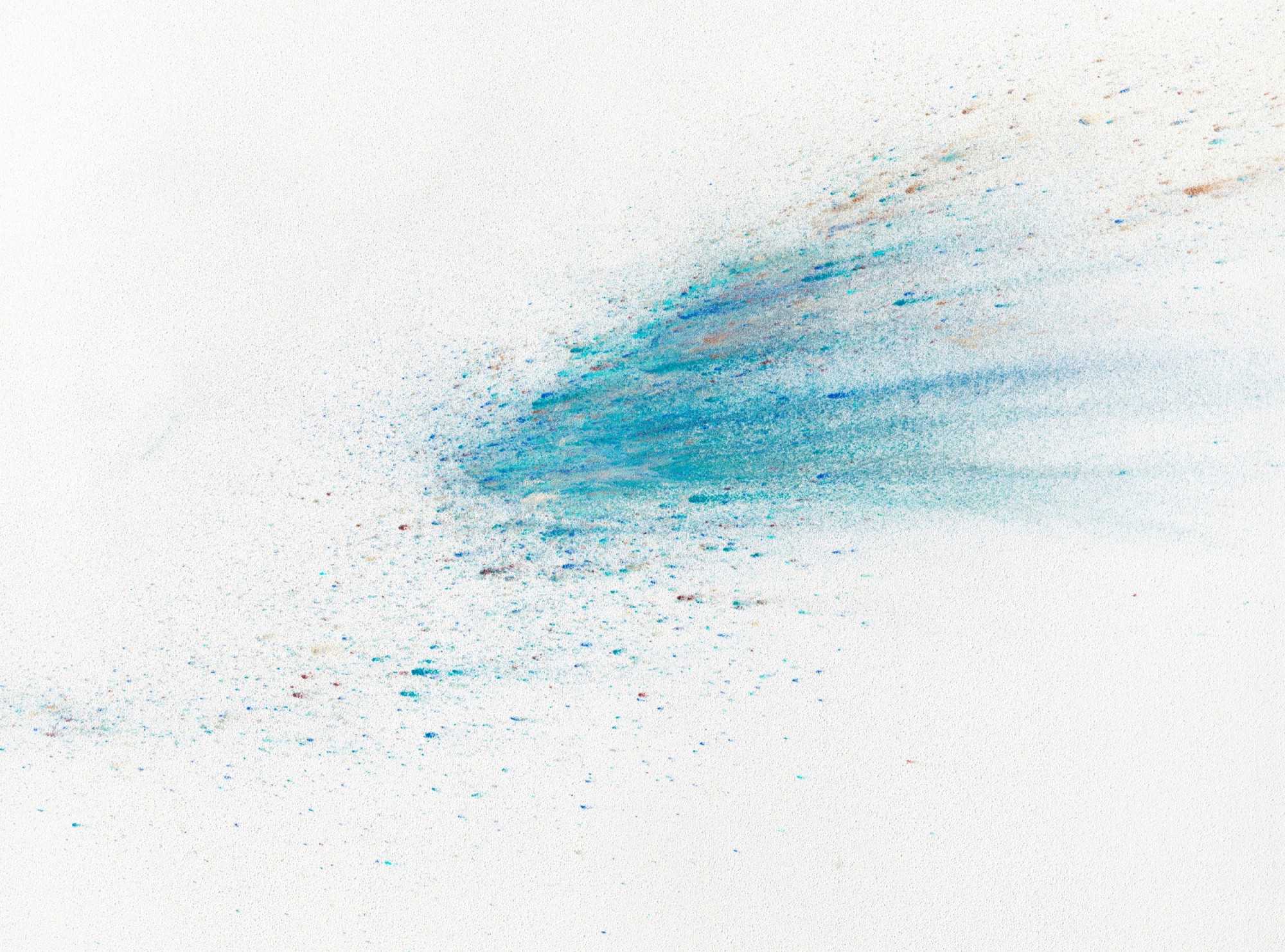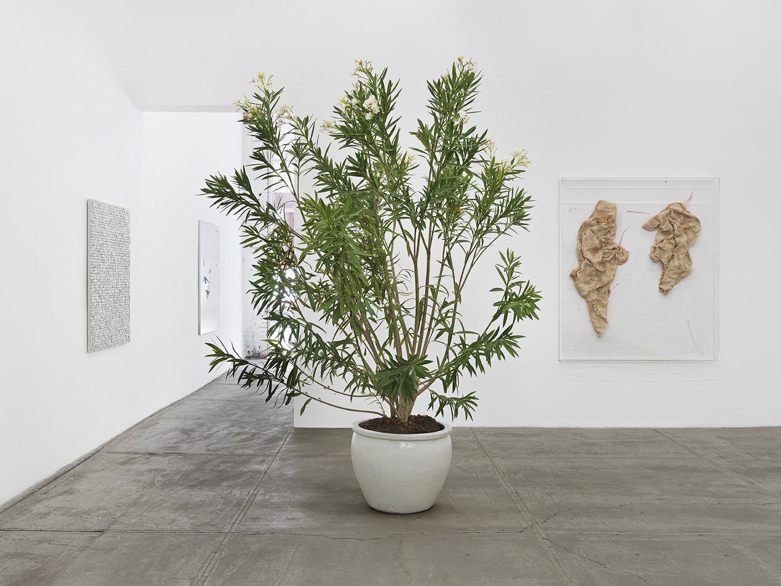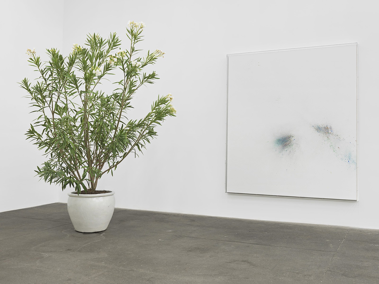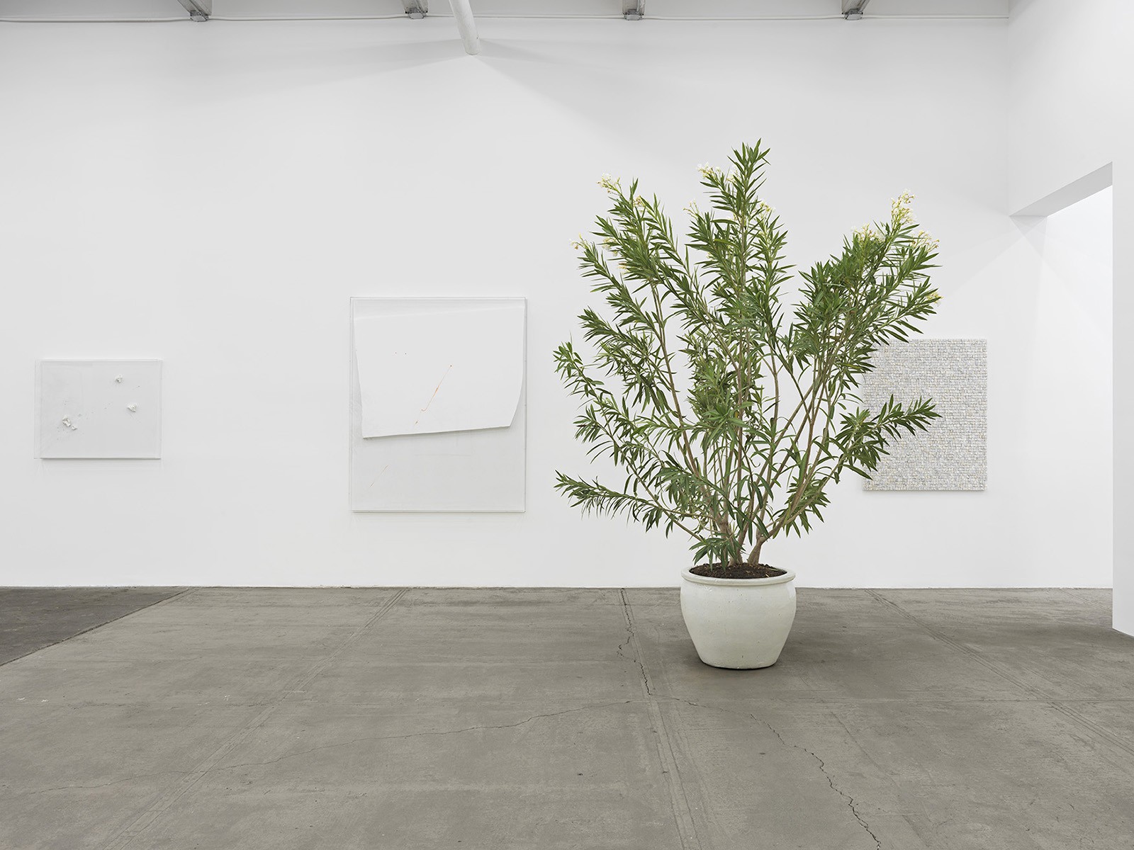A relief-arrangement of small, irregular marble blocks; hues of powdery pigment; sculpted rags of hessian in flesh-tone dyes; sharply perforated metal surfaces; intricately shaped and then glazed porcelain bodies, reminiscent of forms of nature; cotton fluff; slabs of styrofoam; sprinkled dispenses of oscillating, colored resin that in some places sit on white grounds, oozing effects of liquidity, while in other parts being soaked into the textile on which they have landed, coloring the material from within its very woven structure; the reflective splashes of poured and hardened zinc; and even mere traces of movement left on otherwise minutely worked, matte planes of black, which now achieve the improbable – to catch refractions of light, in their full darkness.