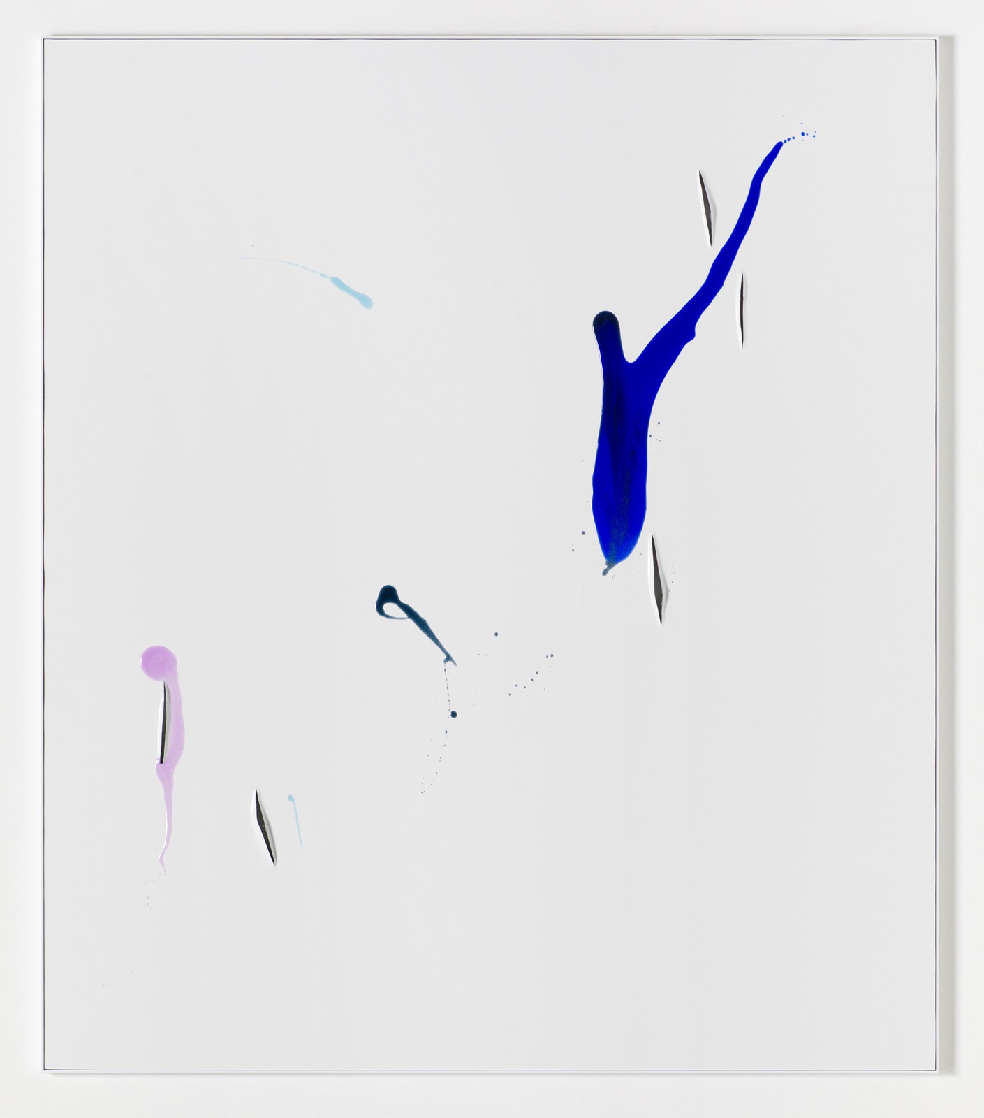 In contrast the Colour Aicmos, in which Heinzmann applies synthetic resins coloured with various pigments to the aluminium, adhere to a different concept: here we encounter luminous streaks of paint on a matt white surface partially run through with cuts, gaps and slits. The compositions seem unforced but never uncontrolled. They play with the imagination of the viewer, who is seduced by their materiality, modernity, directness and beauty.