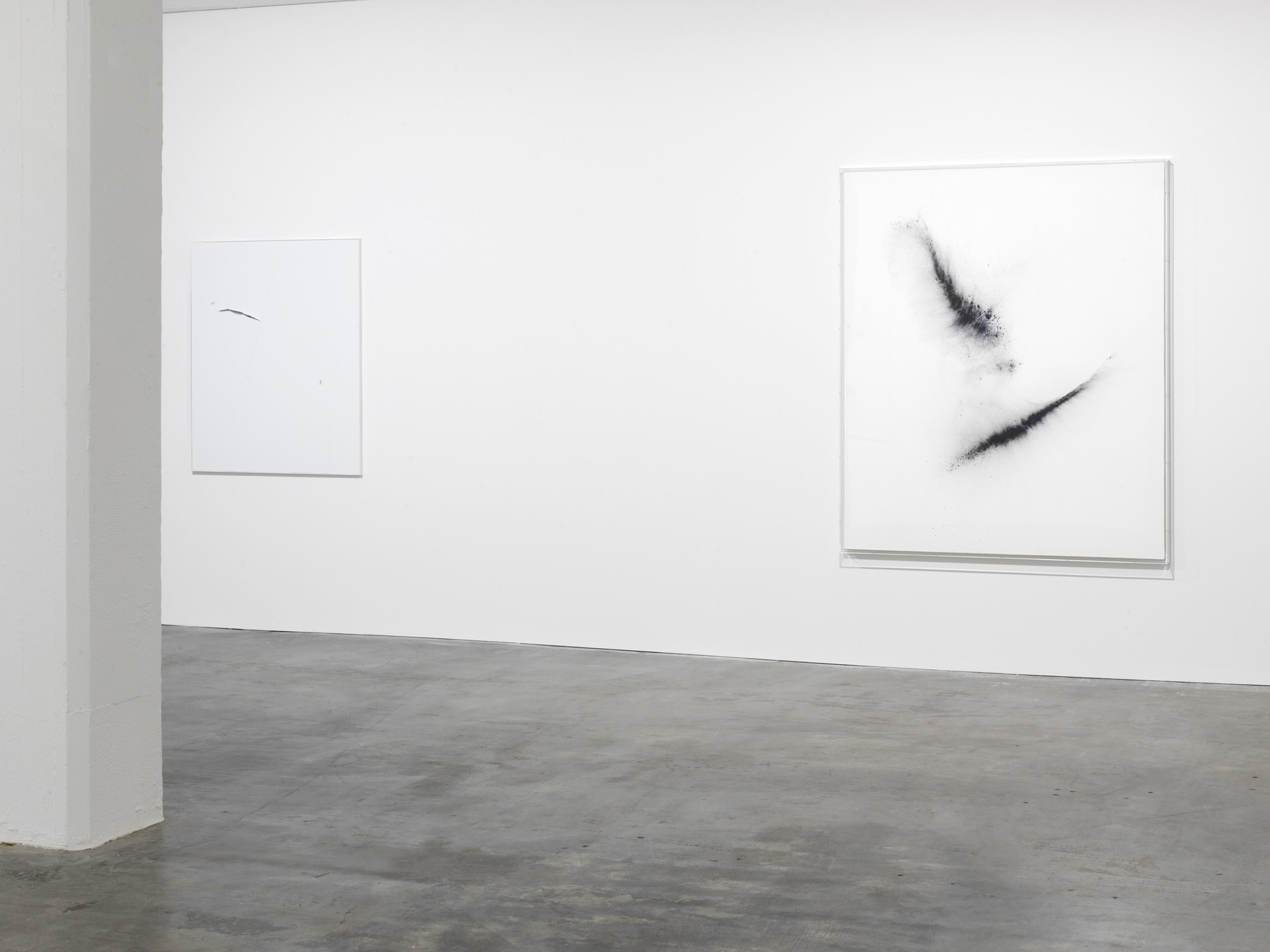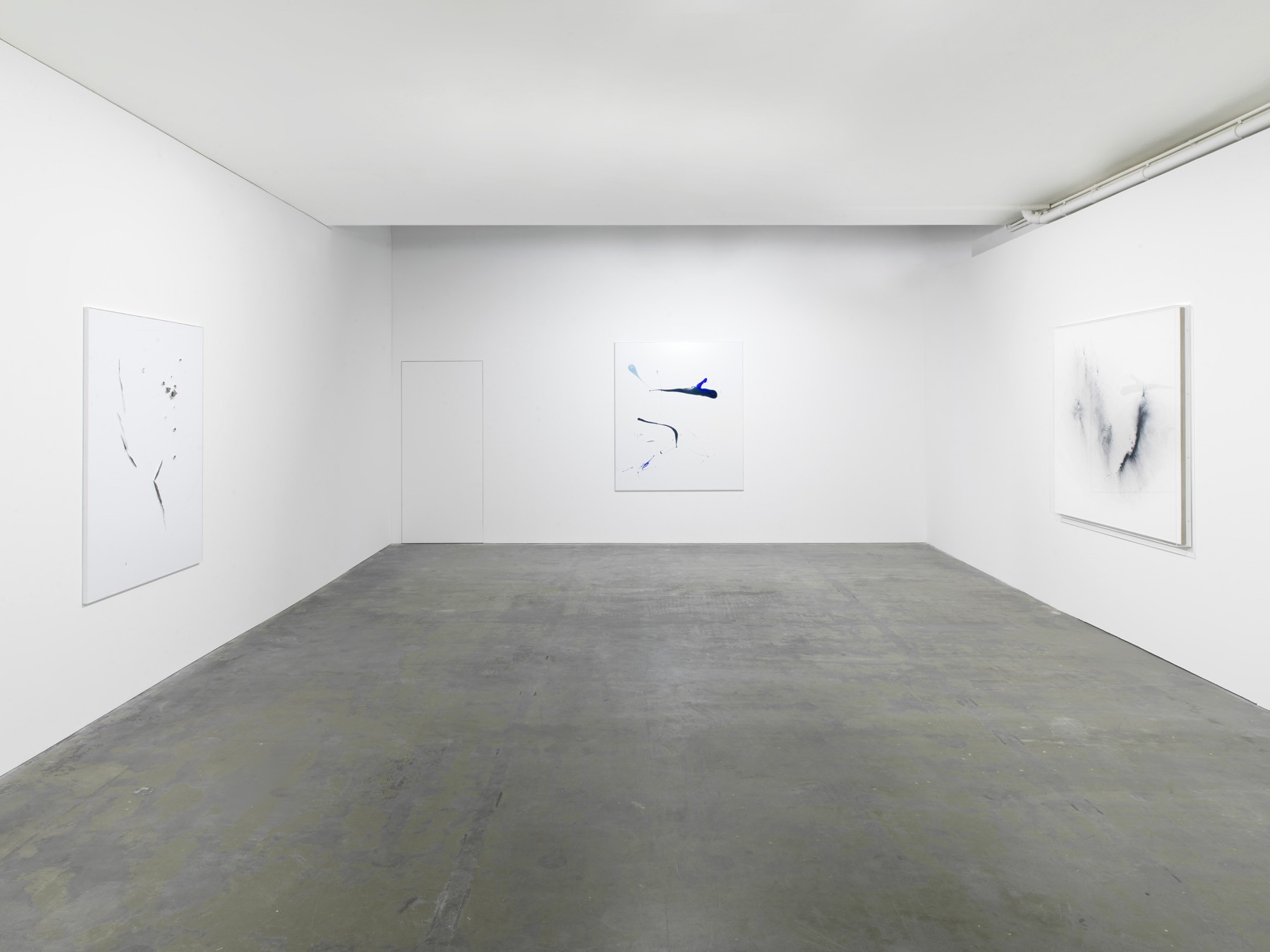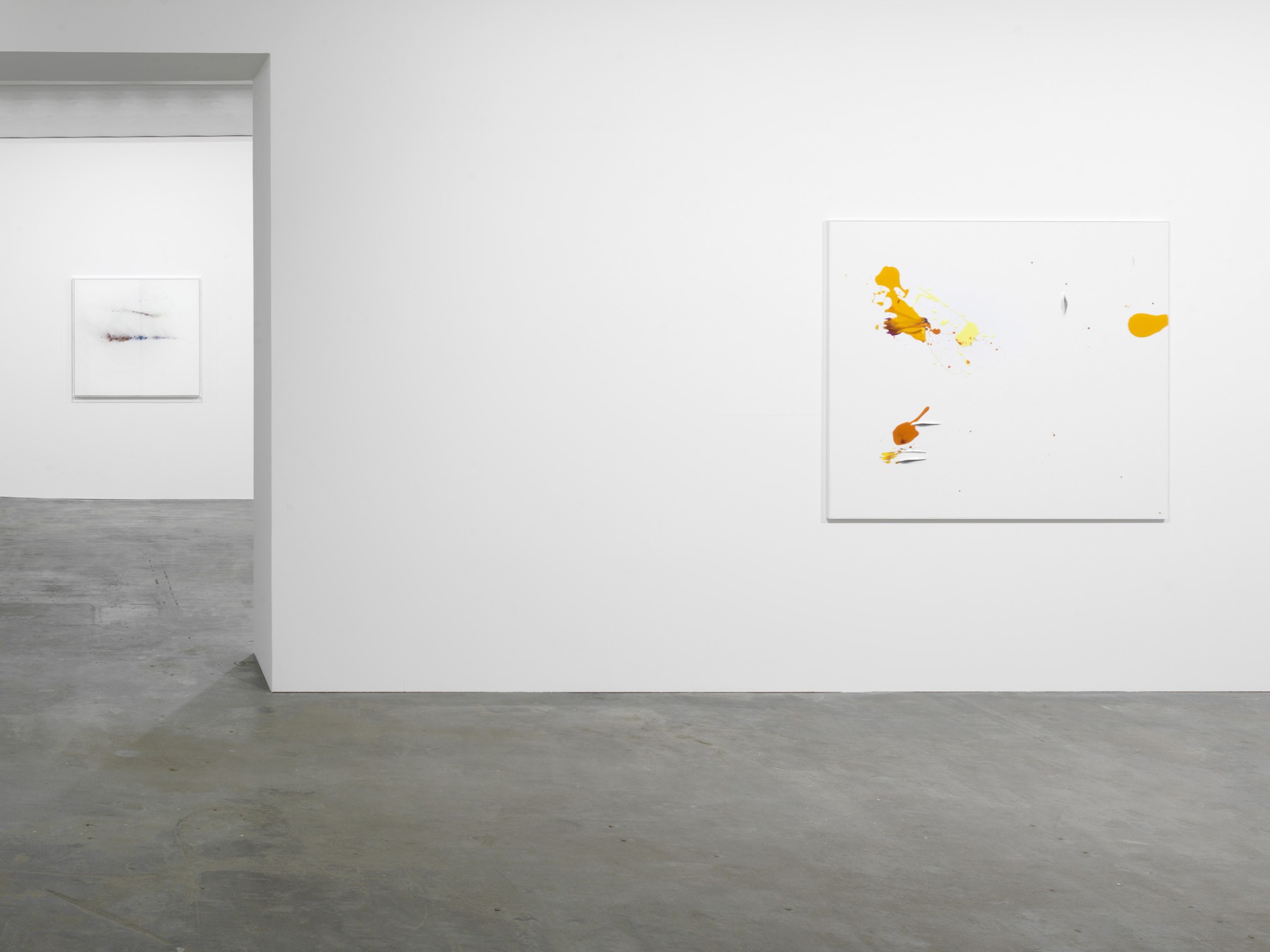 Within the exhibition the Pigmentbilder function as the framework for two further series – both of them on industrially produced, white-laminated aluminium honeycomb panels. These Aicmos and Colour Aicmos show gaps and openings, as in earlier works by Heinzmann. But with the difference that the Aicmos now have cuts of a different kind, including grooves, dents, scratches, gouges and hollows, giving the works a more direct visual language. The way in which time and tempo are inscribed here is not dissimilar in gesture to the painting process that culminated in the Pigmentbilder. Heinzmann succeeds in forcing the living painterly gesture into the artificiality of the industrial image carrier. The astonishing openness of these images is juxtaposed by the decisiveness of their composition. They immediately demand a position from the viewer.