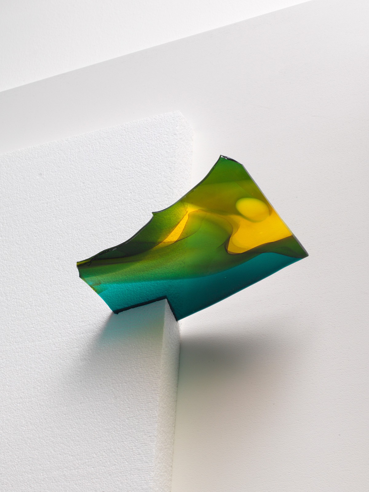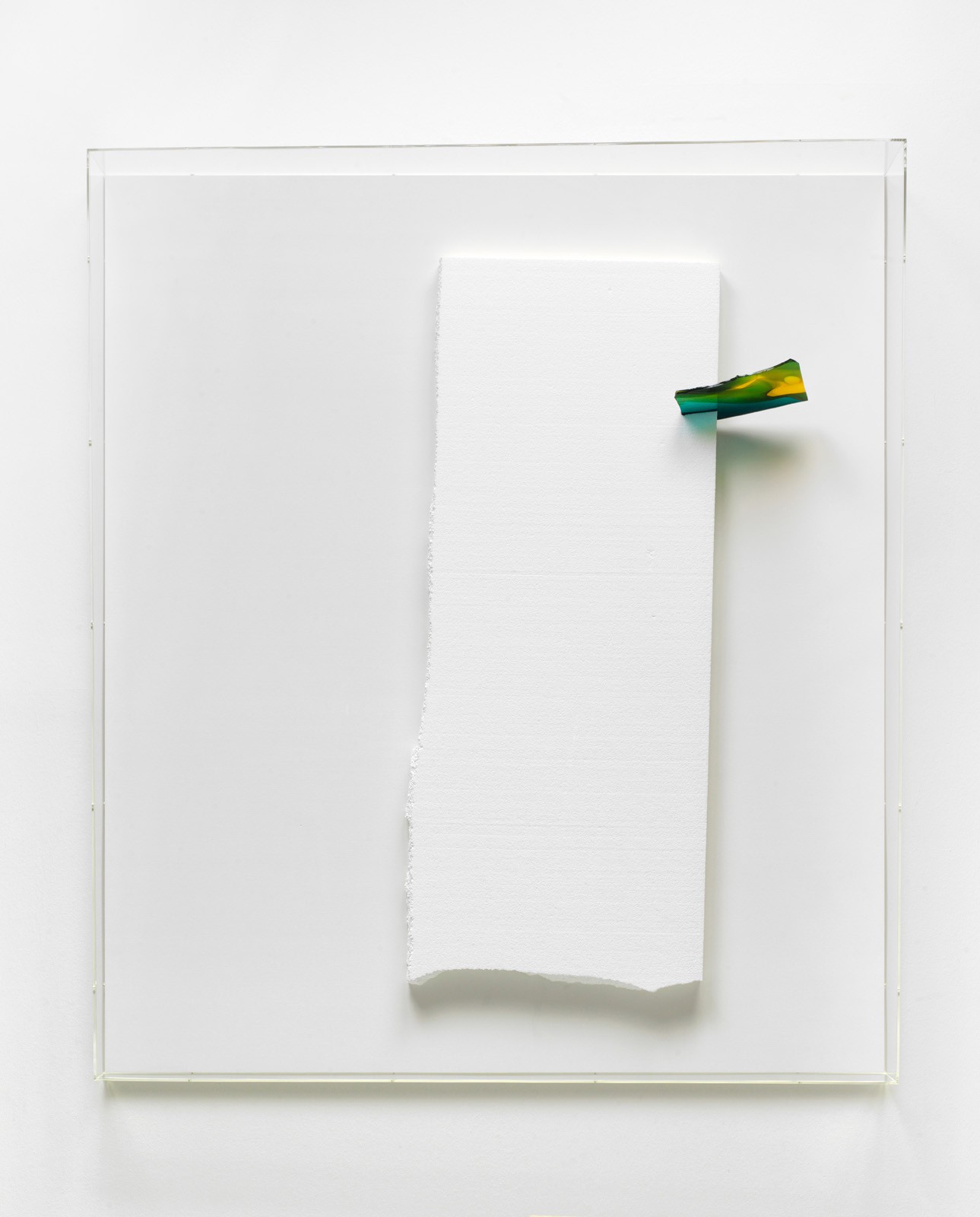 By 2001, Heinzmann had begun to use mouth-blown glass as another method of adding colour to his white surfaces. Bought in sheets sourced from specialist modern and antique dealers across the world, this is a feature of the most recent work in the exhibition from 2017. His use of more sculptural, hand-cut Styropor shapes (seen here in ‘Venus’ 2008) began in 2005 and persists in parallel with the pre-fabricated sheets. In some cases the surfaces are post-treated to further alter the texture of the material’s facets.