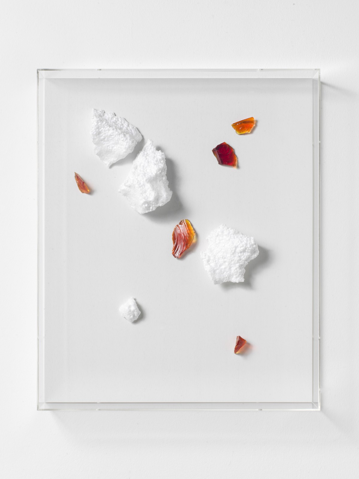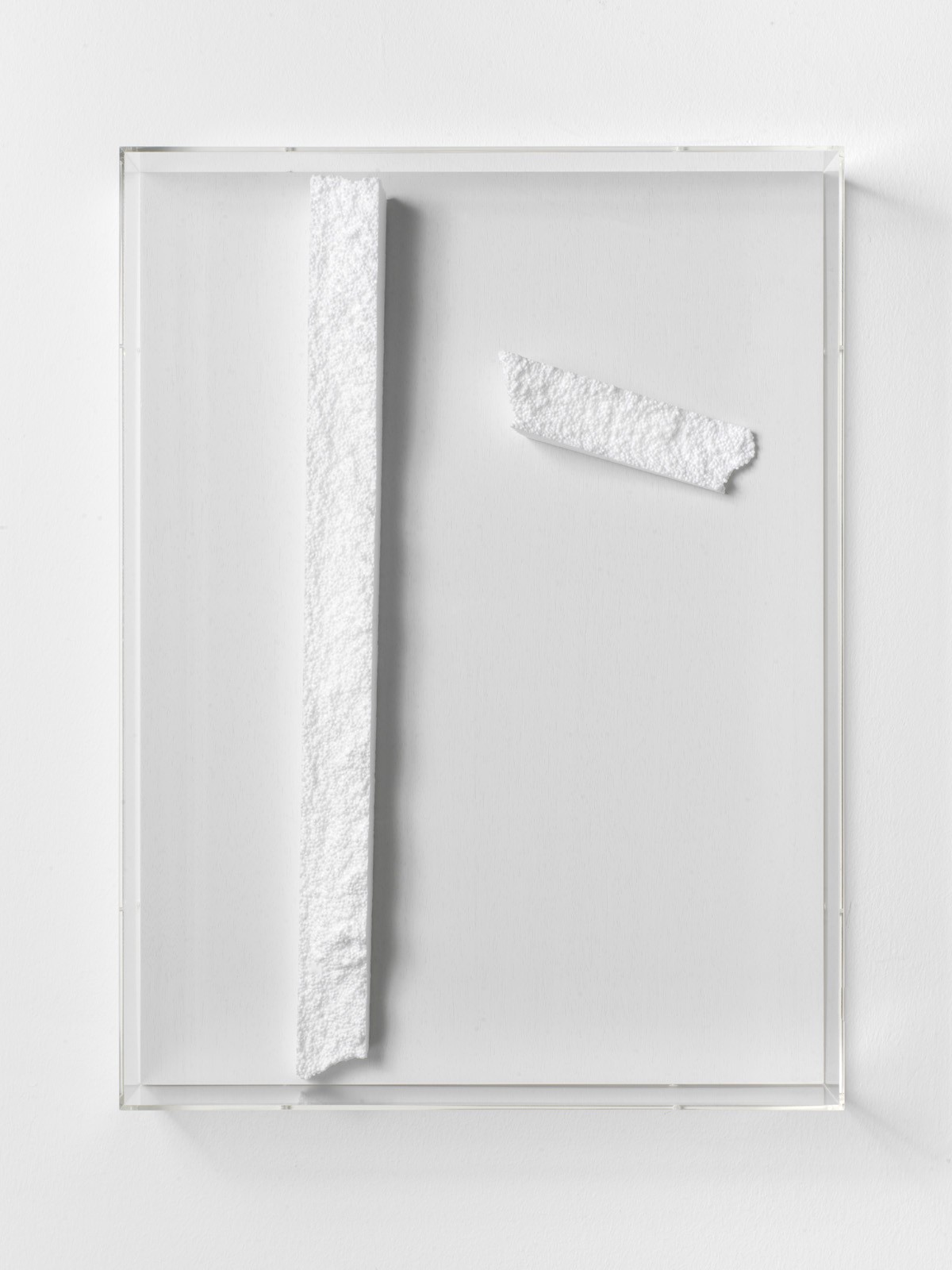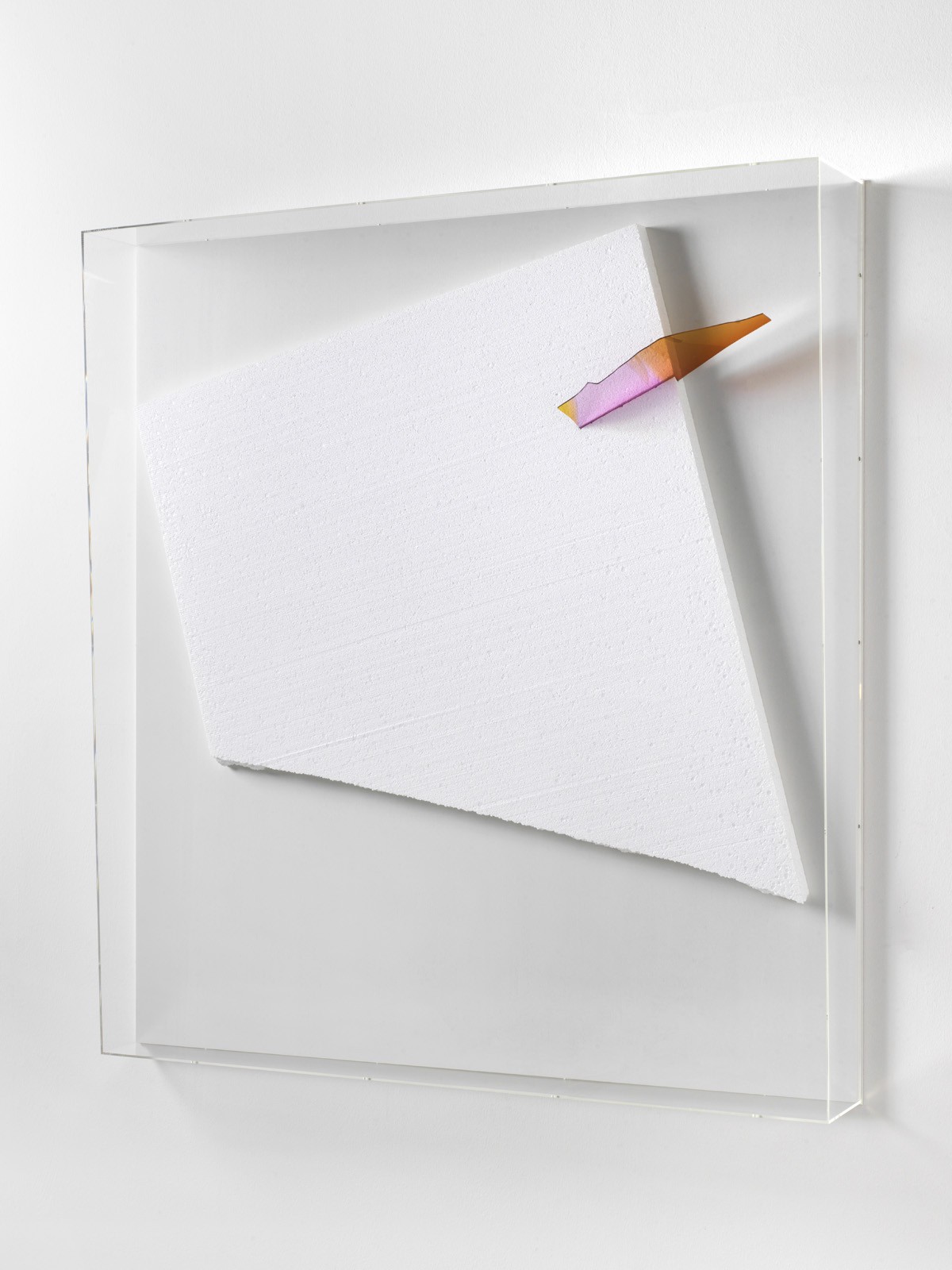 In “Wabel In My Walk,” his latest exhibition at dépendance, Thilo Heinzmann revisits a material he deployed in an earlier body of work: Styrofoam. With characteristic inquisitiveness, Heinzmann uses these careful arrangements of Styrofoam and colored glass to simultaneously vehicularize tactility and field-depth. Sheathed behind plexi glass as a means of protecting the momentum that literally arises from these paintings, their presentation is further enshrined in a compelling gesture that enunciates both the work’s delicacy and its monumentality. Heinzmann builds on his earlier oeuvre with the addition of asymmetric covers, which imbues these paintings with a velocity and finesse that effectively expands their presence in the space.