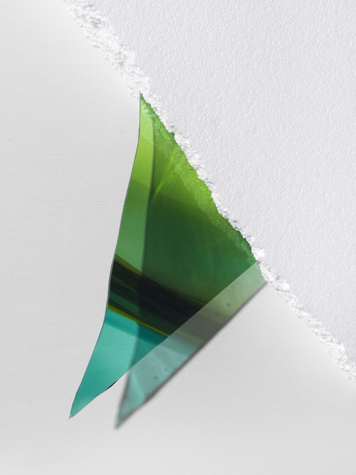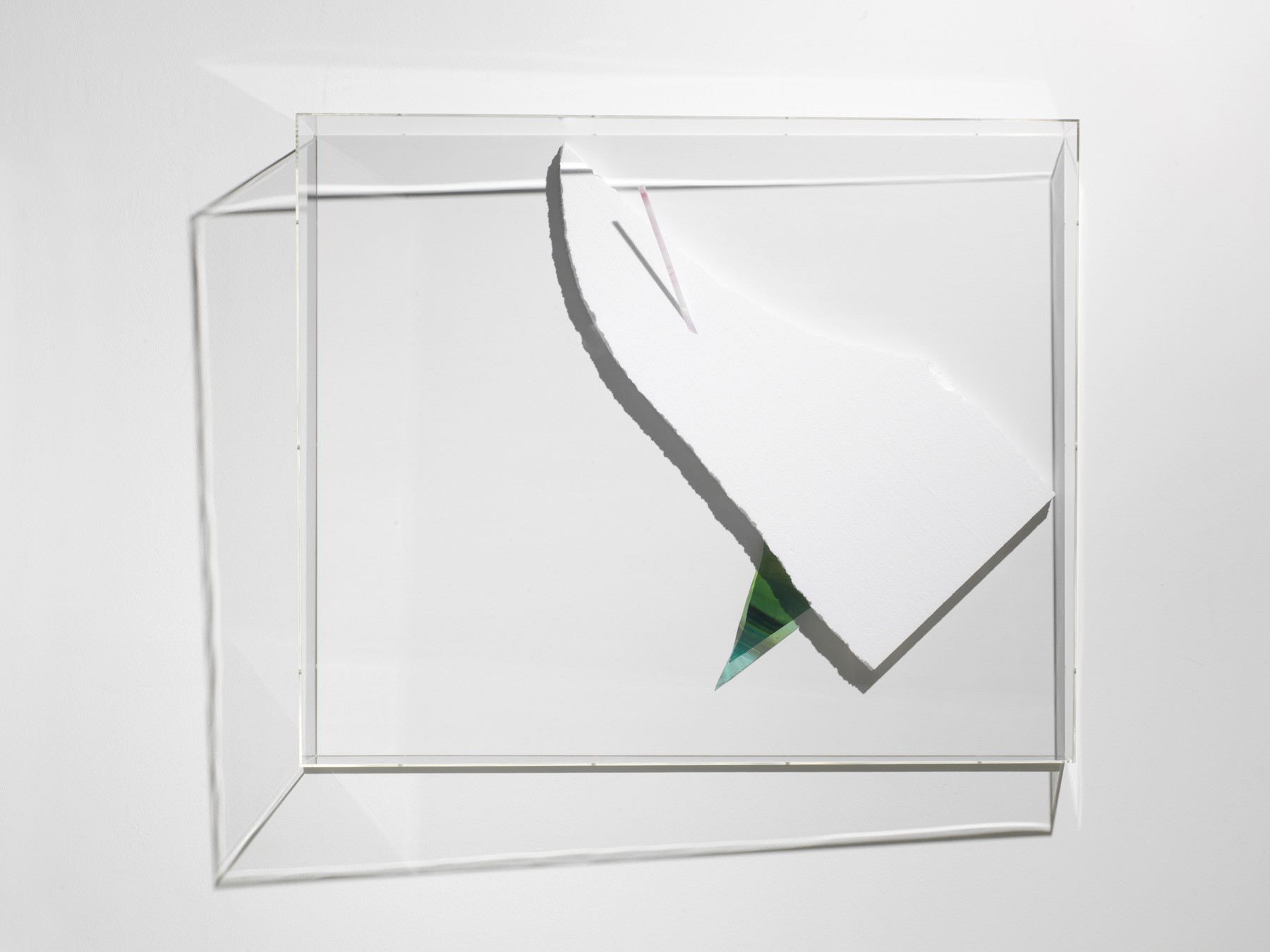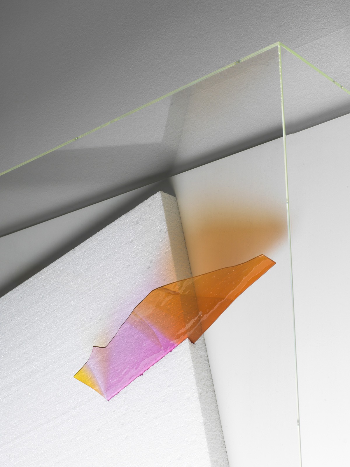 In “Wabel In My Walk,” his latest exhibition at dépendance, Thilo Heinzmann revisits a material he deployed in an earlier body of work: Styrofoam. With characteristic inquisitiveness, Heinzmann uses these careful arrangements of Styrofoam and colored glass to simultaneously vehicularize tactility and field-depth. Sheathed behind plexi glass as a means of protecting the momentum that literally arises from these paintings, their presentation is further enshrined in a compelling gesture that enunciates both the work’s delicacy and its monumentality. Heinzmann builds on his earlier oeuvre with the addition of asymmetric covers, which imbues these paintings with a velocity and finesse that effectively expands their presence in the space.