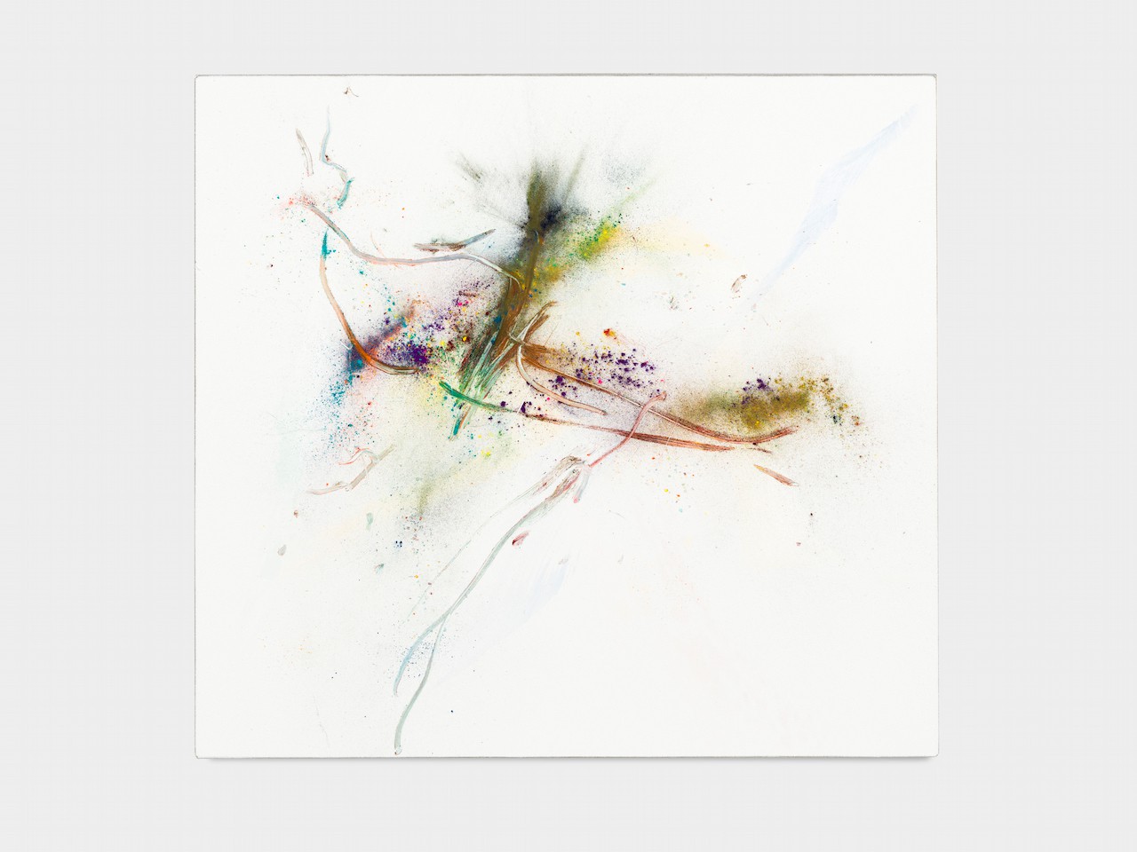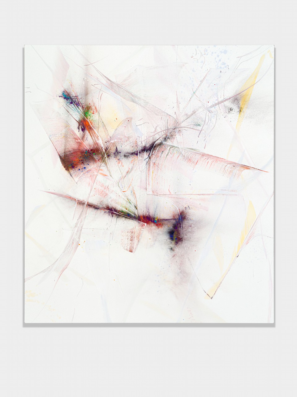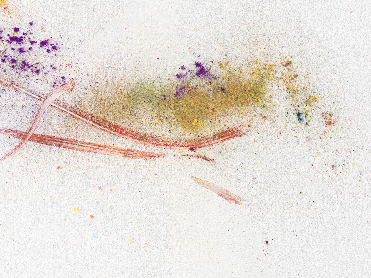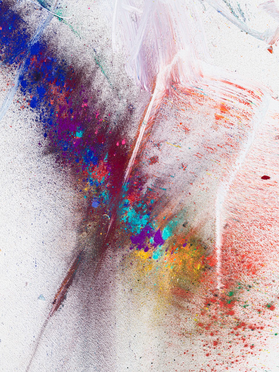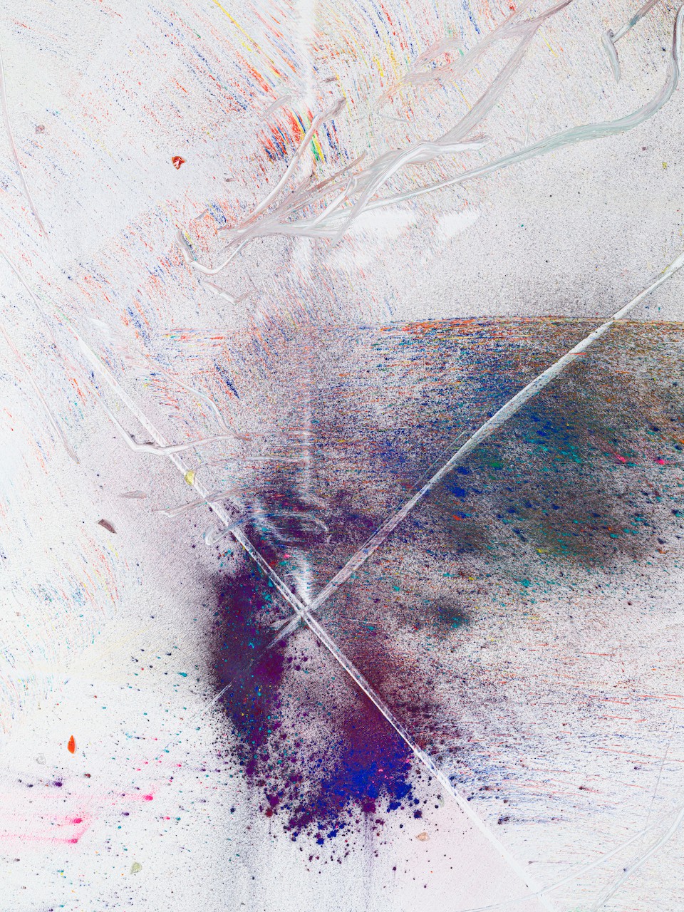 neugerriemschneider is pleased to present Thilo Heinzmann’s second exhibition with the gallery. On view in our Christinenstrasse space, Playing Slowies comprises a selection of new works that expand upon Heinzmann’s pigment paintings, exploring for the first time the correlation between outsized scale and methodology. Here, compositions feature unbound pigments in their powdered form and fragments of glass as they dash across textured fields in gestures that are at once meticulously calculated and inevitably subject to chance. Singular in their approach to mark making and unique navigation of proportion, they are collections of light, speed, motion and energy, that capture these aspects as they amalgamate to shape new modes of conceptualizing pictorial space.