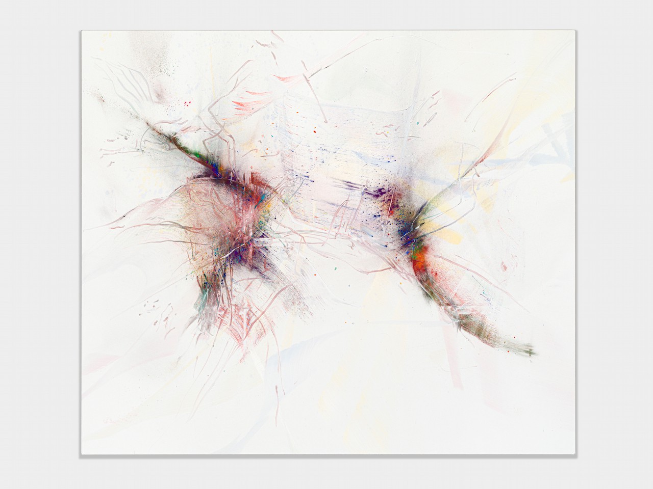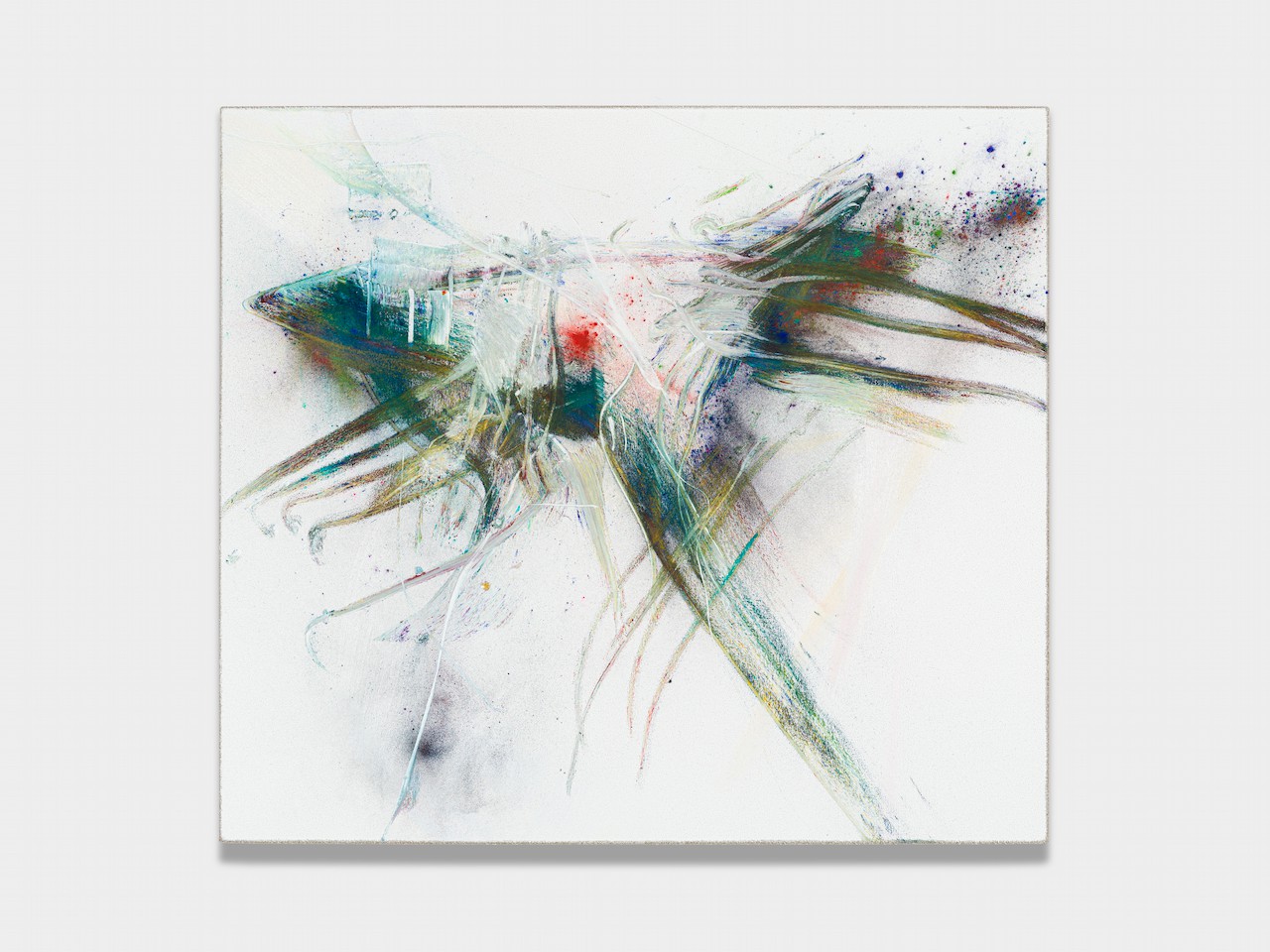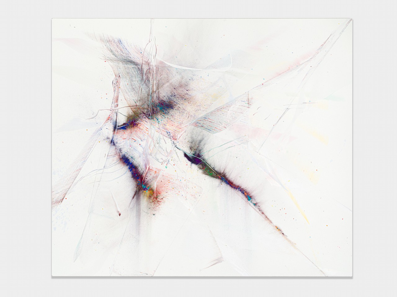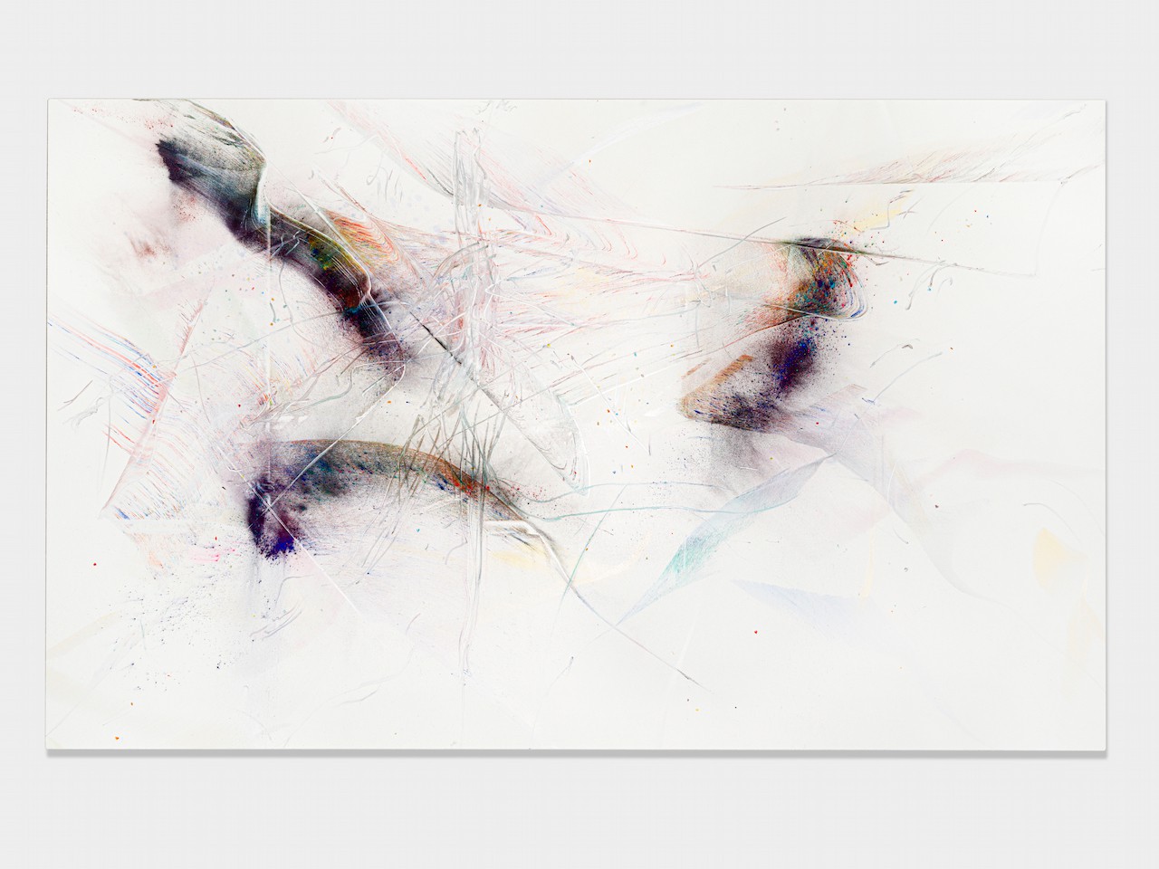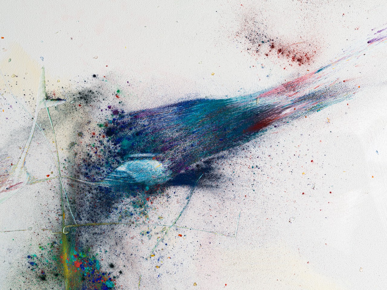neugerriemschneider is pleased to present Thilo Heinzmann’s second exhibition with the gallery. On view in our Christinenstrasse space, Playing Slowies comprises a selection of new works that expand upon Heinzmann’s pigment paintings, exploring for the first time the correlation between outsized scale and methodology. Here, compositions feature unbound pigments in their powdered form and fragments of glass as they dash across textured fields in gestures that are at once meticulously calculated and inevitably subject to chance. Singular in their approach to mark making and unique navigation of proportion, they are collections of light, speed, motion and energy, that capture these aspects as they amalgamate to shape new modes of conceptualizing pictorial space.
