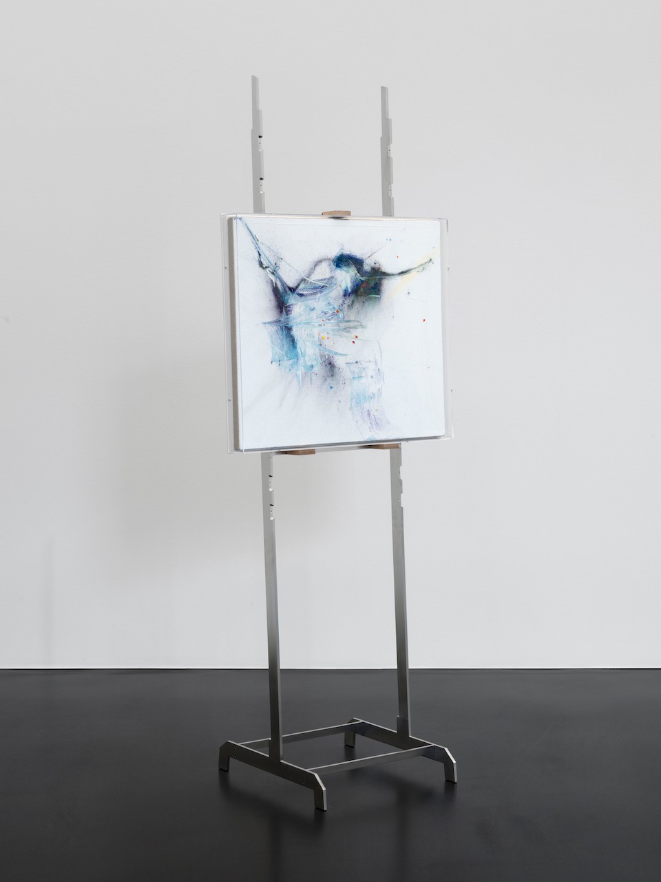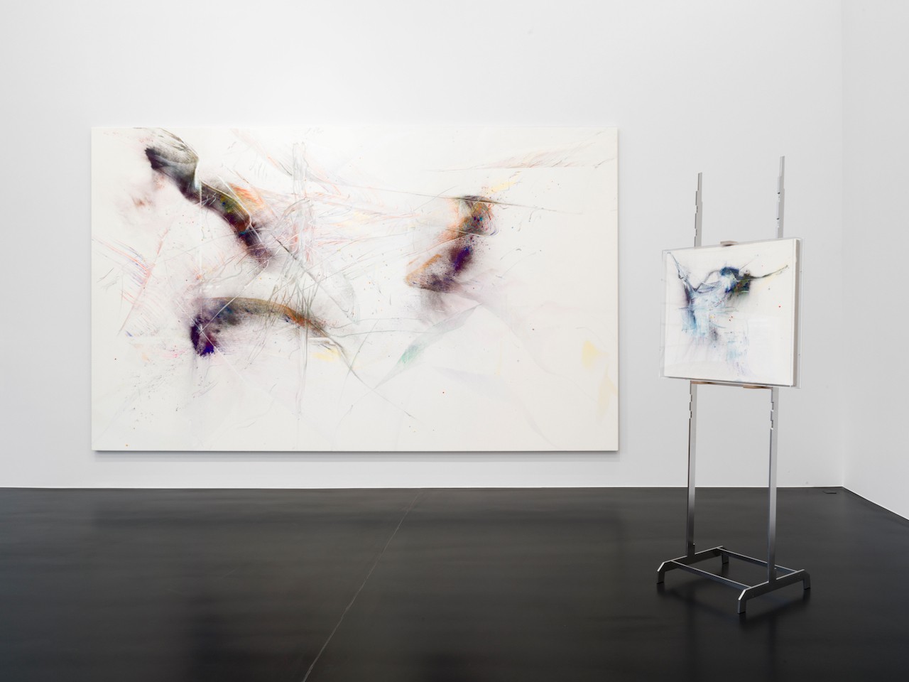 Set against and working in concert with their backgrounds, the pigments’ unmarred luminance interacts and enters dialogue with these bases - opaque coats that transform the canvas’ woven binaries into individuated, energetic picture planes. Heinzmann’s grounds stand as their own entities, drawing attention to painting’s literal and metaphorical foundation, while also providing stages for his pigments. The powdered bursts of hue are interspersed with particles of colored glass, which, along with both the position of a viewer and movement-evoking marks, create layered depth through the manipulation of light and its refraction. This play of light upon each O.T. work lends them an ever-shifting quality that emphasizes Heinzmann’s nonhierarchical treatment of each material and compositional element. Playing Slowies signifies a new exploration of scale for the artist. Presenting O.T. canvases of this monumental size for the first time, alongside an alternating selection of smaller paintings resting on free-standing, cantilevered easels designed by the artist, the exhibition and the works within it approach scale and substance as independent from, yet in conversation with one another rather than positioning them in direct relation: Their motifs respond to dimension, but do not derive from it.