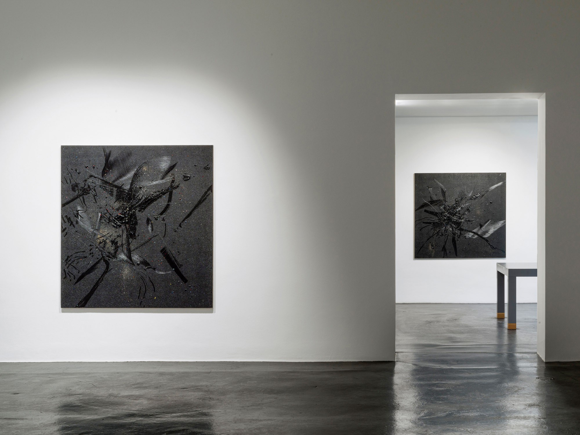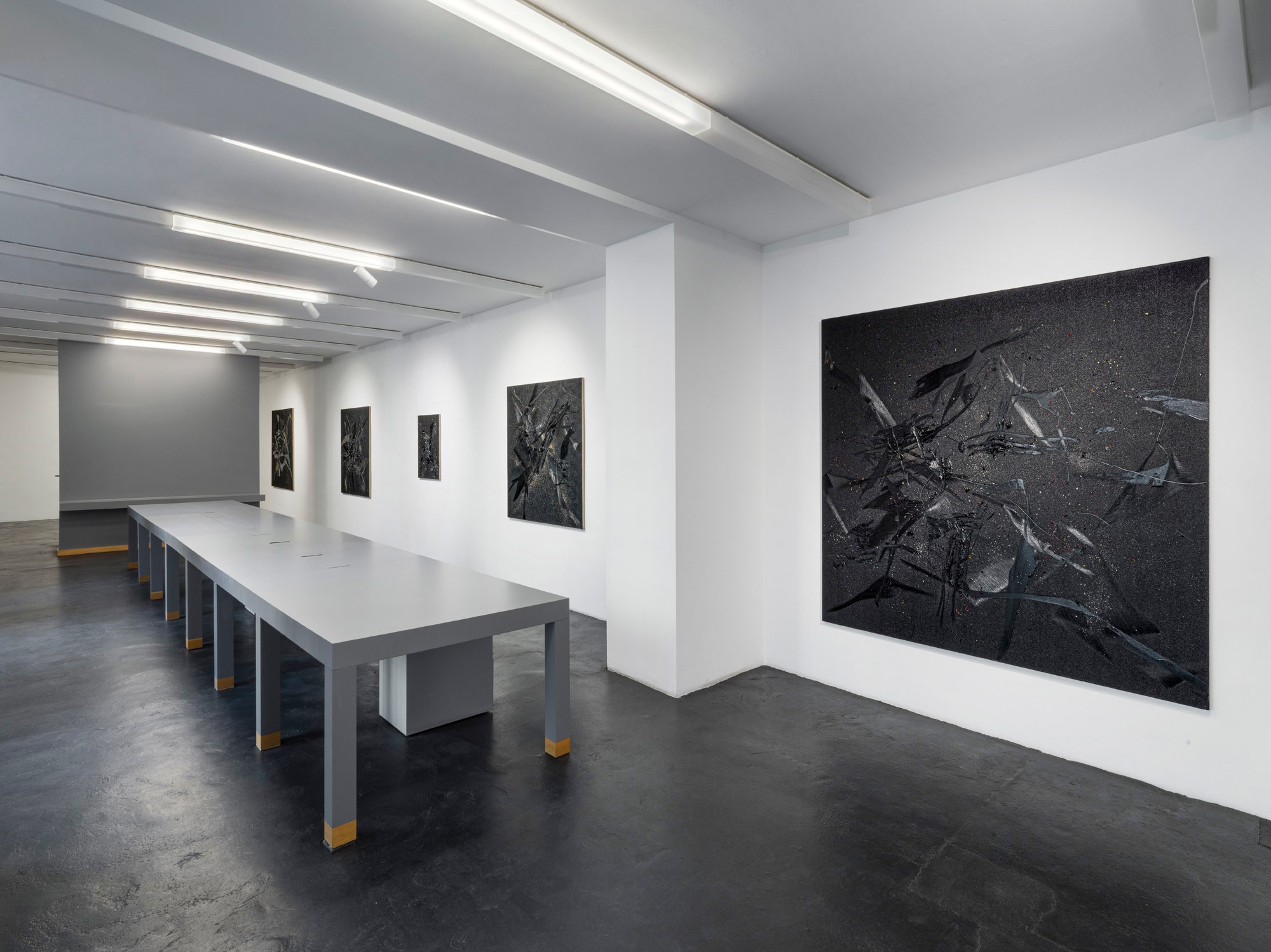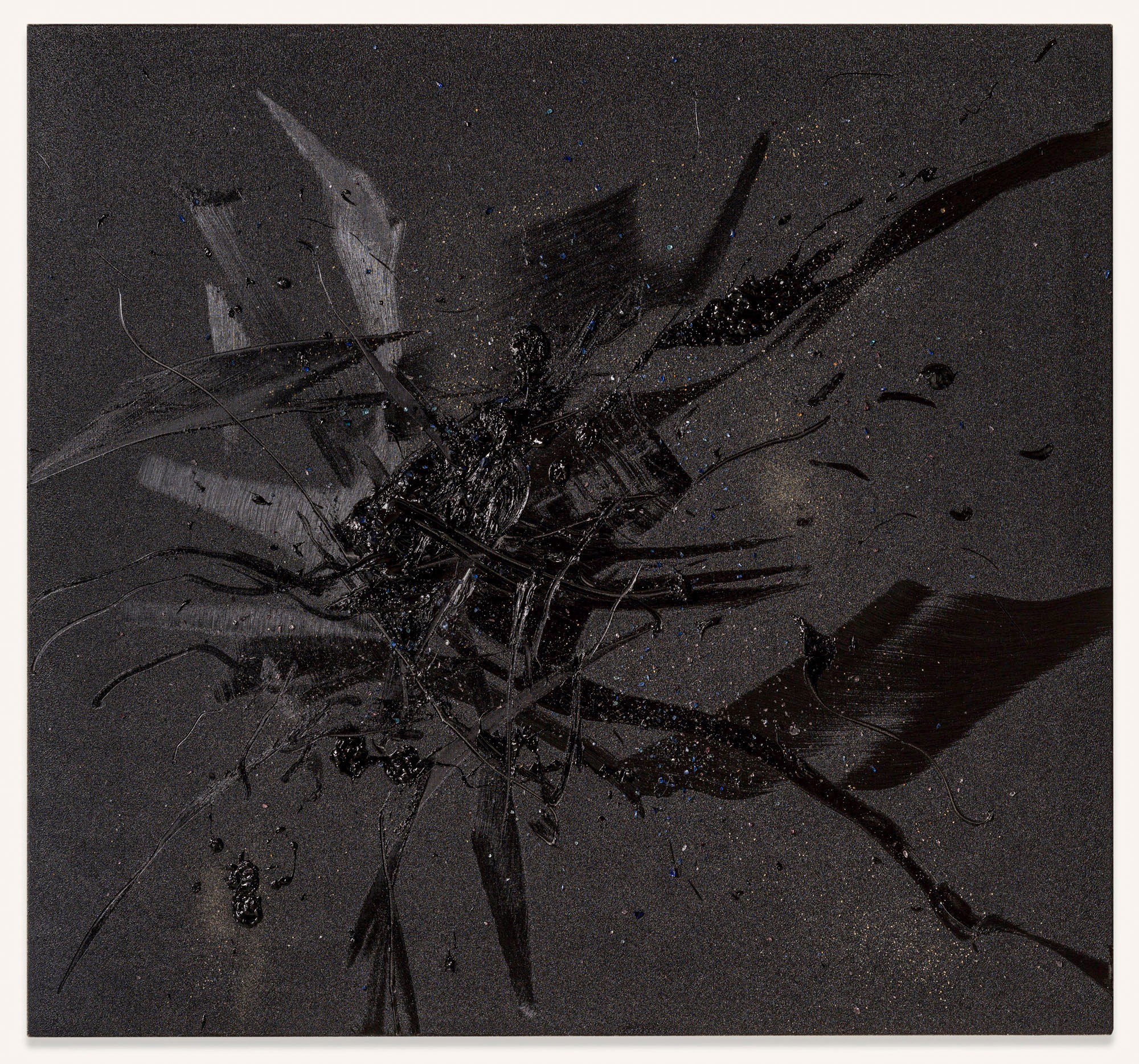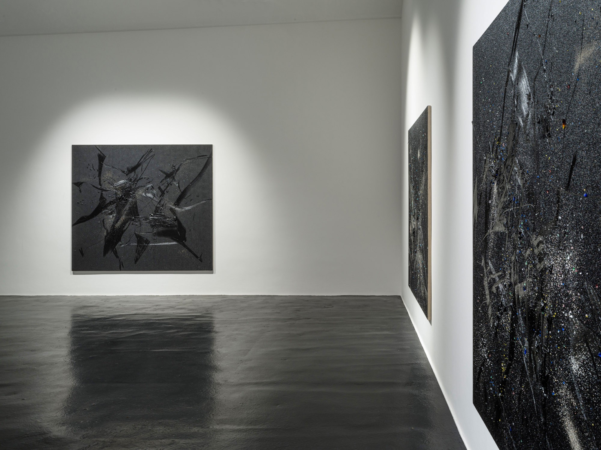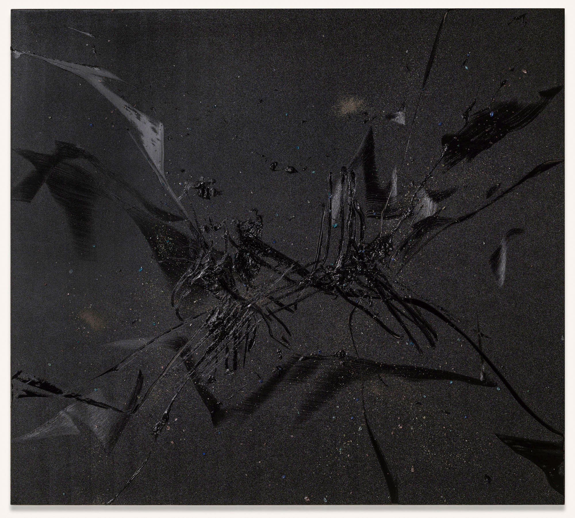 The Tacmo paintings, Tacmo standing for speed or velocity, are black paintings made from thick layers of paint through which Heinzmann drags his fingers, making negative imprints. In contrast to the pigment paintings where elements are added, here we see form emerging through the taking away of matter but we also see how close those two things are, in a way.
