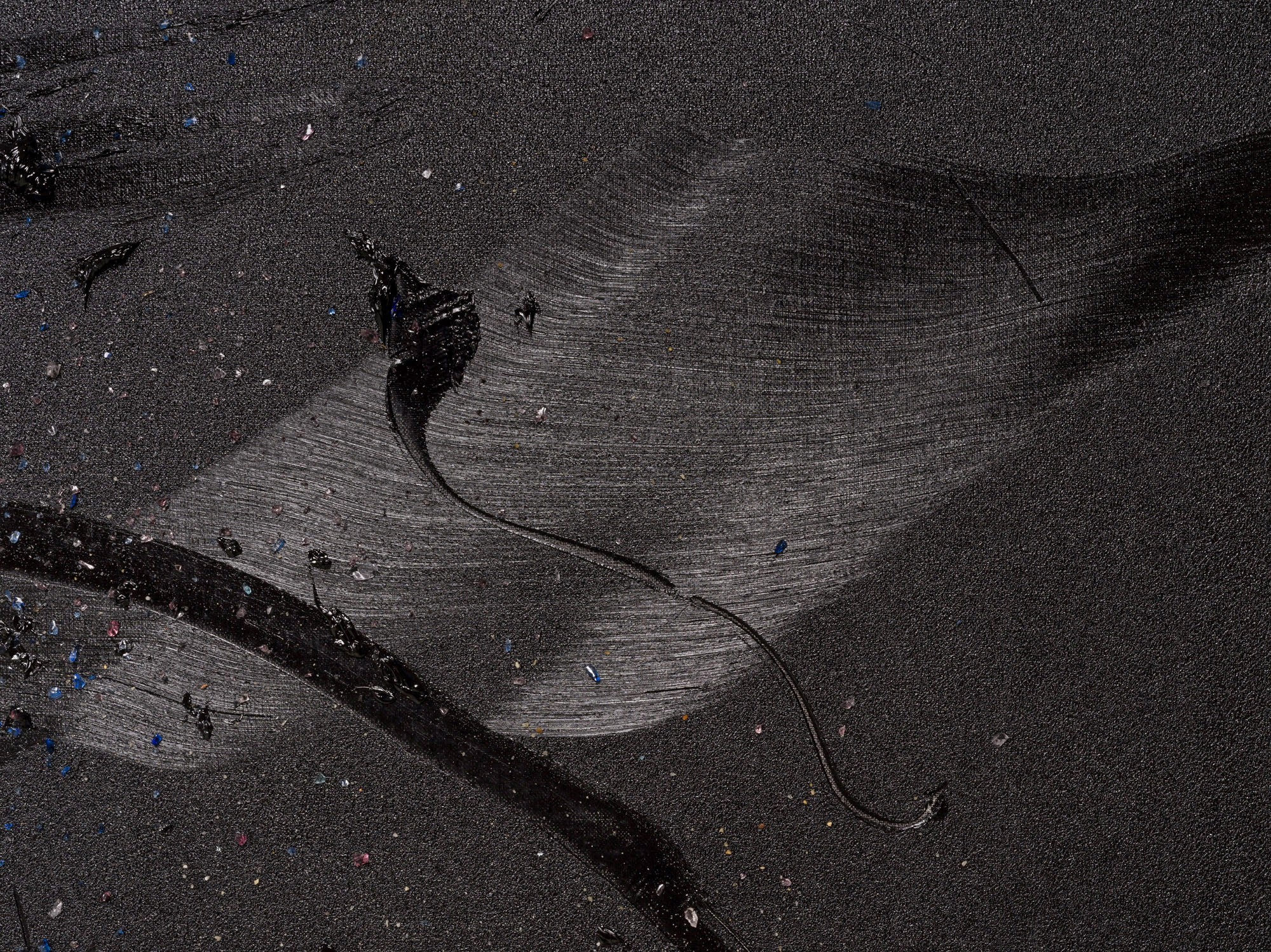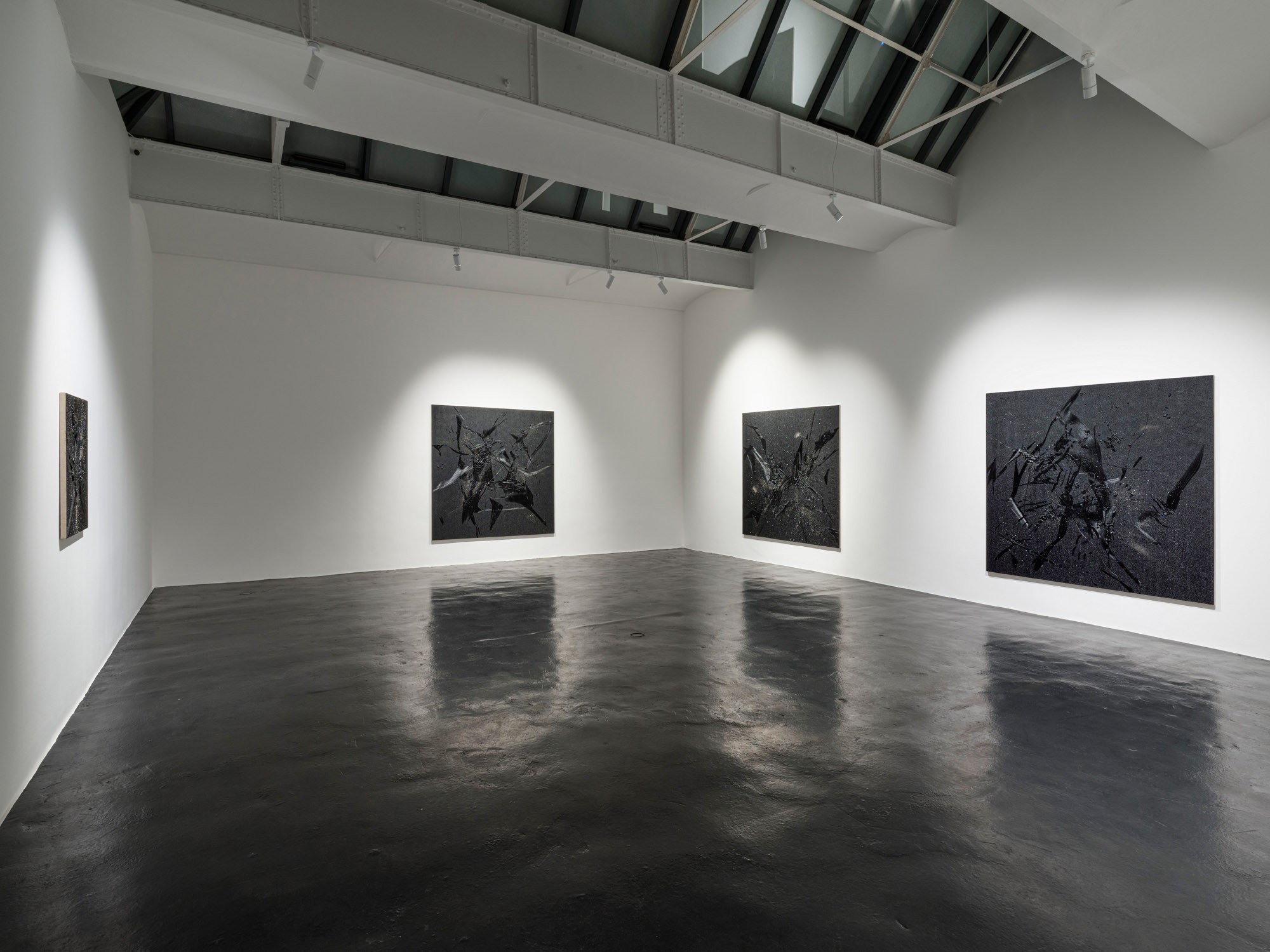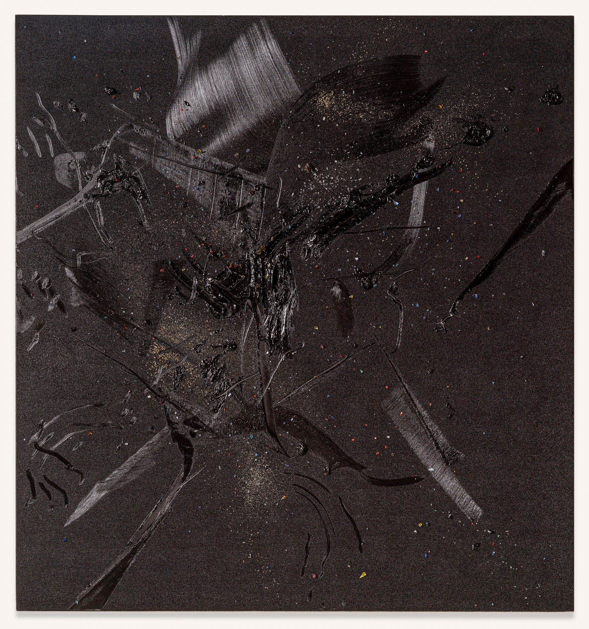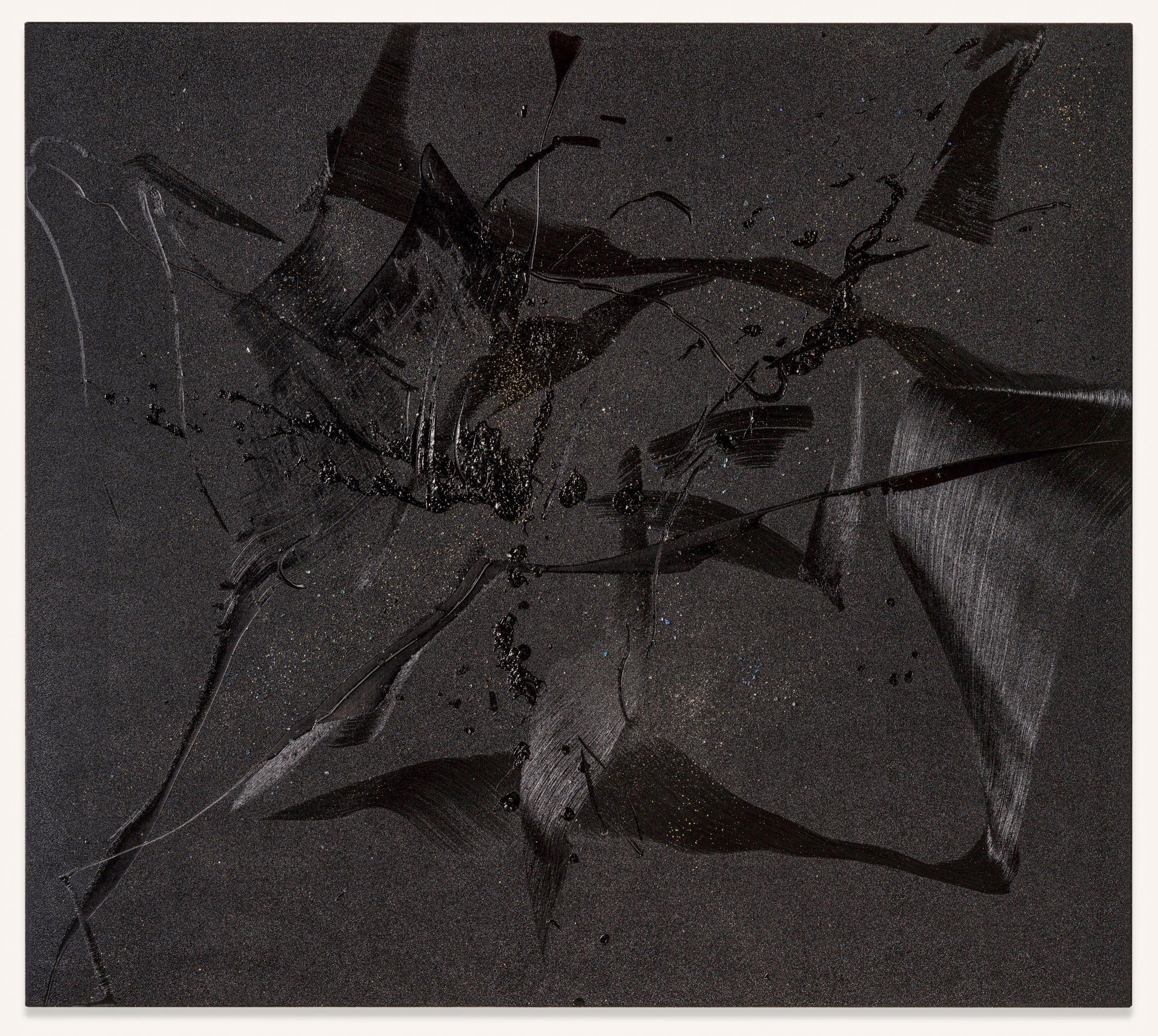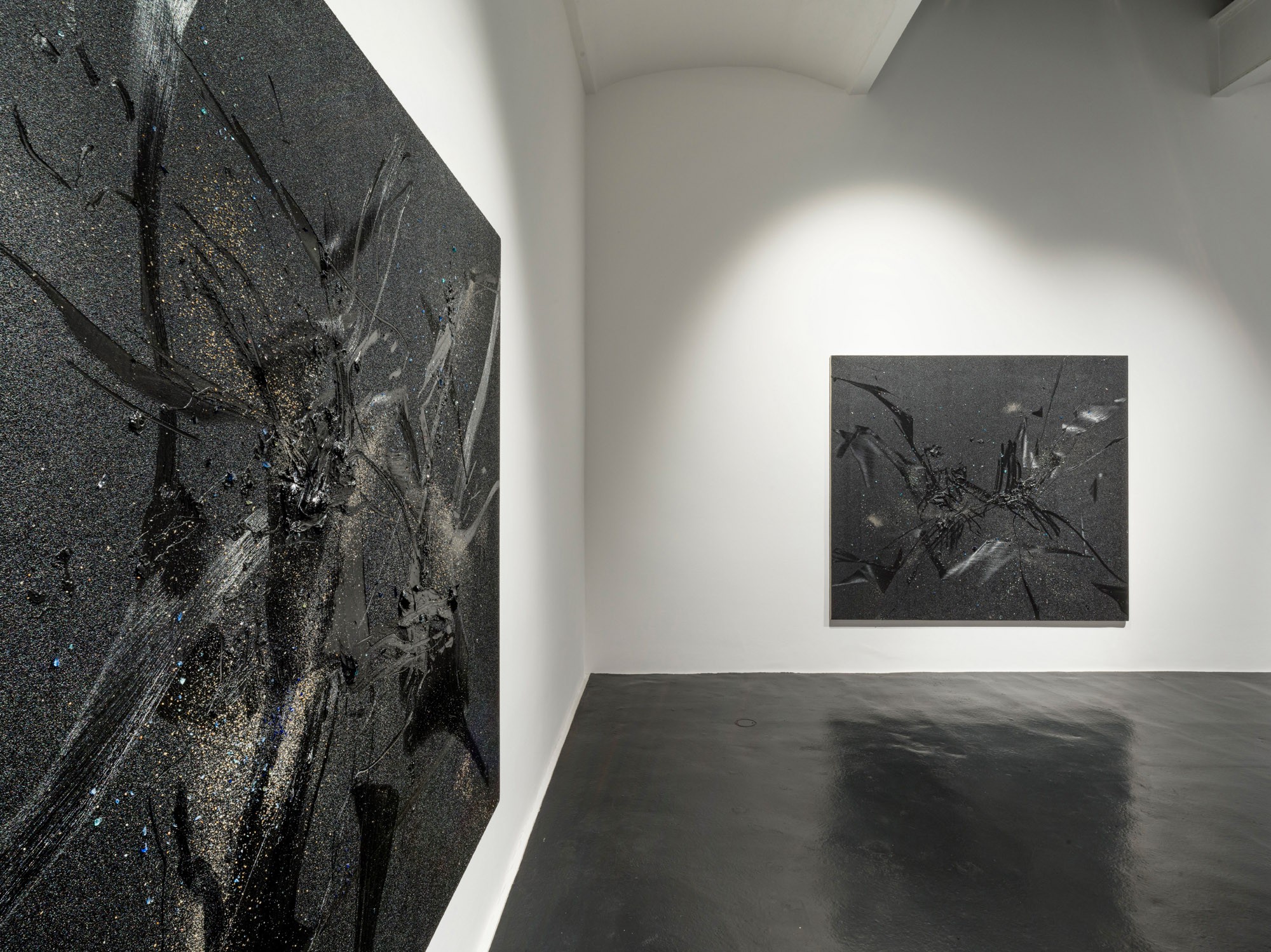 The Tacmo paintings, Tacmo standing for speed or velocity, are black paintings made from thick layers of paint through which Heinzmann drags his fingers, making negative imprints. In contrast to the pigment paintings where elements are added, here we see form emerging through the taking away of matter but we also see how close those two things are, in a way.