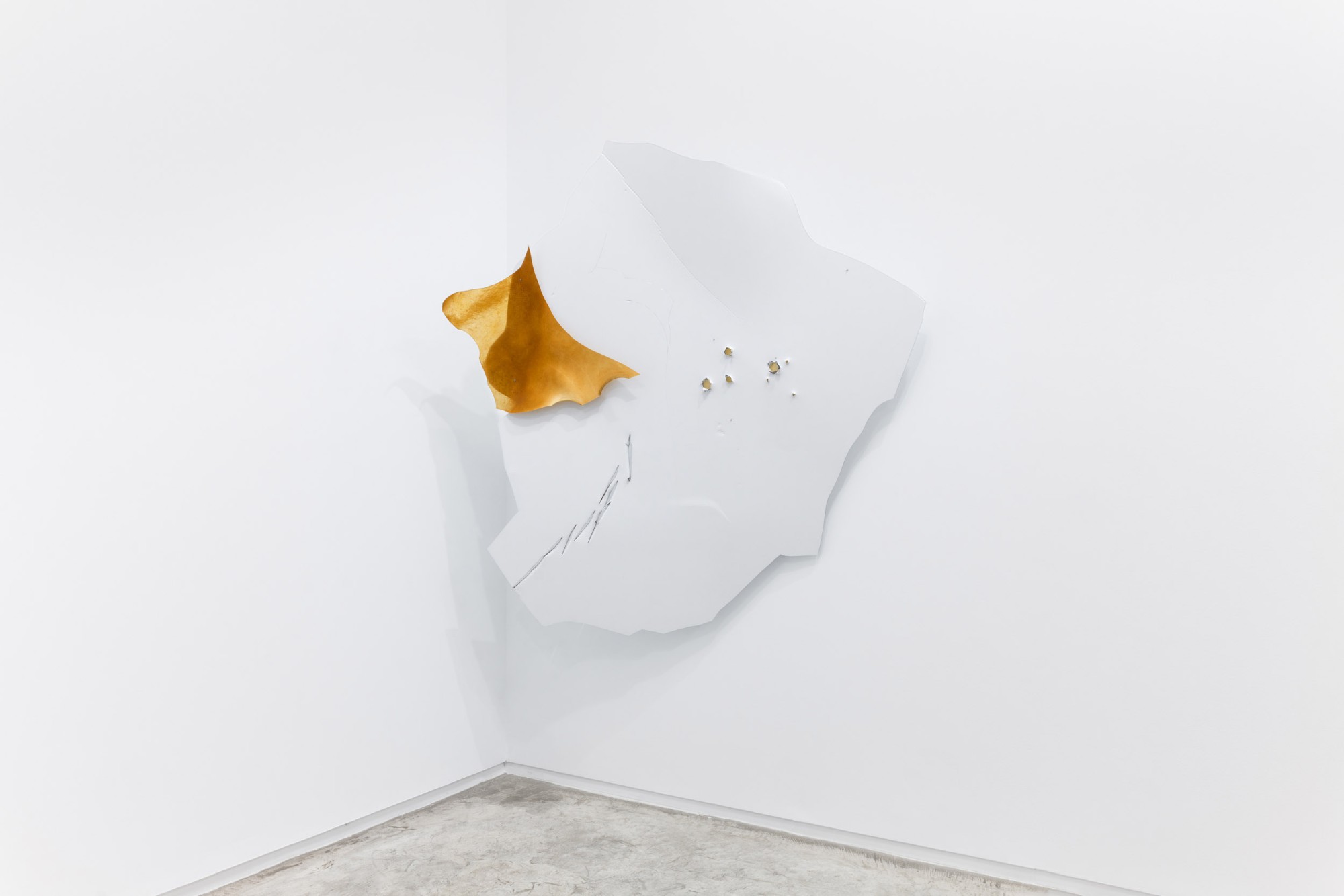 Incorporated into the installation alongside other works, the piece from the Aicmo series hangs suspended in one of the corners of the gallery. This work is an example of how, in this series, the supports have grown increasingly irregular in terms of shape and contour, and have become more complex in their pursuit of aspects such as light, shadow, dimensionality, and space. In this particular case, the cut and perforated aluminium also houses pieces of leather, and, with one foot still in the pictorial logic, the work leans once again towards the condition of object, thus questioning the very conception of the work of art, its function, its meaning.
