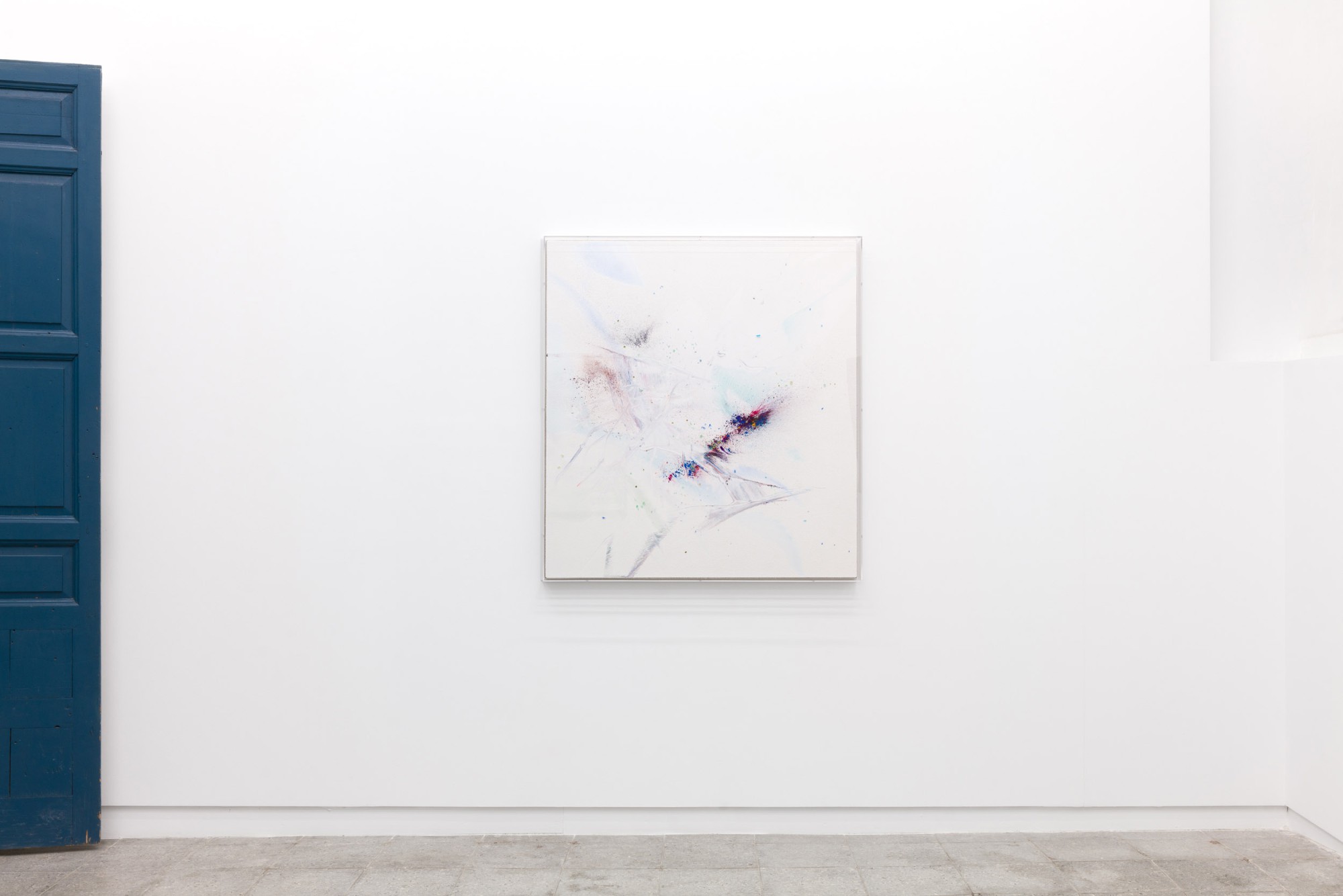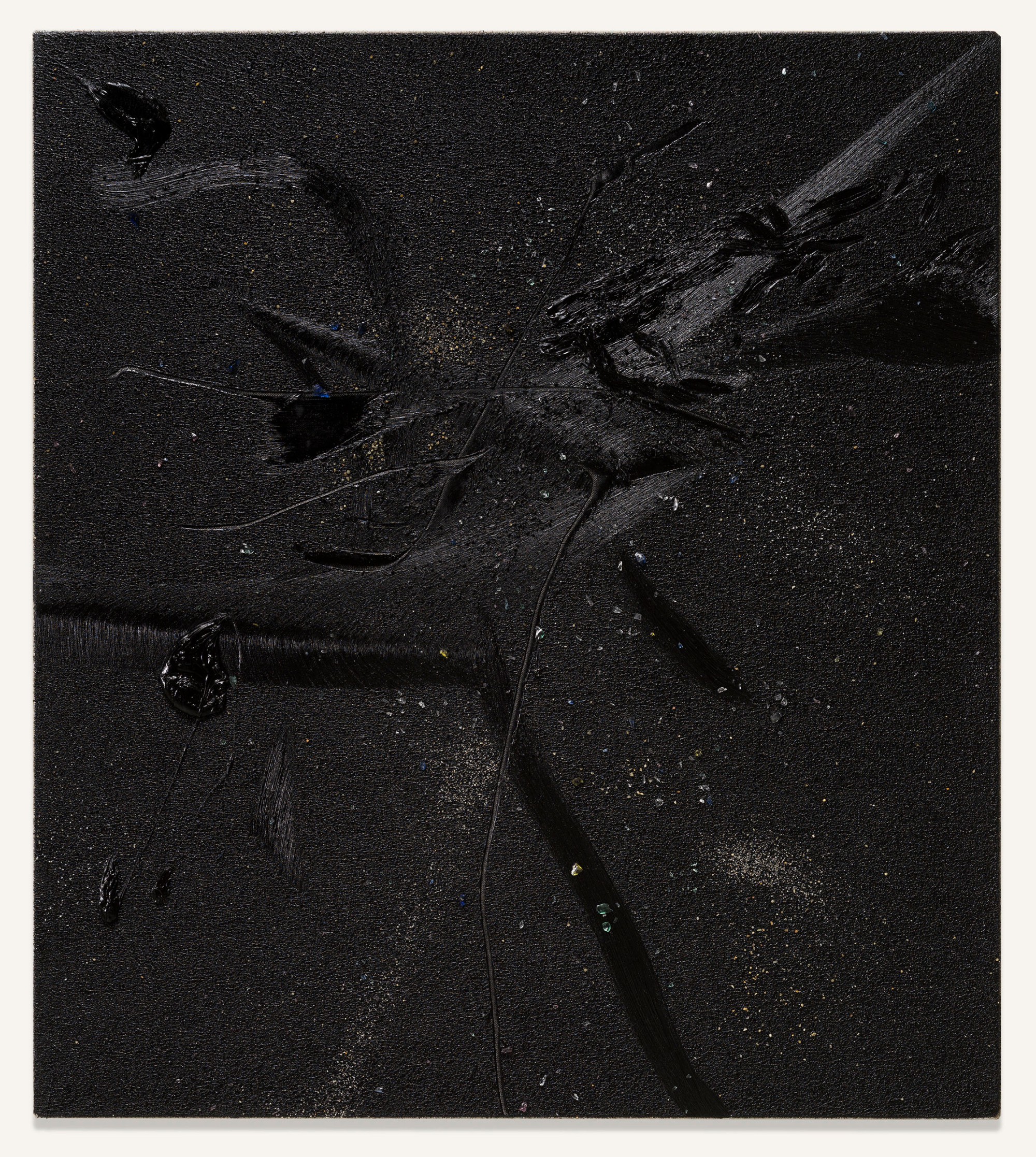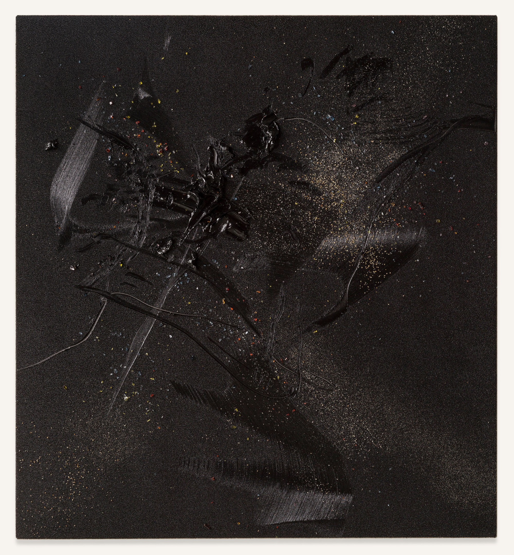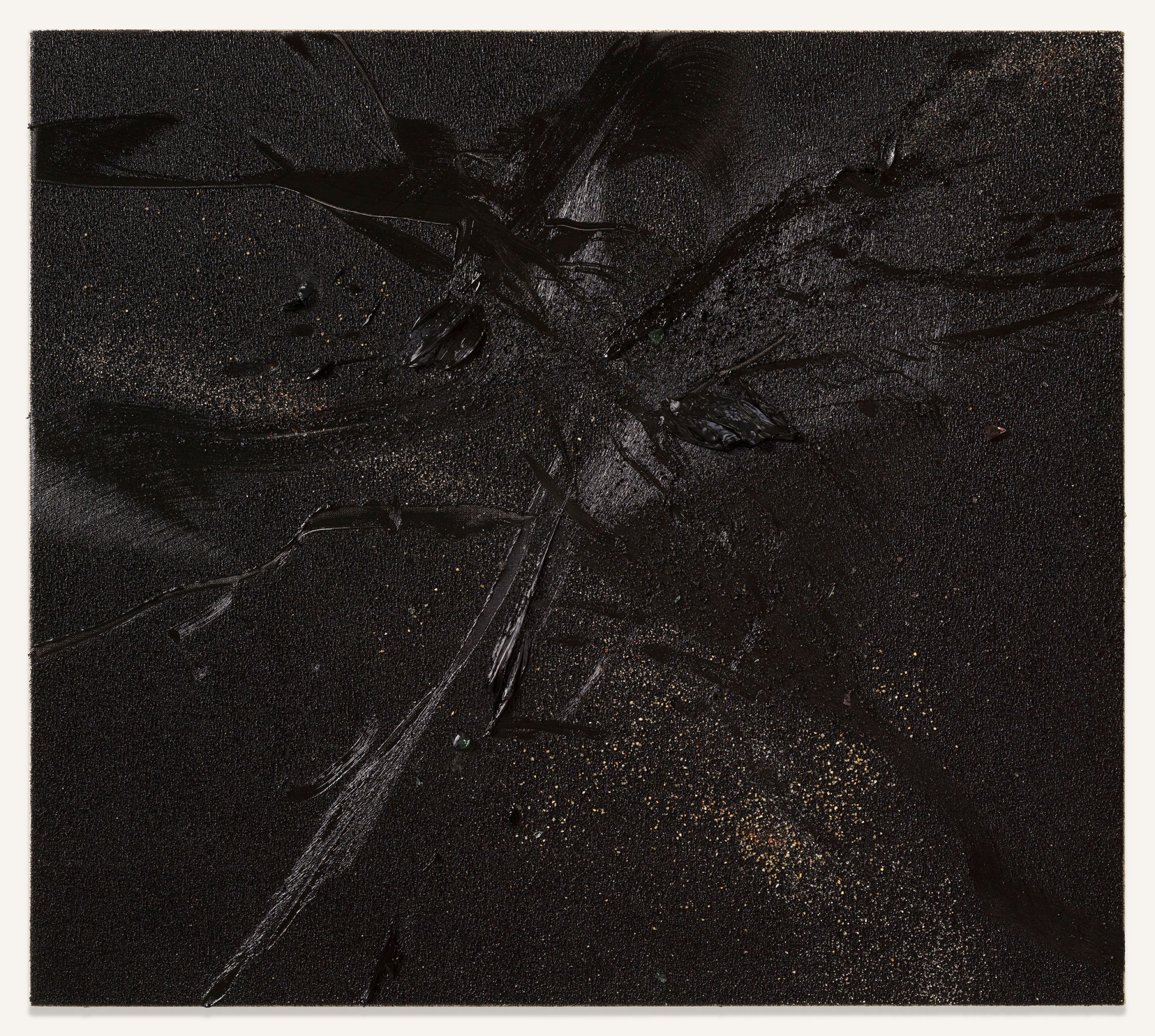 Yet, and in relation to the other type of works on display, in those belonging to his series of pigment paintings, the idea of material and temporal unity responds to the use of a pigment that is not so much applied as transposed. In these works, especially in those included in this exhibition, which are much more restrained in terms of gesture, colour, and expressiveness, the multiple material particles use their internal and specific vibrations to construct constellations suspended in time, seeming to echo something long since past. Each tiny element incorporated into the surface – the pigment particles (mineral and metallic), the fragments of coloured glass, the combinations of wet and dry materials,