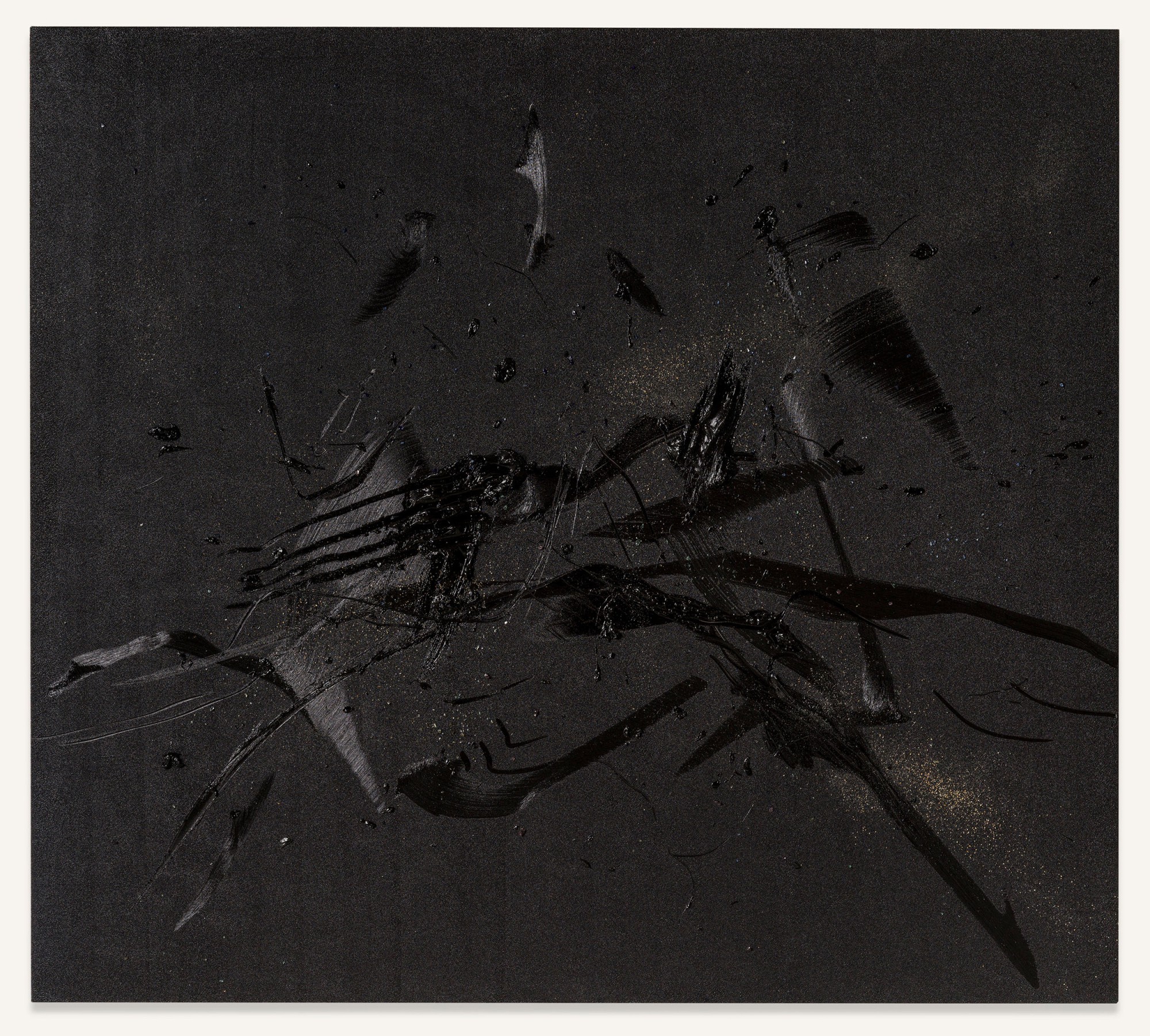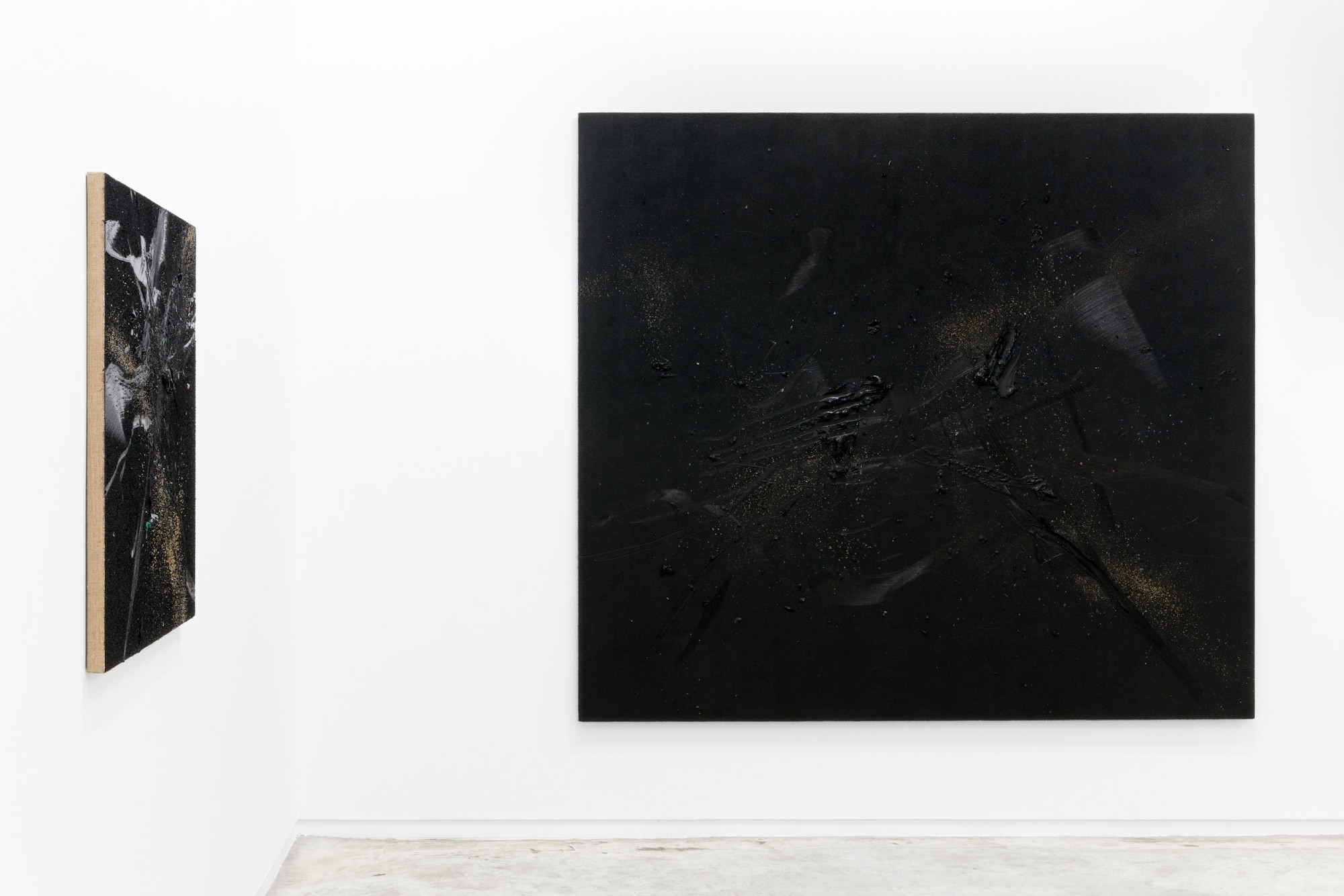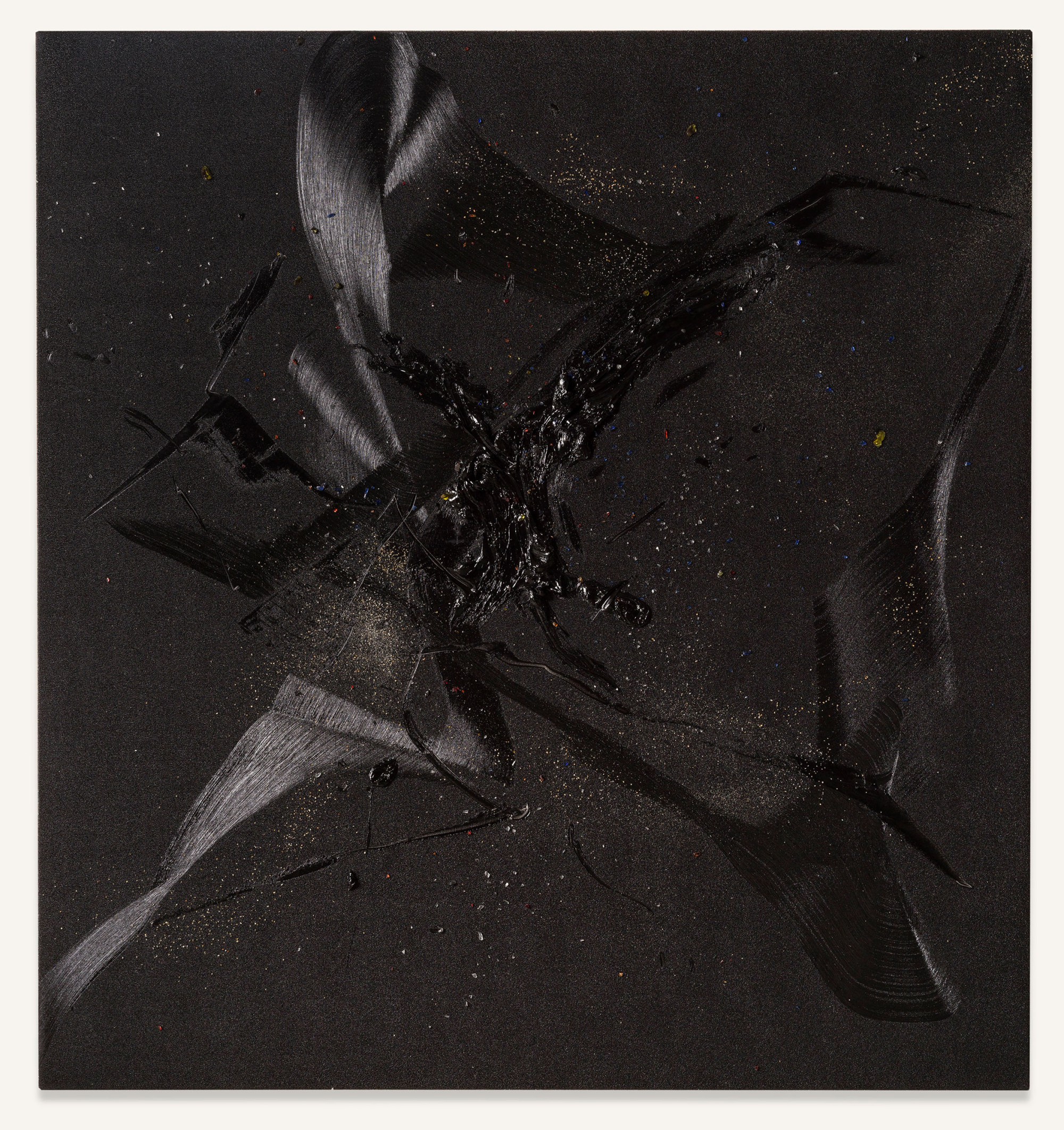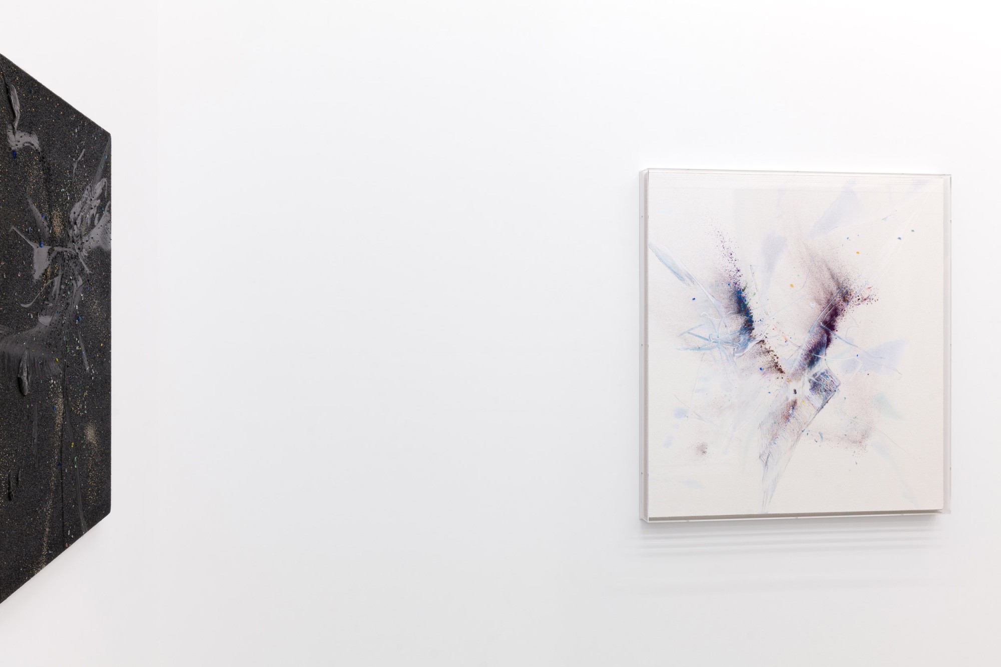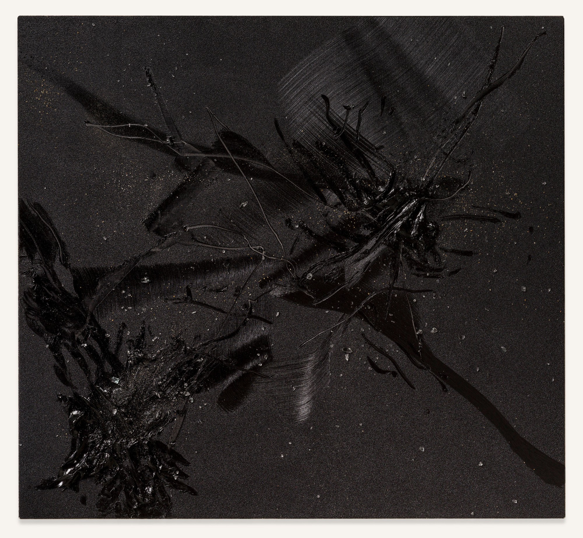 Yet, and in relation to the other type of works on display, in those belonging to his series of pigment paintings, the idea of material and temporal unity responds to the use of a pigment that is not so much applied as transposed. In these works, especially in those included in this exhibition, which are much more restrained in terms of gesture, colour, and expressiveness, the multiple material particles use their internal and specific vibrations to construct constellations suspended in time, seeming to echo something long since past. Each tiny element incorporated into the surface – the pigment particles (mineral and metallic), the fragments of coloured glass, the combinations of wet and dry materials,
