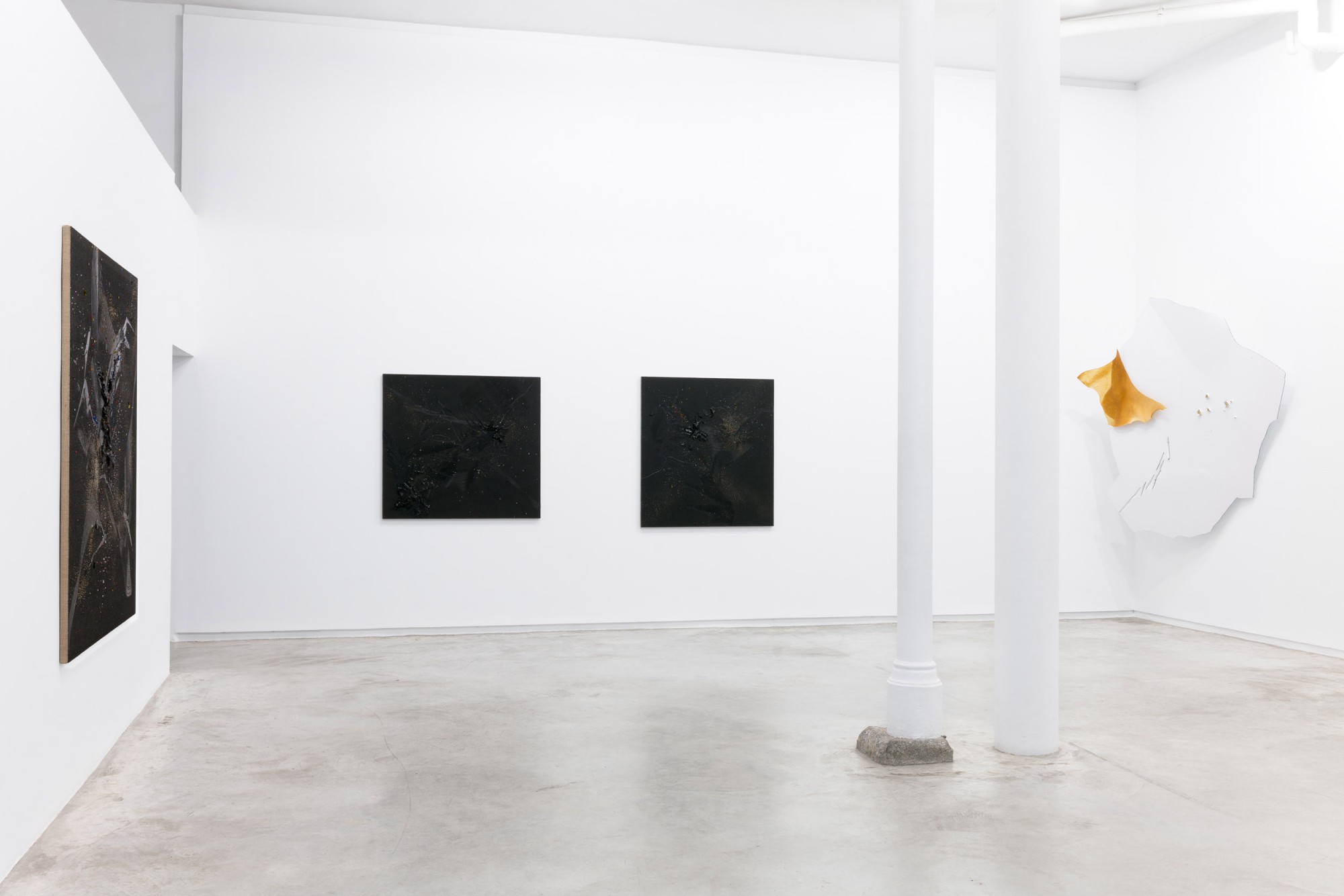 The sand pieces feature a stark economy of colours, broken up by the use of atmospheric dust and a multitude of glass fragments scattered throughout. The painting, conceived as an indivisible whole, now displaces real space to embark on a new journey towards its own autonomy. The phenomenological nature of these works harbours questions related to sight, perception, and touch. The traces of brushes dragging colour across the surface are clearly visible, as are those of fingers scratching the paint, achieving more than just effects, but an atmosphere, a material sensation. With bright, iridescent reflections, the blackish material is arranged on a rough surface full of particles of sand and coloured glasses, leading this new painting to encompass a larger set of operations. And it is not so much sand excavated and extracted from the earth as another, more mysterious kind which, in the artist’s words, floats and falls. Lucio Fontana’s Tagli, which have sometimes been invoked in reference to Heinzmann’s work, are not as relevant now as his sculptural practice from the late 1940s, a more underrated aspect of the Italian artist’s oeuvre with which Heinzmann’s new works establish a more direct material connection. Many of those sculptures also occupied an uncertain space between matter and humour, and it is precisely these two senses that Heinzmann has paid the most attention to.