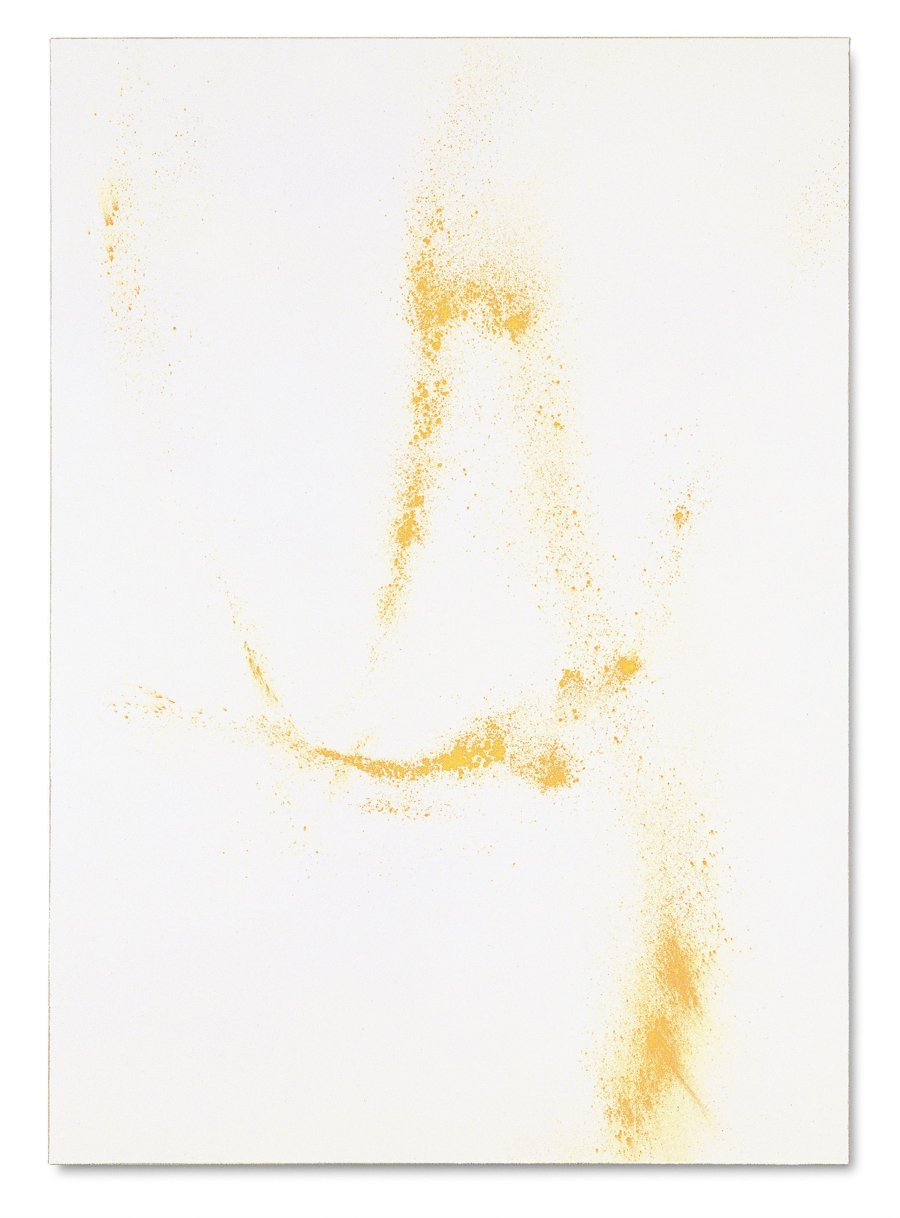 There’s an even spacing between the marks, and the expanse of the pristine semi-gloss surface is for the greater part intact. The pattern of marks in Aicmo VII doesn’t offer any obvious reading. The holes themselves could be interpreted as having a sexual connotation. It’s a direction of analysis made more probable when the title of a similar work, Stehende Frau (Standing Woman) (2006) is taken into consideration. Here the figure of a woman is suggested by a single, triangular shaped rupture, (though alternatively this could also be taken as her nose).