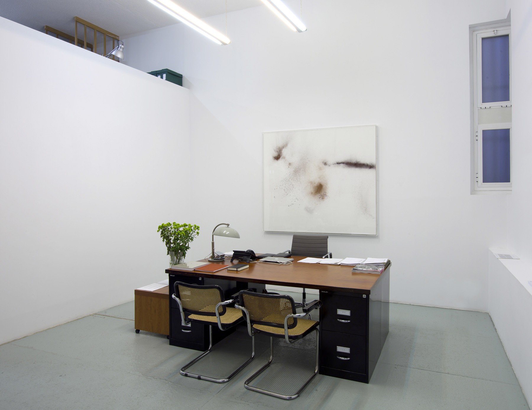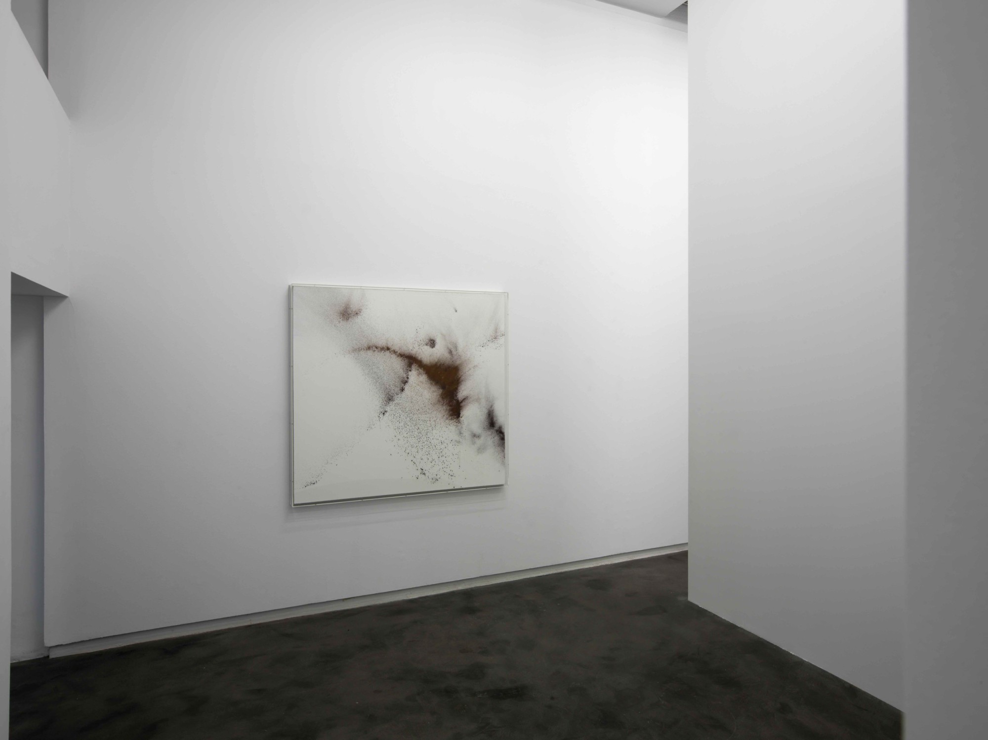 The concept behind this exhibition is a sort of series of tension and balance, here composition and form are not to be interpreted by conventional standards but by principles where emotion and the senses prevail. One of the fundamental spects of Heinzmann’s work is the process by which he produces “…dichotomies between white and black, speed and stillness, diffusion and explosion, resolved by the painting into a trans-sensory relationship between texture and form” as Michael Bracewell states in the artist’s new catalog published by Hatje Cantz. All of these aspects are gracefully presented in the current exhibition. This being said, not everything is as it seems at first glance: black and white become a blurred spectrum of tones that drag the predominating colors towards a wide chromatic variety; unbound pigment is swiftly scattered through sliding and lashing movements over the pristine surfaces of the canvas thereby simultaneously creating suspension and movement; and the visual gives way to the tactile.
