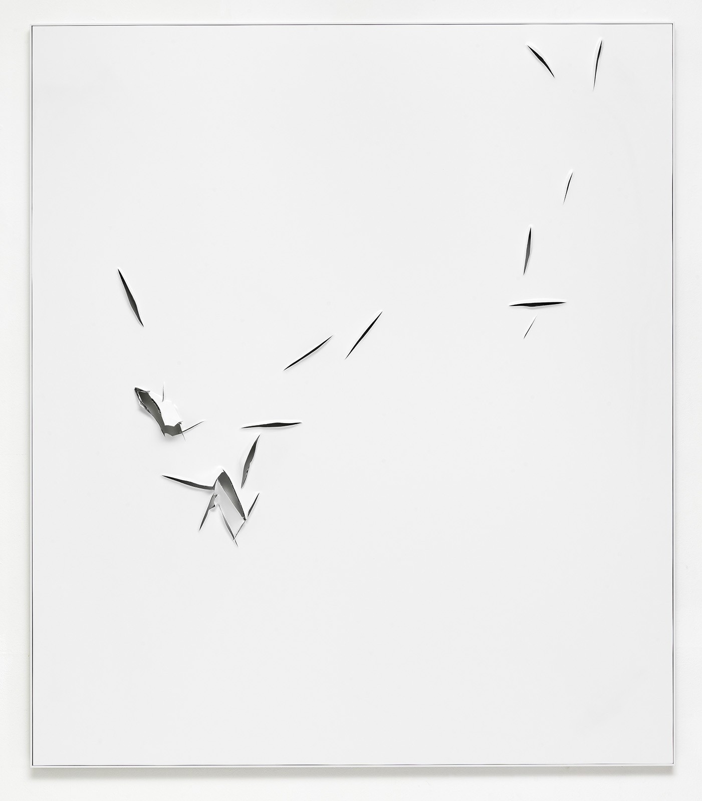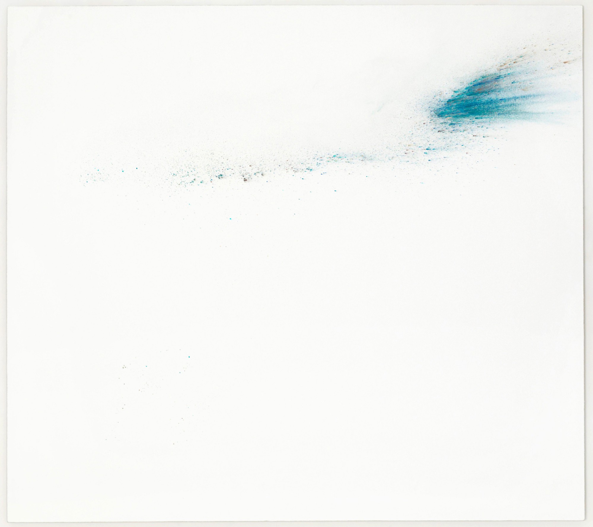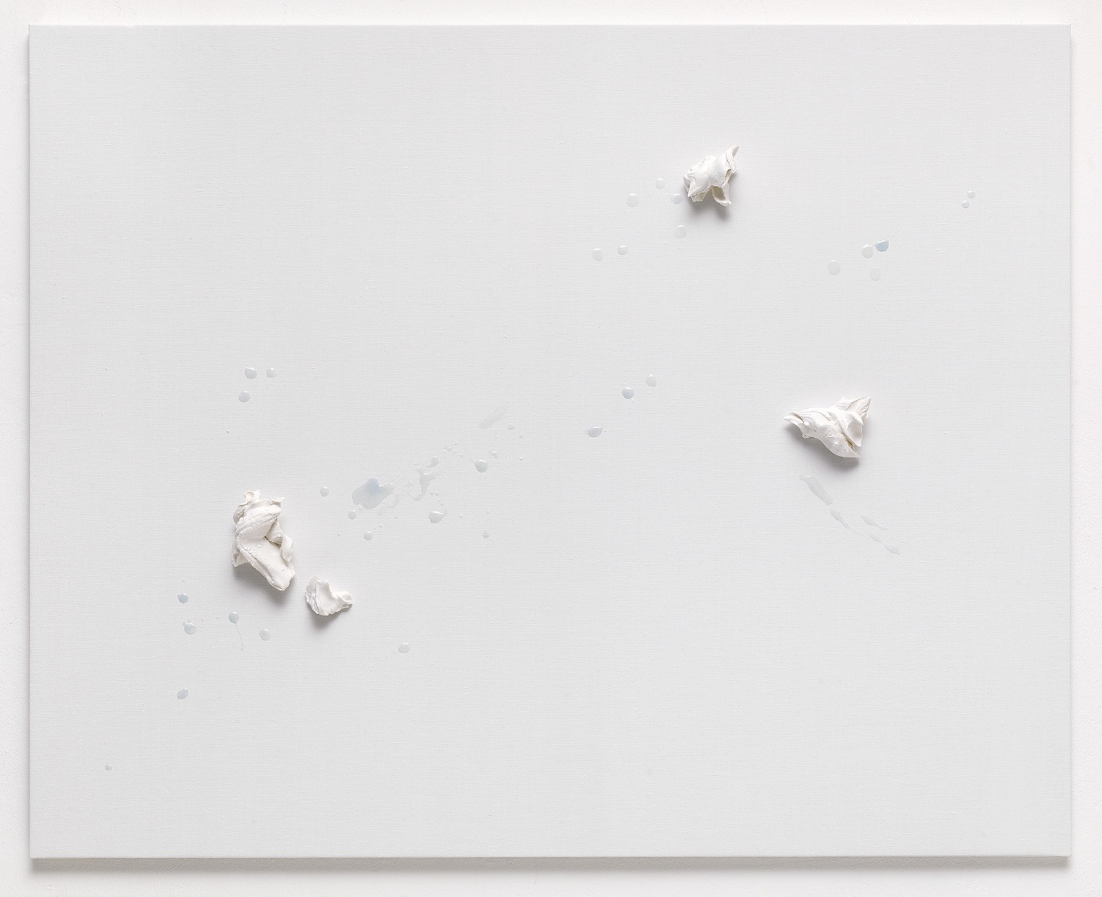 A relief-arrangement of small, irregular marble blocks; hues of powdery pigment; sculpted rags of hessian in flesh-tone dyes; sharply perforated metal surfaces; intricately shaped and then glazed porcelain bodies, reminiscent of forms of nature; cotton fluff; slabs of styrofoam; sprinkled dispenses of oscillating, colored resin that in some places sit on white grounds, oozing effects of liquidity, while in other parts being soaked into the textile on which they have landed, coloring the material from within its very woven structure; the reflective splashes of poured and hardened zinc; and even mere traces of movement left on otherwise minutely worked, matte planes of black, which now achieve the improbable – to catch refractions of light, in their full darkness.