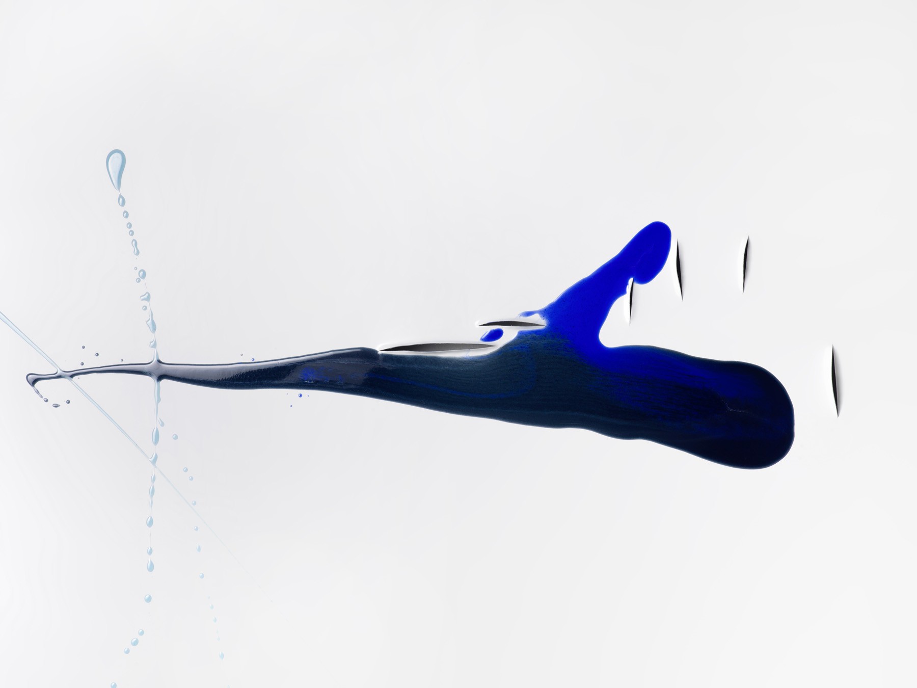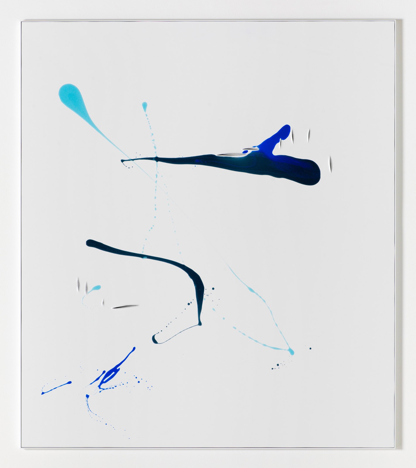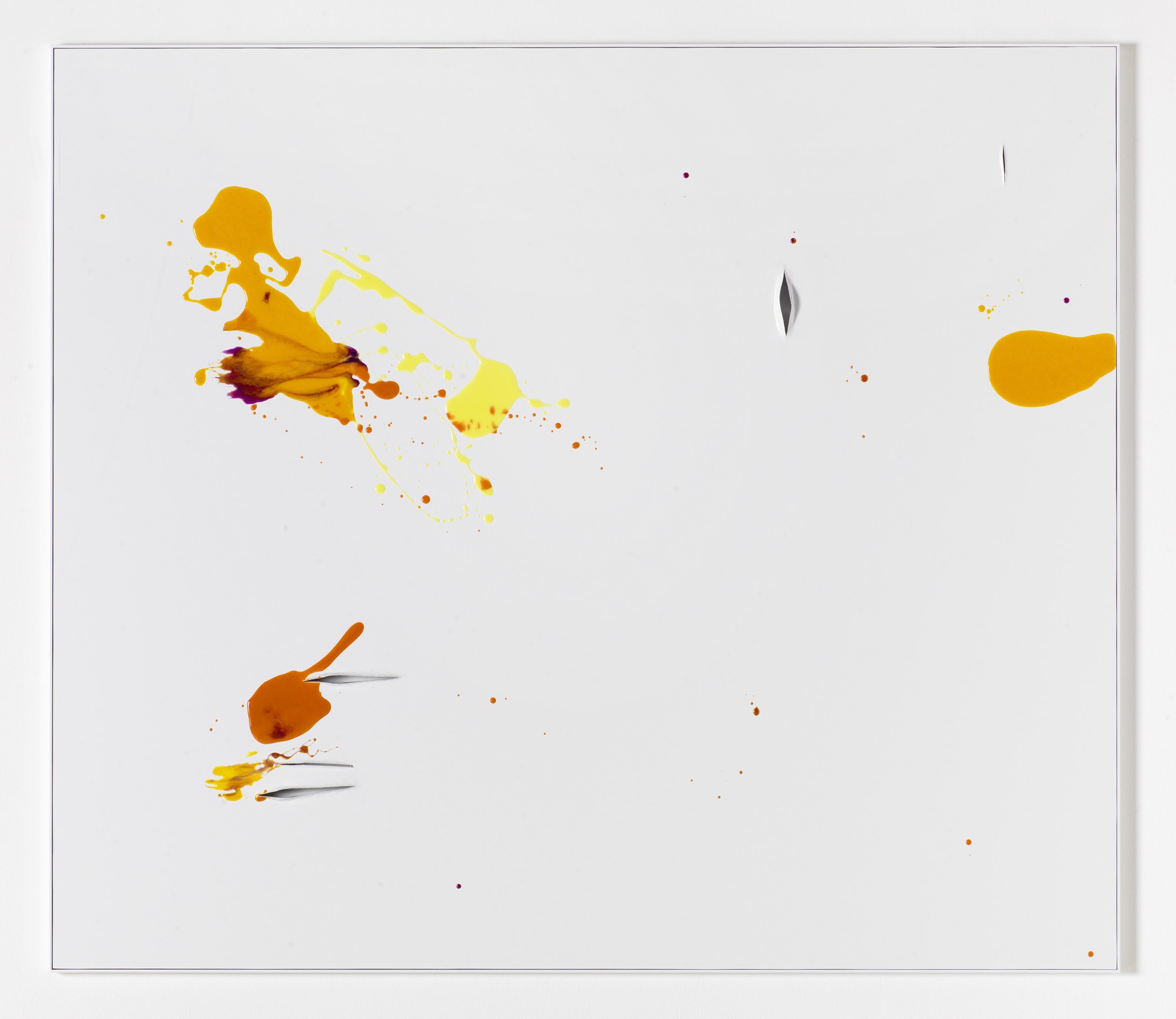 In contrast the Colour Aicmos, in which Heinzmann applies synthetic resins coloured with various pigments to the aluminium, adhere to a different concept: here we encounter luminous streaks of paint on a matt white surface partially run through with cuts, gaps and slits. The compositions seem unforced but never uncontrolled. They play with the imagination of the viewer, who is seduced by their materiality, modernity, directness and beauty.