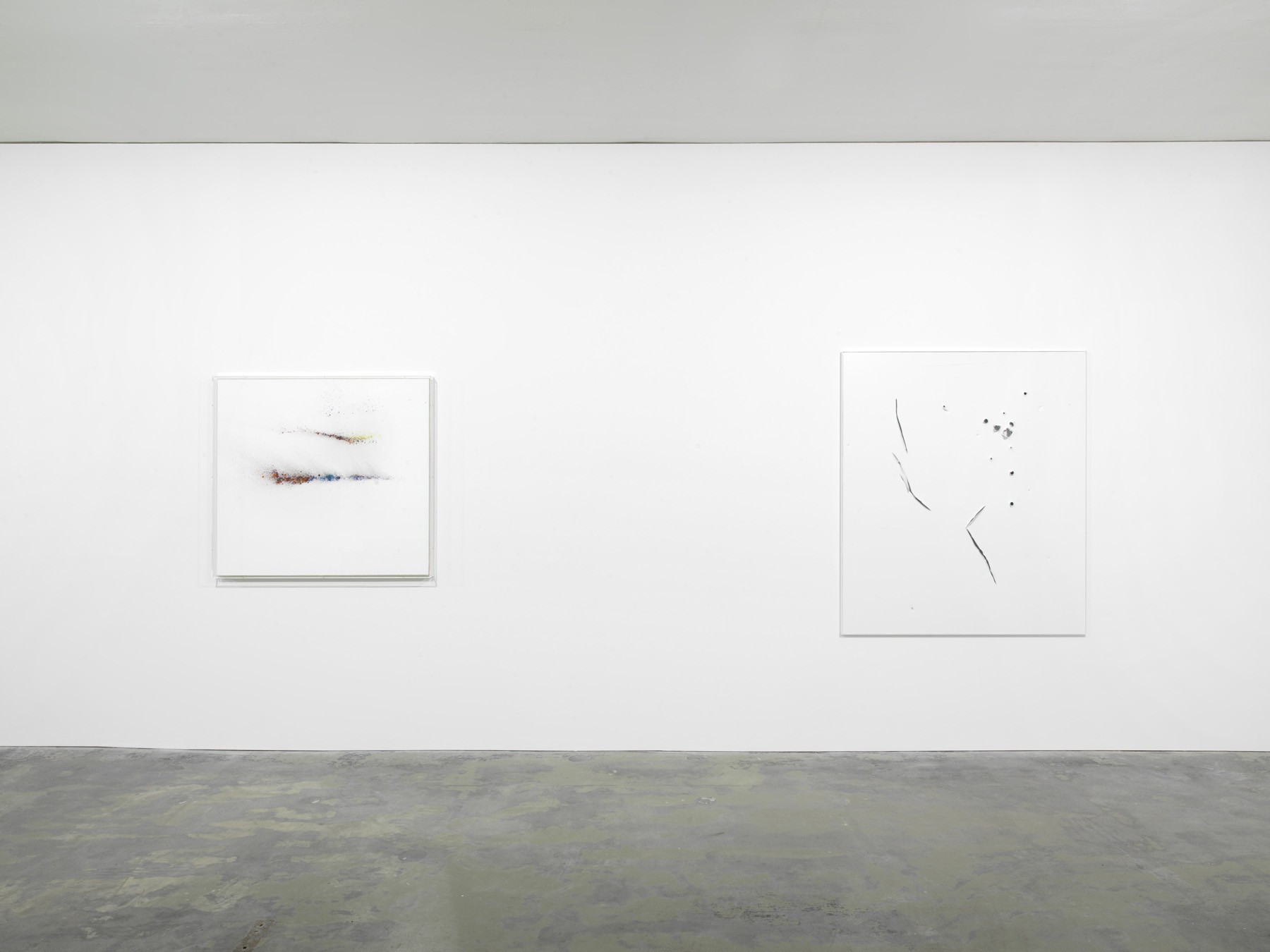 Within the exhibition the Pigmentbilder function as the framework for two further series – both of them on industrially produced, white-laminated aluminium honeycomb panels. These Aicmos and Colour Aicmos show gaps and openings, as in earlier works by Heinzmann. But with the difference that the Aicmos now have cuts of a different kind, including grooves, dents, scratches, gouges and hollows, giving the works a more direct visual language. The way in which time and tempo are inscribed here is not dissimilar in gesture to the painting process that culminated in the Pigmentbilder. Heinzmann succeeds in forcing the living painterly gesture into the artificiality of the industrial image carrier. The astonishing openness of these images is juxtaposed by the decisiveness of their composition. They immediately demand a position from the viewer.