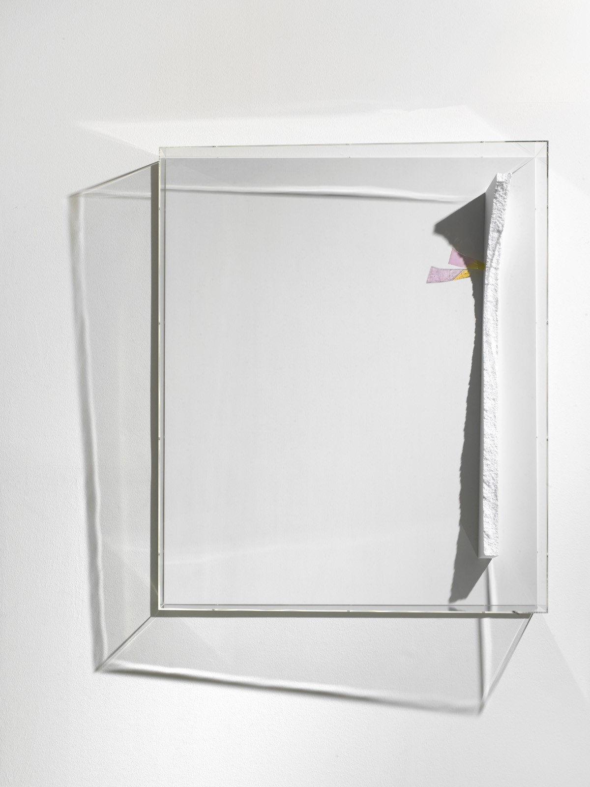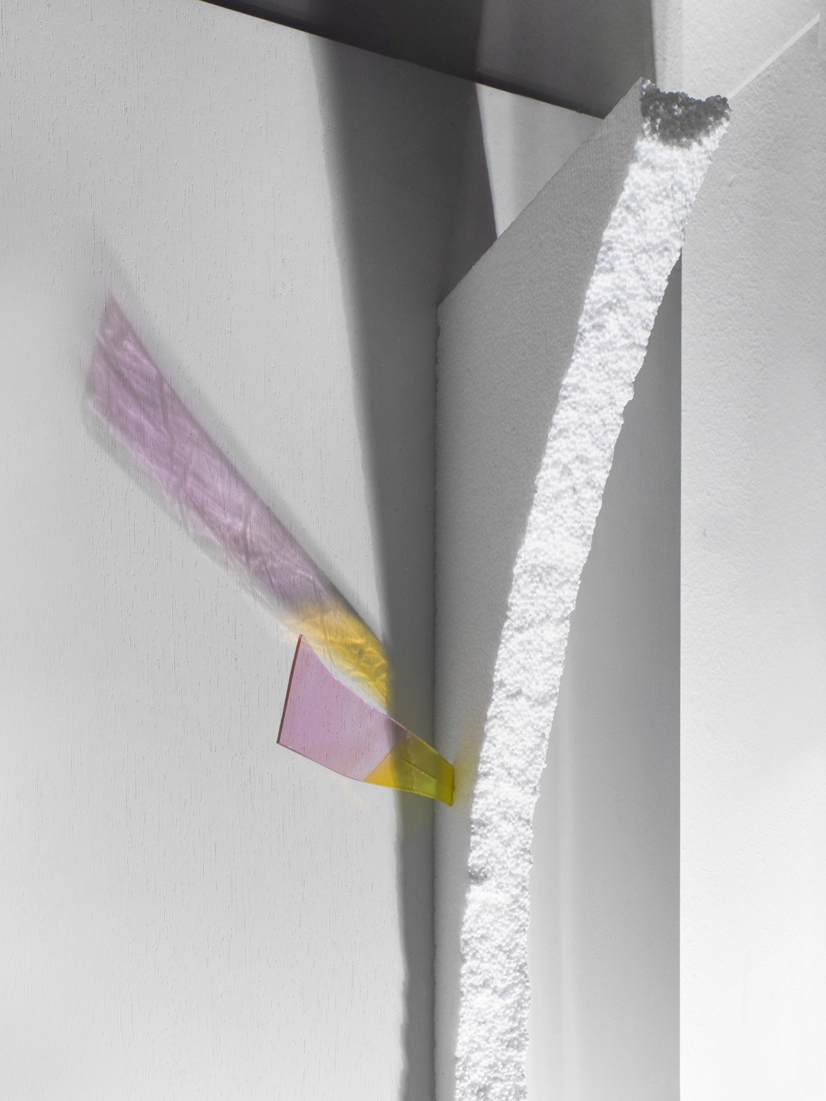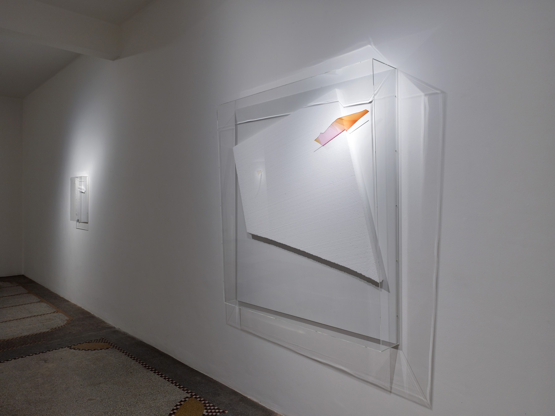 In “Wabel In My Walk,” his latest exhibition at dépendance, Thilo Heinzmann revisits a material he deployed in an earlier body of work: Styrofoam. With characteristic inquisitiveness, Heinzmann uses these careful arrangements of Styrofoam and colored glass to simultaneously vehicularize tactility and field-depth. Sheathed behind plexi glass as a means of protecting the momentum that literally arises from these paintings, their presentation is further enshrined in a compelling gesture that enunciates both the work’s delicacy and its monumentality. Heinzmann builds on his earlier oeuvre with the addition of asymmetric covers, which imbues these paintings with a velocity and finesse that effectively expands their presence in the space.