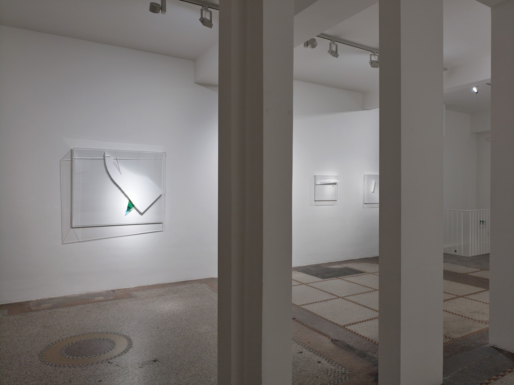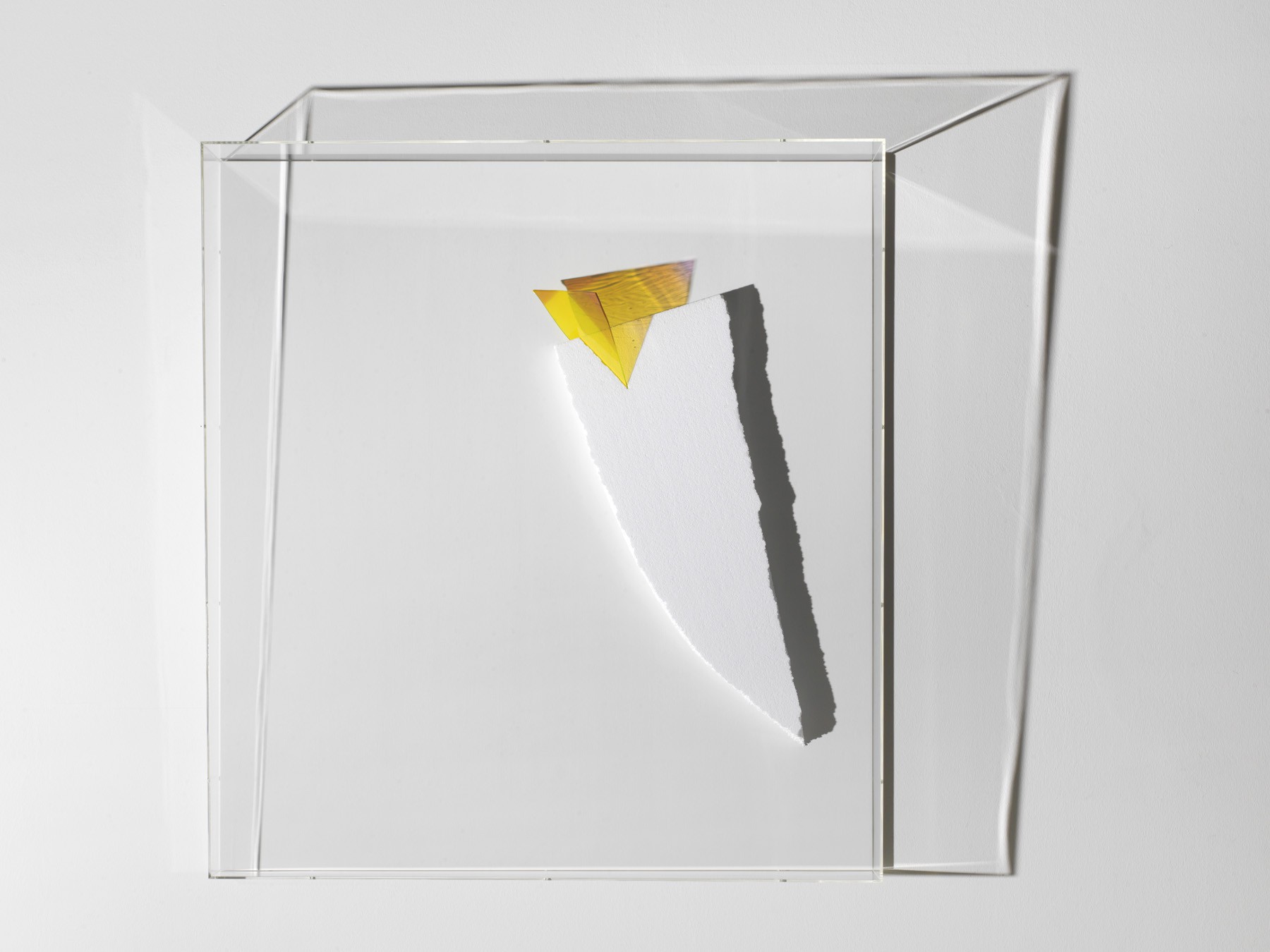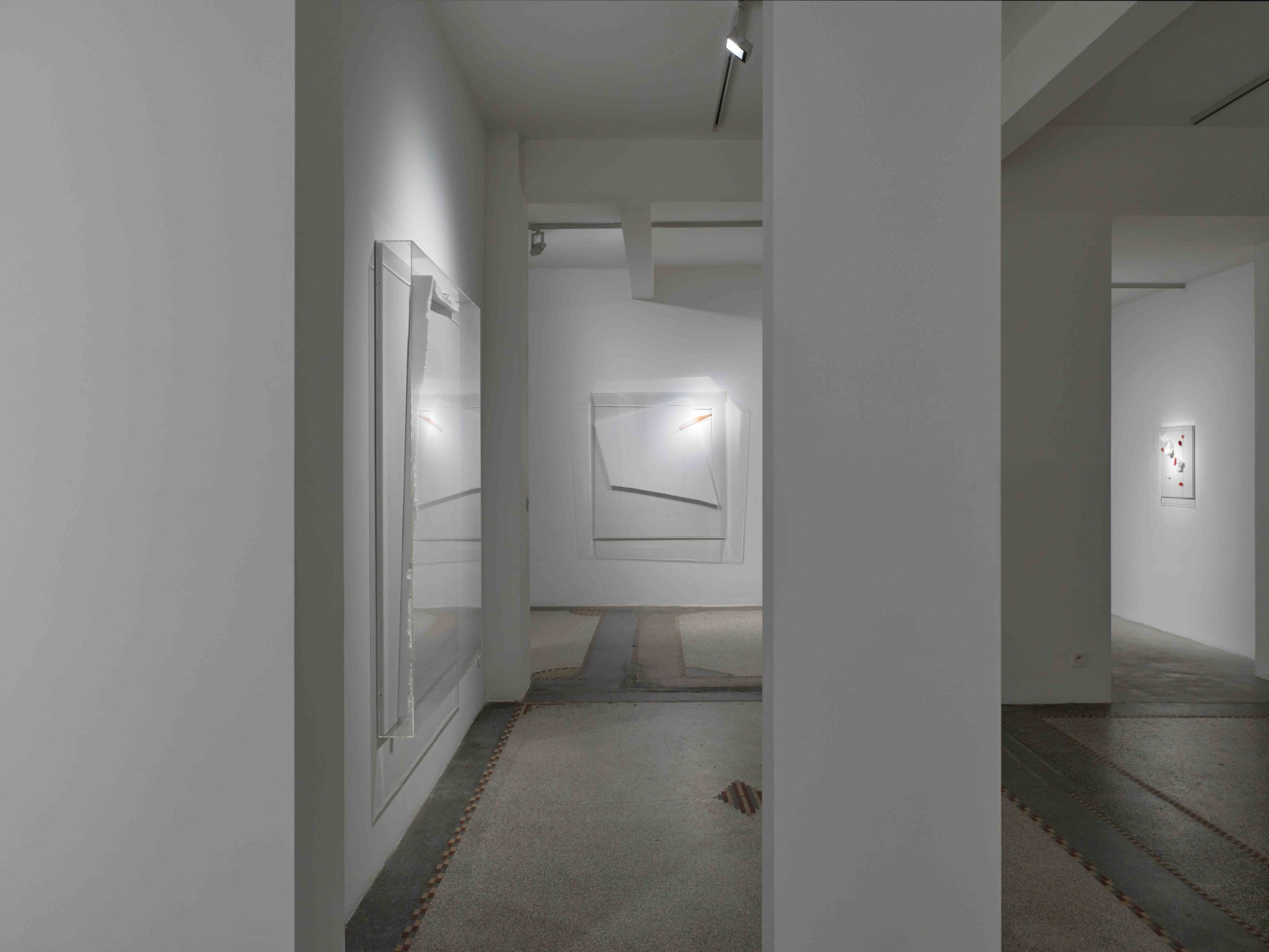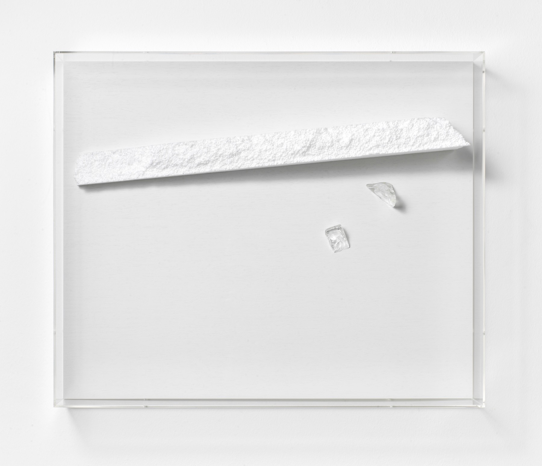 In “Wabel In My Walk,” his latest exhibition at dépendance, Thilo Heinzmann revisits a material he deployed in an earlier body of work: Styrofoam. With characteristic inquisitiveness, Heinzmann uses these careful arrangements of Styrofoam and colored glass to simultaneously vehicularize tactility and field-depth. Sheathed behind plexi glass as a means of protecting the momentum that literally arises from these paintings, their presentation is further enshrined in a compelling gesture that enunciates both the work’s delicacy and its monumentality. Heinzmann builds on his earlier oeuvre with the addition of asymmetric covers, which imbues these paintings with a velocity and finesse that effectively expands their presence in the space.