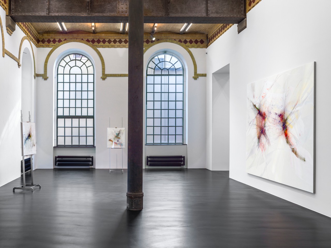 Set against and working in concert with their backgrounds, the pigments’ unmarred luminance interacts and enters dialogue with these bases - opaque coats that transform the canvas’ woven binaries into individuated, energetic picture planes. Heinzmann’s grounds stand as their own entities, drawing attention to painting’s literal and metaphorical foundation, while also providing stages for his pigments. The powdered bursts of hue are interspersed with particles of colored glass, which, along with both the position of a viewer and movement-evoking marks, create layered depth through the manipulation of light and its refraction. This play of light upon each O.T. work lends them an ever-shifting quality that emphasizes Heinzmann’s nonhierarchical treatment of each material and compositional element. Playing Slowies signifies a new exploration of scale for the artist. Presenting O.T. canvases of this monumental size for the first time, alongside an alternating selection of smaller paintings resting on free-standing, cantilevered easels designed by the artist, the exhibition and the works within it approach scale and substance as independent from, yet in conversation with one another rather than positioning them in direct relation: Their motifs respond to dimension, but do not derive from it.