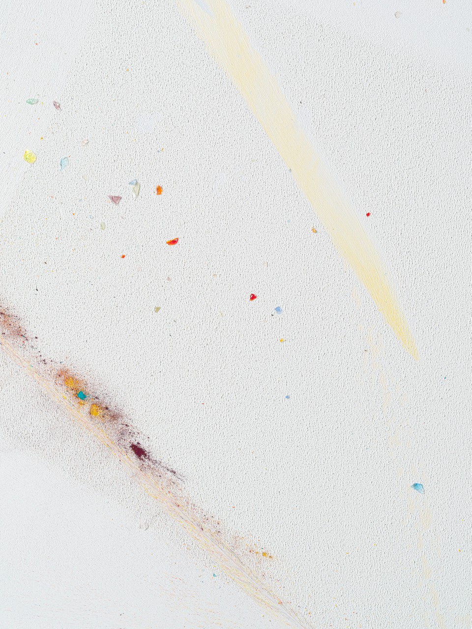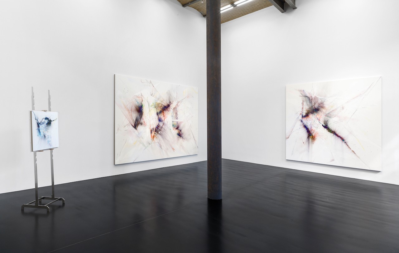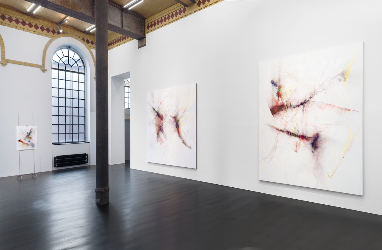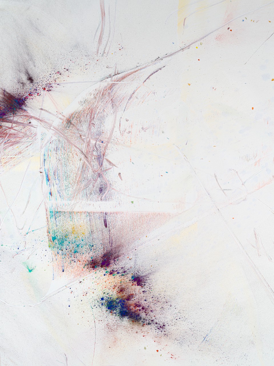 neugerriemschneider is pleased to present Thilo Heinzmann’s second exhibition with the gallery. On view in our Christinenstrasse space, Playing Slowies comprises a selection of new works that expand upon Heinzmann’s pigment paintings, exploring for the first time the correlation between outsized scale and methodology. Here, compositions feature unbound pigments in their powdered form and fragments of glass as they dash across textured fields in gestures that are at once meticulously calculated and inevitably subject to chance. Singular in their approach to mark making and unique navigation of proportion, they are collections of light, speed, motion and energy, that capture these aspects as they amalgamate to shape new modes of conceptualizing pictorial space.