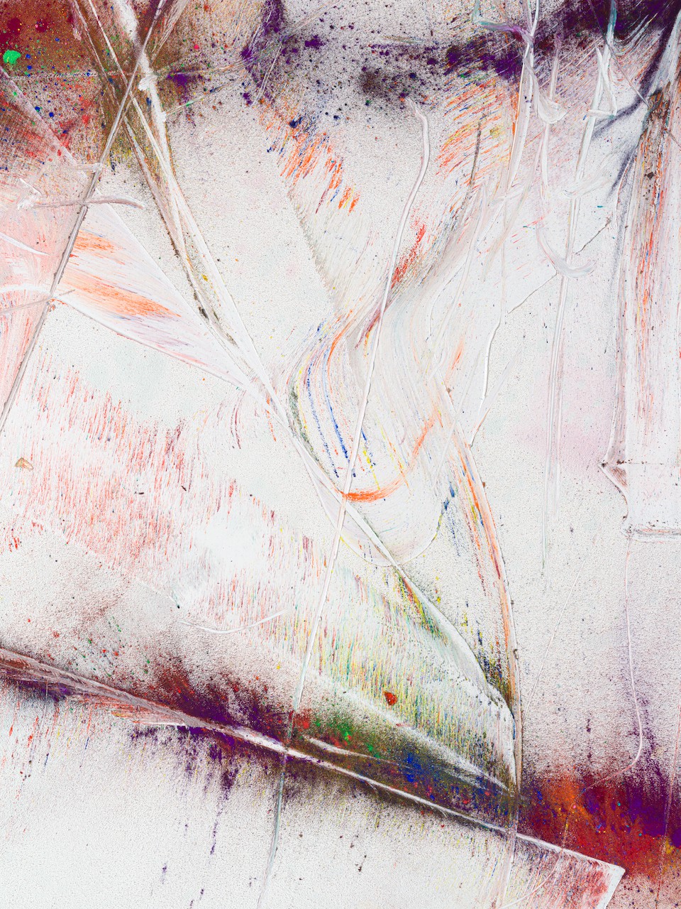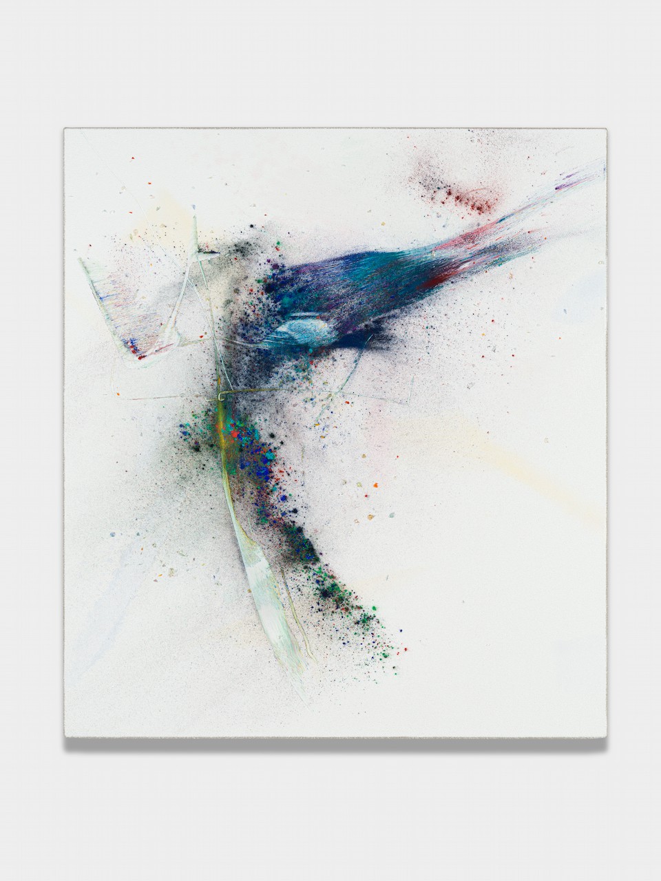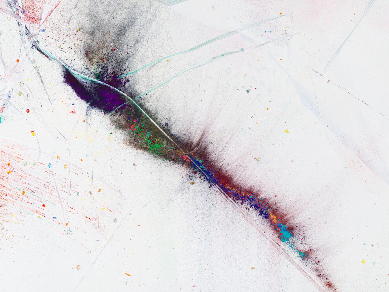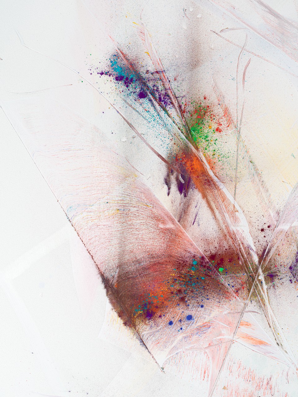 neugerriemschneider is pleased to present Thilo Heinzmann’s second exhibition with the gallery. On view in our Christinenstrasse space, Playing Slowies comprises a selection of new works that expand upon Heinzmann’s pigment paintings, exploring for the first time the correlation between outsized scale and methodology. Here, compositions feature unbound pigments in their powdered form and fragments of glass as they dash across textured fields in gestures that are at once meticulously calculated and inevitably subject to chance. Singular in their approach to mark making and unique navigation of proportion, they are collections of light, speed, motion and energy, that capture these aspects as they amalgamate to shape new modes of conceptualizing pictorial space.