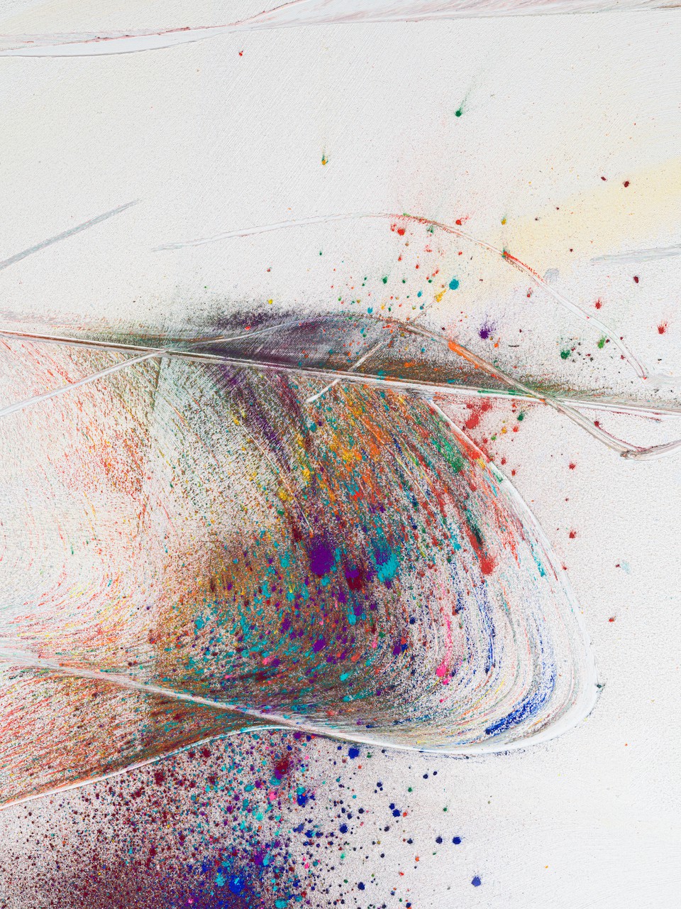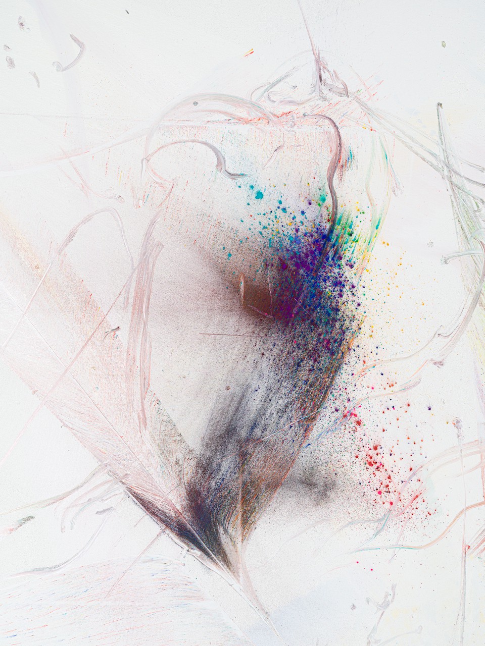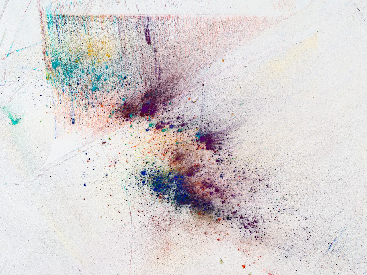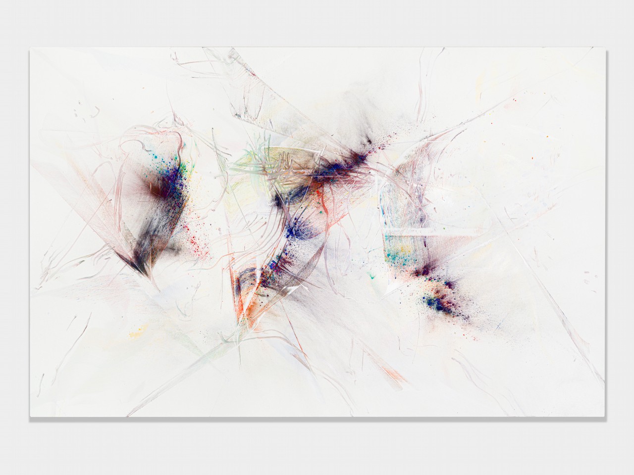 neugerriemschneider is pleased to present Thilo Heinzmann’s second exhibition with the gallery. On view in our Christinenstrasse space, Playing Slowies comprises a selection of new works that expand upon Heinzmann’s pigment paintings, exploring for the first time the correlation between outsized scale and methodology. Here, compositions feature unbound pigments in their powdered form and fragments of glass as they dash across textured fields in gestures that are at once meticulously calculated and inevitably subject to chance. Singular in their approach to mark making and unique navigation of proportion, they are collections of light, speed, motion and energy, that capture these aspects as they amalgamate to shape new modes of conceptualizing pictorial space.
