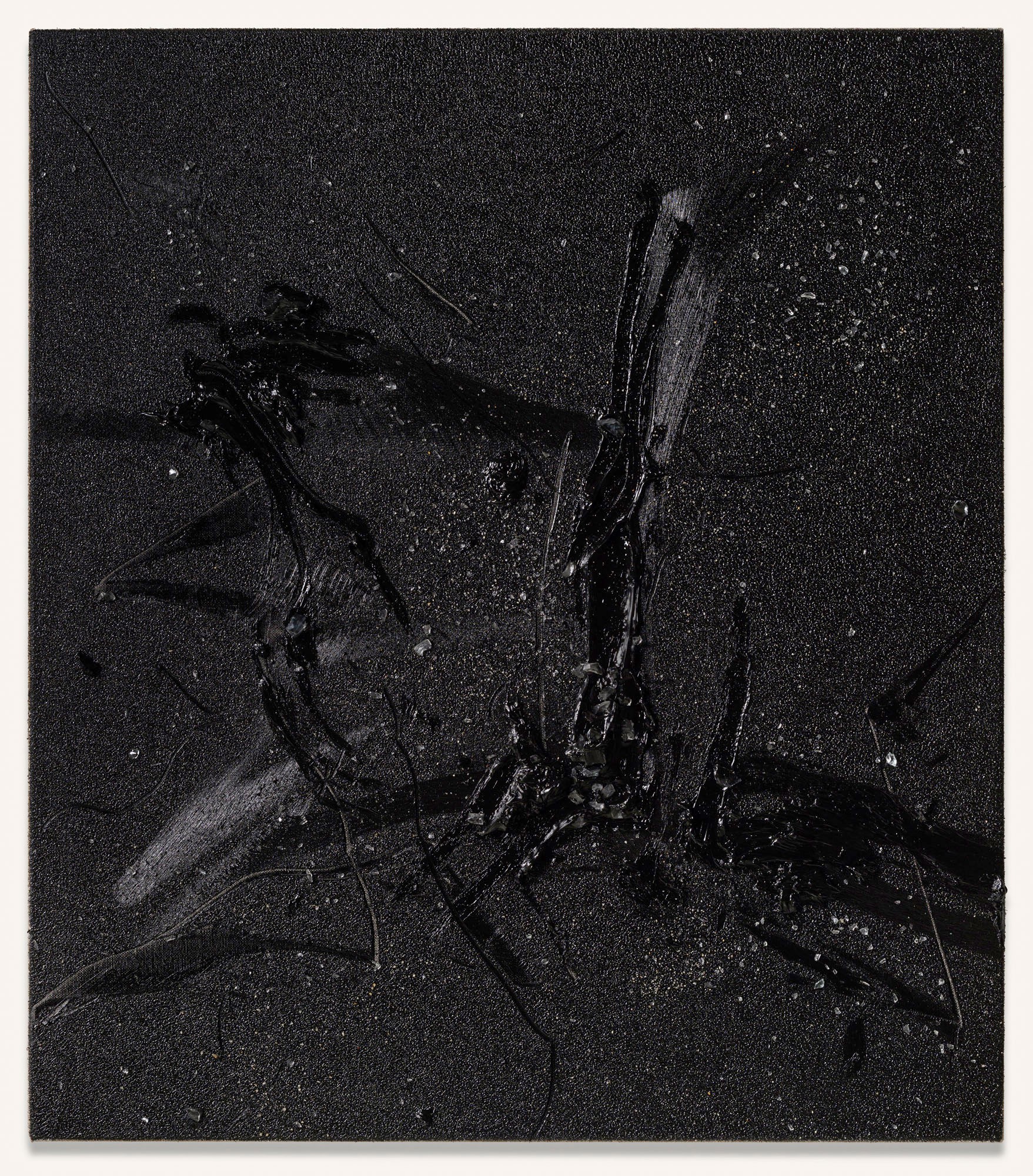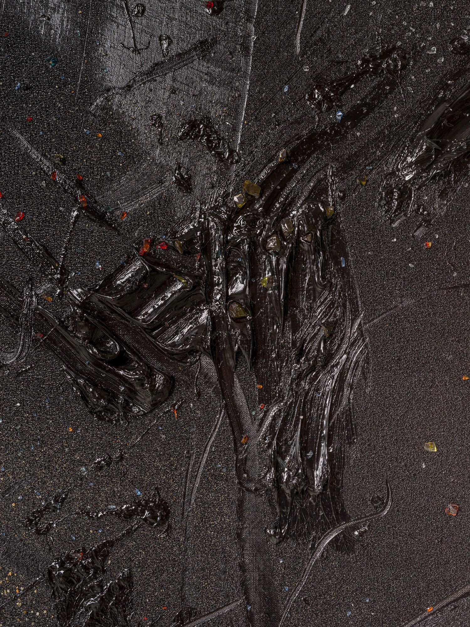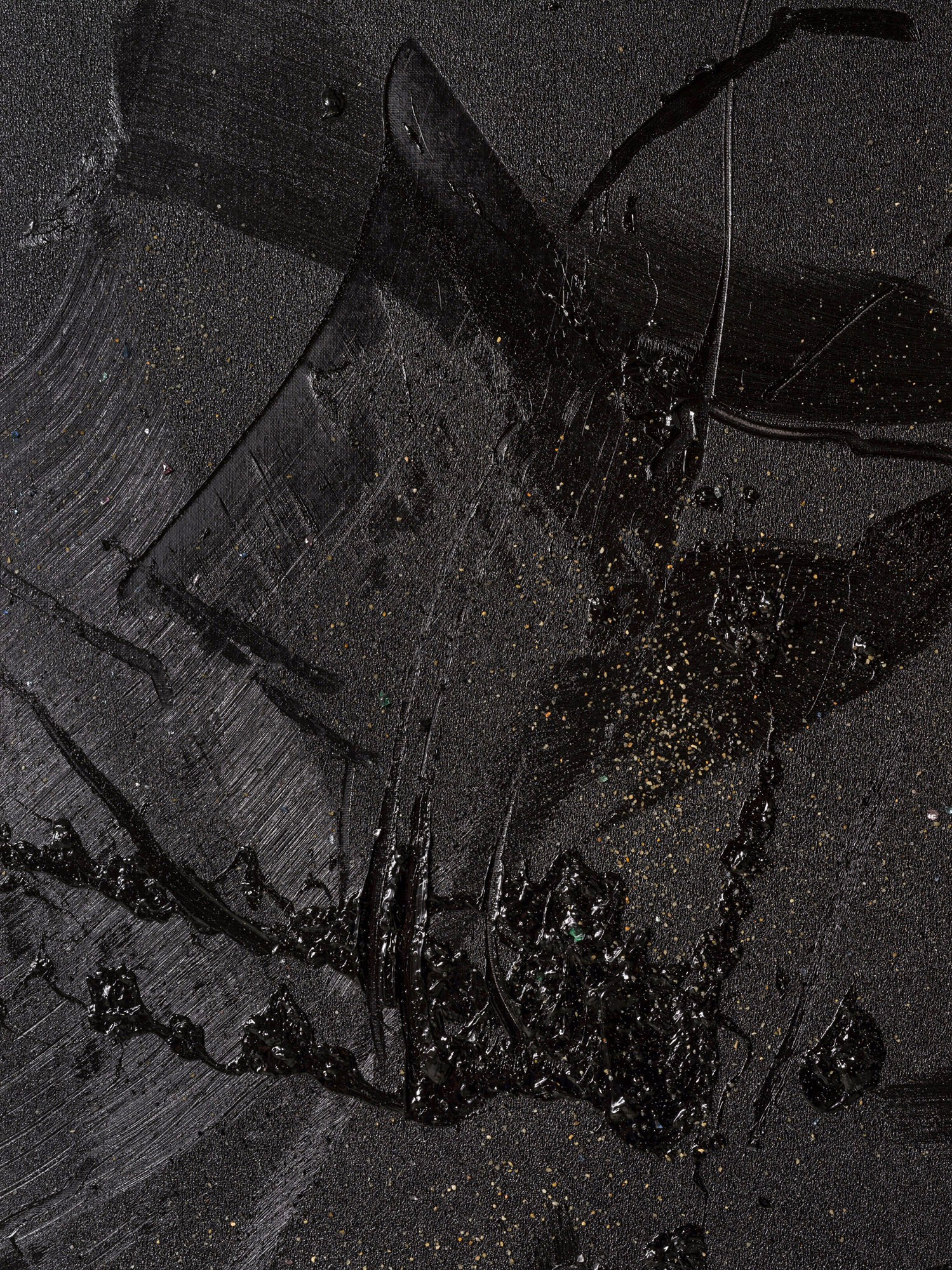 The Tacmo paintings, Tacmo standing for speed or velocity, are black paintings made from thick layers of paint through which Heinzmann drags his fingers, making negative imprints. In contrast to the pigment paintings where elements are added, here we see form emerging through the taking away of matter but we also see how close those two things are, in a way.