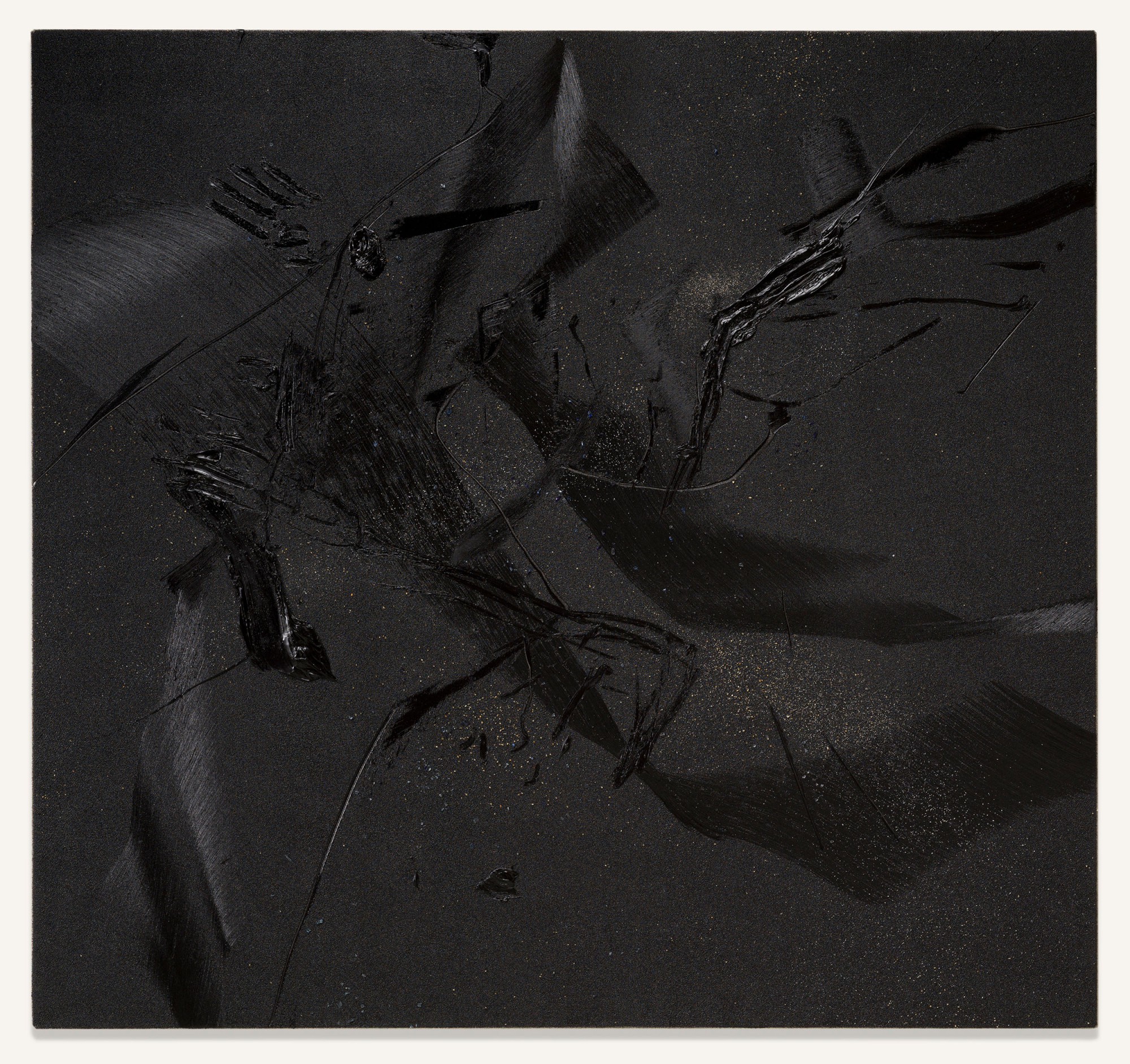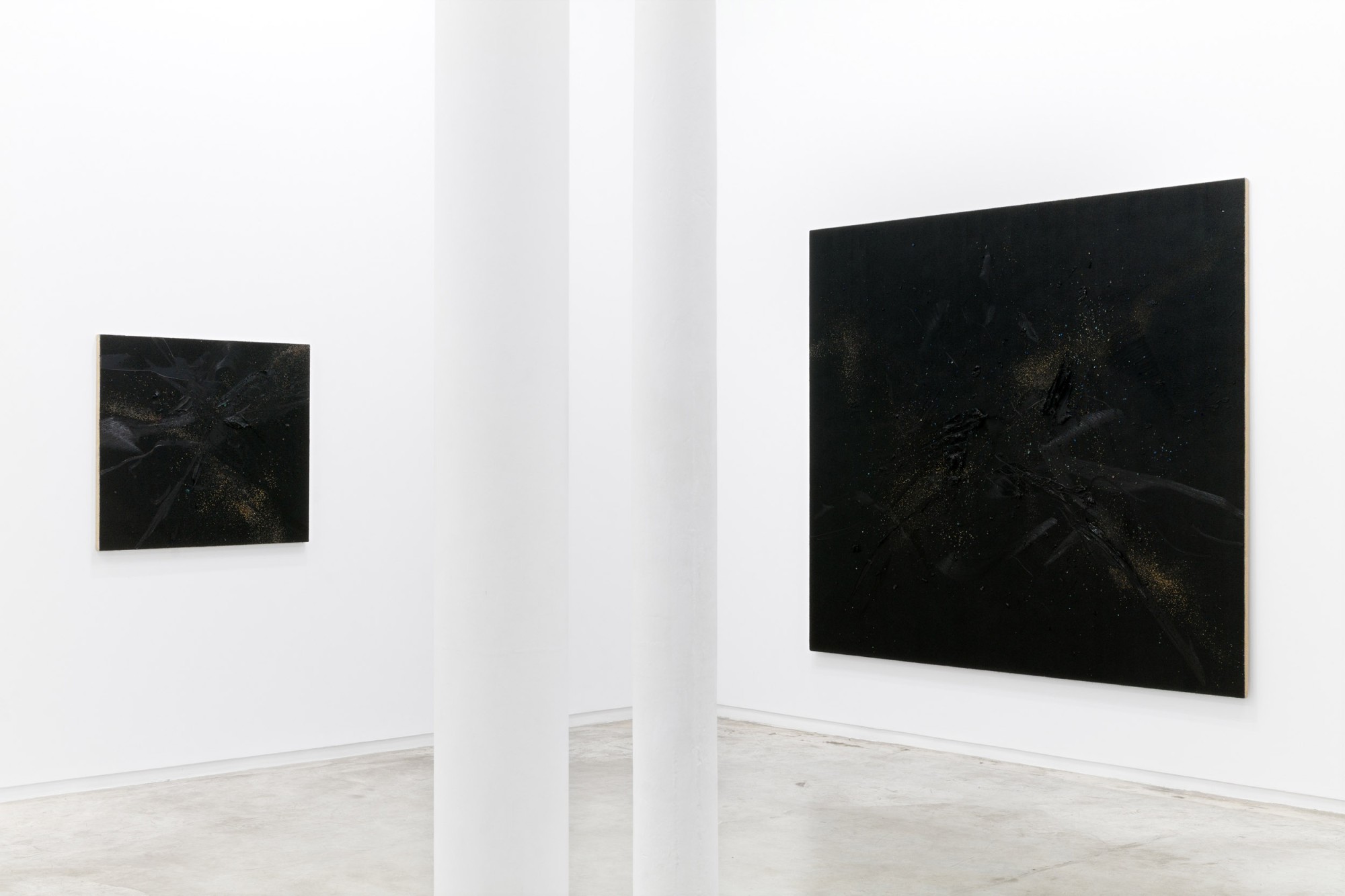Yet, and in relation to the other type of works on display, in those belonging to his series of pigment paintings, the idea of material and temporal unity responds to the use of a pigment that is not so much applied as transposed. In these works, especially in those included in this exhibition, which are much more restrained in terms of gesture, colour, and expressiveness, the multiple material particles use their internal and specific vibrations to construct constellations suspended in time, seeming to echo something long since past. Each tiny element incorporated into the surface – the pigment particles (mineral and metallic), the fragments of coloured glass, the combinations of wet and dry materials,